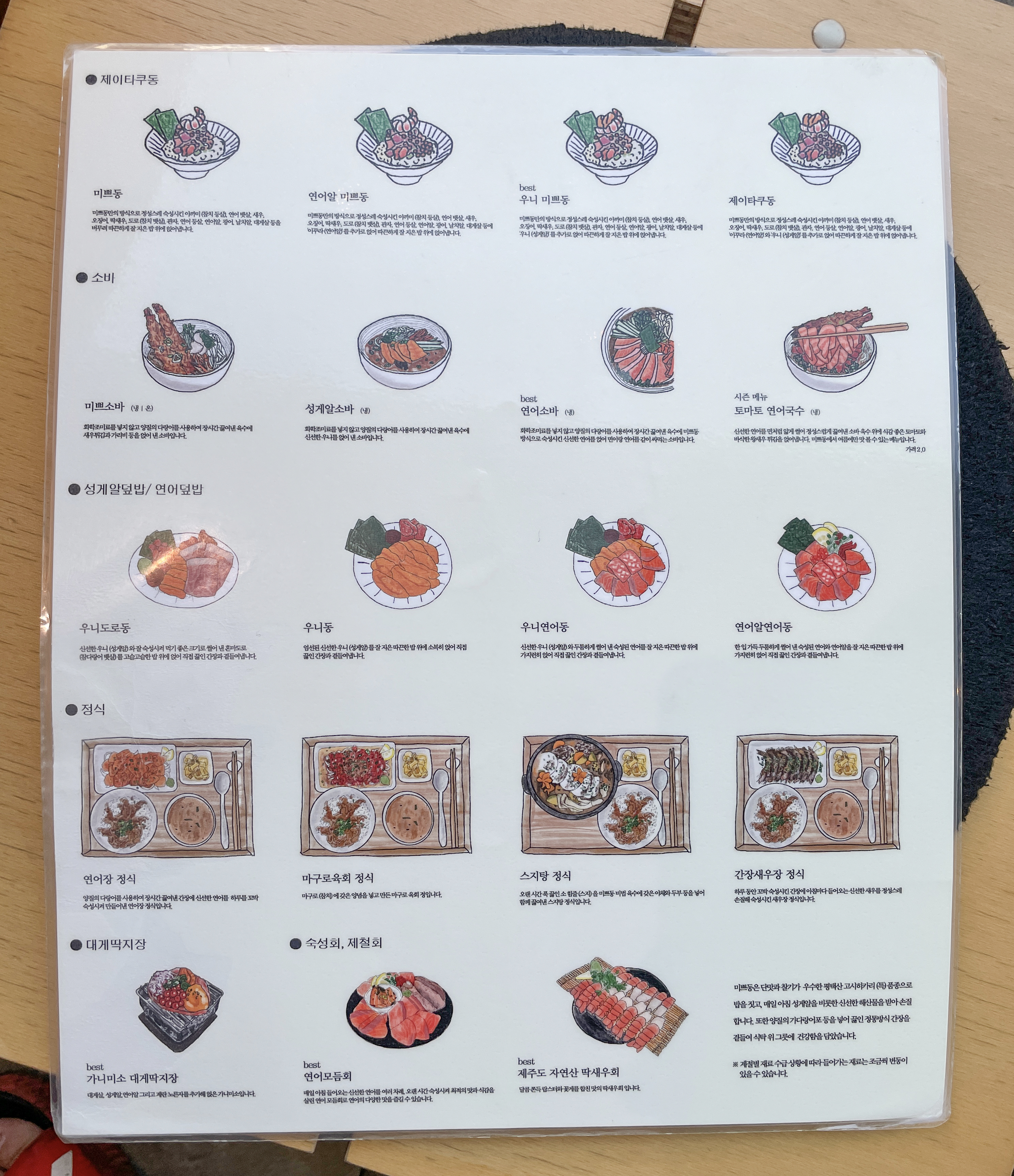 메뉴의 구성은 제이타쿠동/소바/성게알덮밥・연어덮밥/정식/대게딱지장/숙성회・제철회 등이 있었습니다. 메뉴판은 그림과 함께 메뉴에 대한 설명이 추가되어 있어서 주문하기 편리했습니다. 저희는 '우니미쁘동'과 '연어알미쁘동' 그리고 인스타그램 이벤트로 받은 '우니크림고로케'를 먹었습니다.