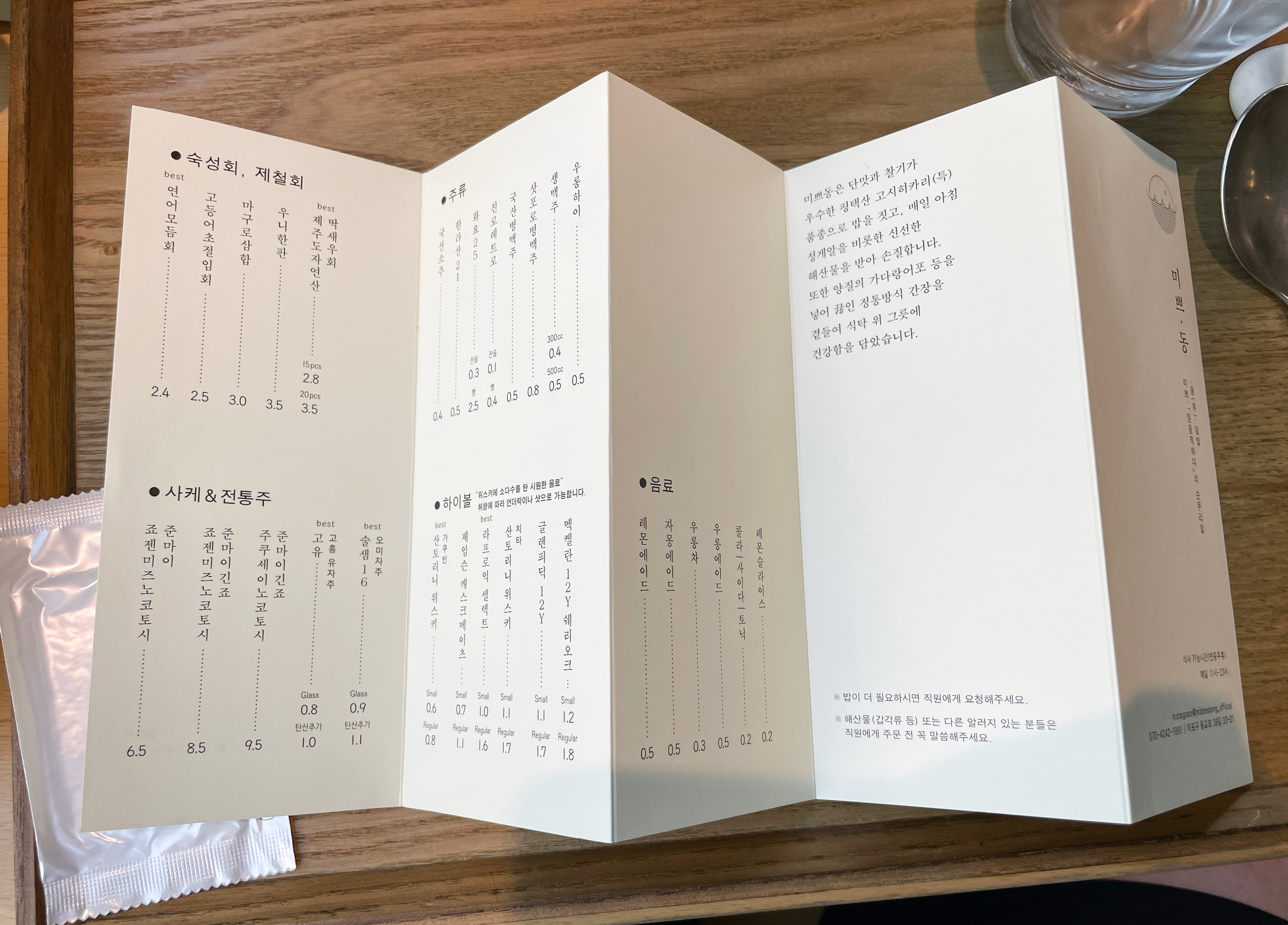 저는 인근 노상 주차장에 주차를 마친 뒤 미쁘동으로 들어갔습니다. 가게의 크기는 협소한 편인데 나름 배치를 잘해서 여럿이서 식사할 수 있는 공간이었습니다. 자리를 잡고 메뉴를 살펴보았습니다.