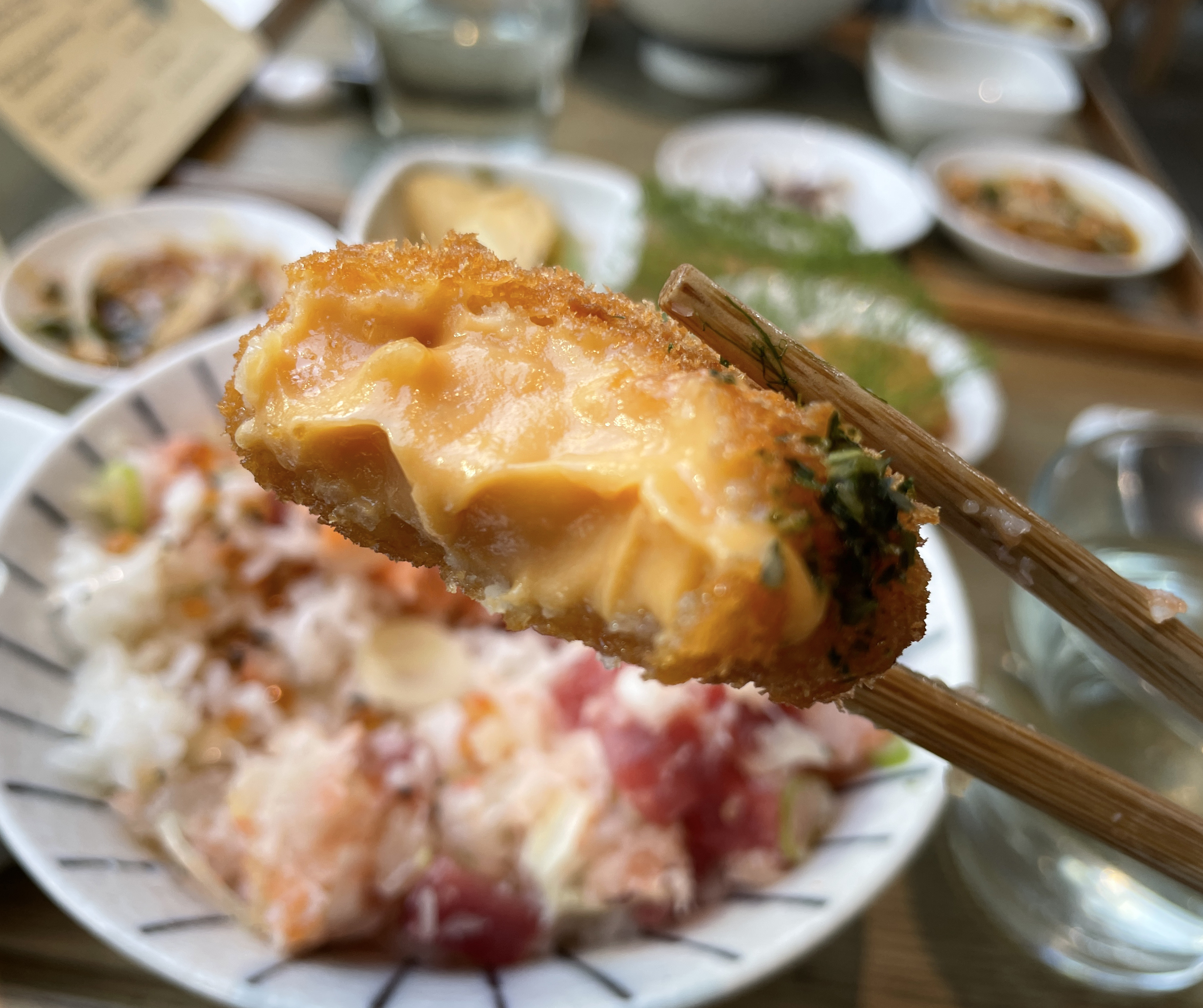 각각의 메뉴에는 반찬으로 아귀 간과 양배추피클, 꼬시래기 무침도 나왔습니다. 아귀 간은 맛에 대해 별로 기대를 안 했는데, 생각보다 맛이 좋았습니다. 생선조림 비슷한 느낌이랄까요? 우니크림고로케는 부드러운 식감이 일품이었습니다. 입 안에서 녹아내리는 성게알크림 고로케는 간도 세지 않고 맛있어서 인스타그램 이벤트에 참여하길 잘했다고 생각이 들더라고요.