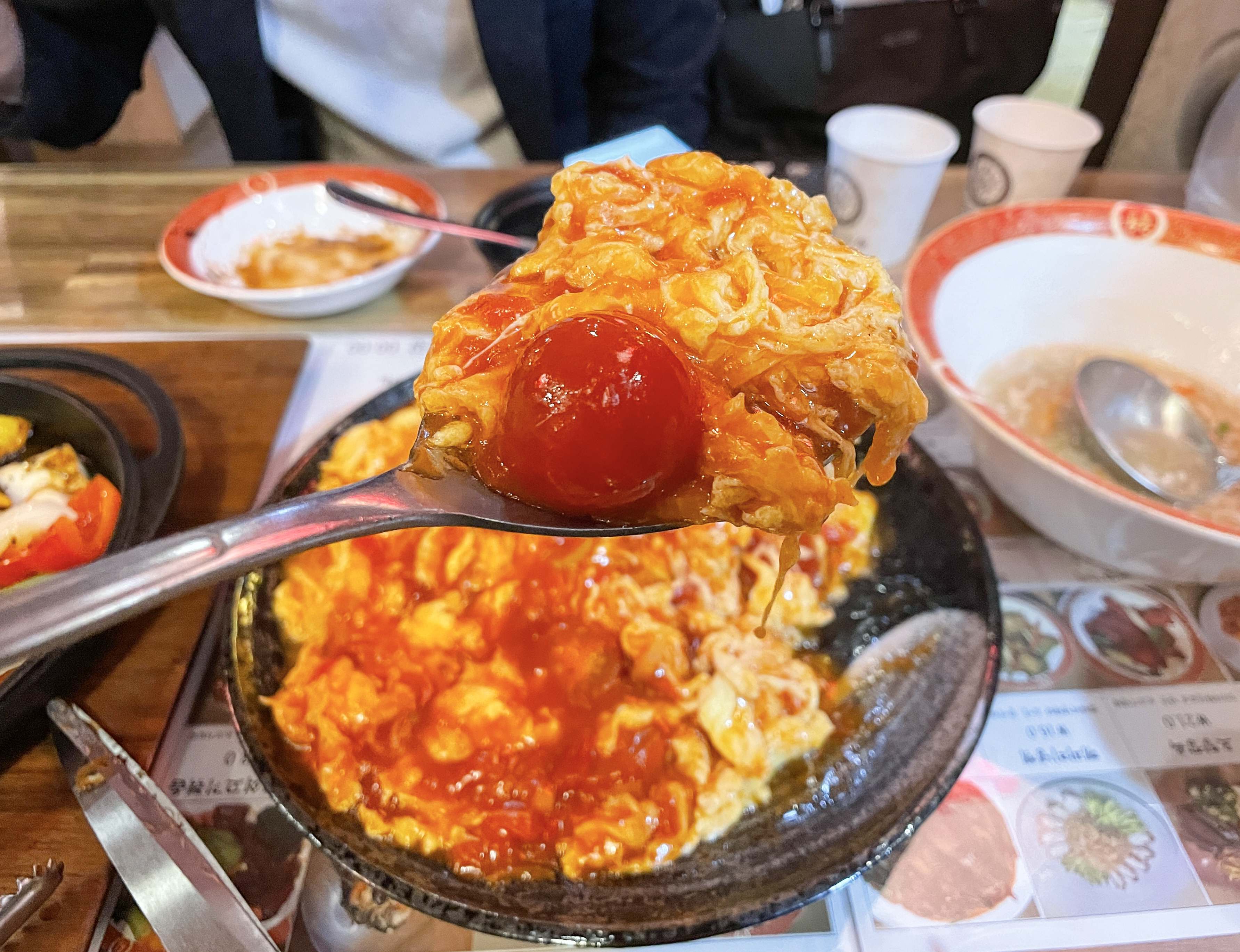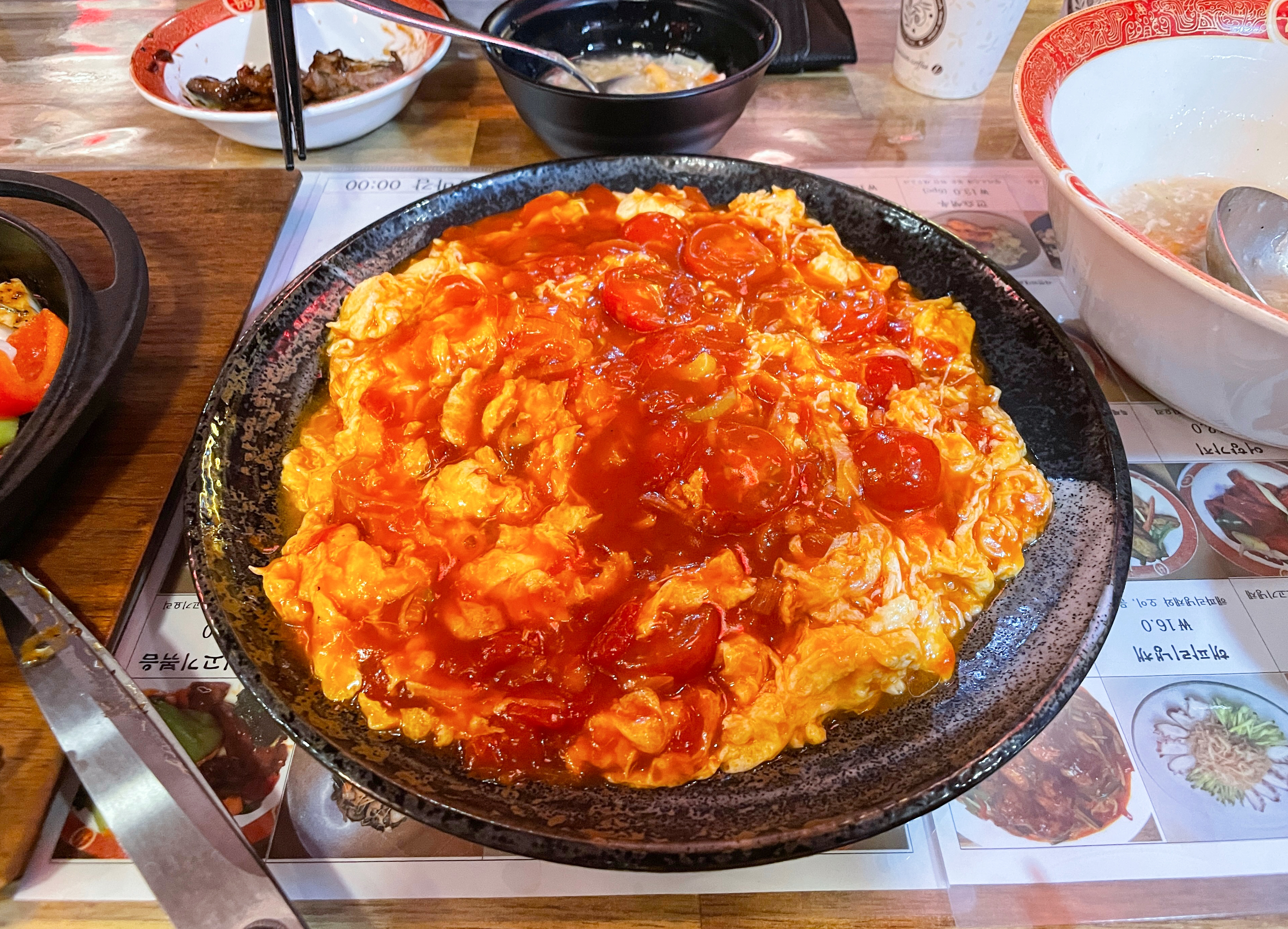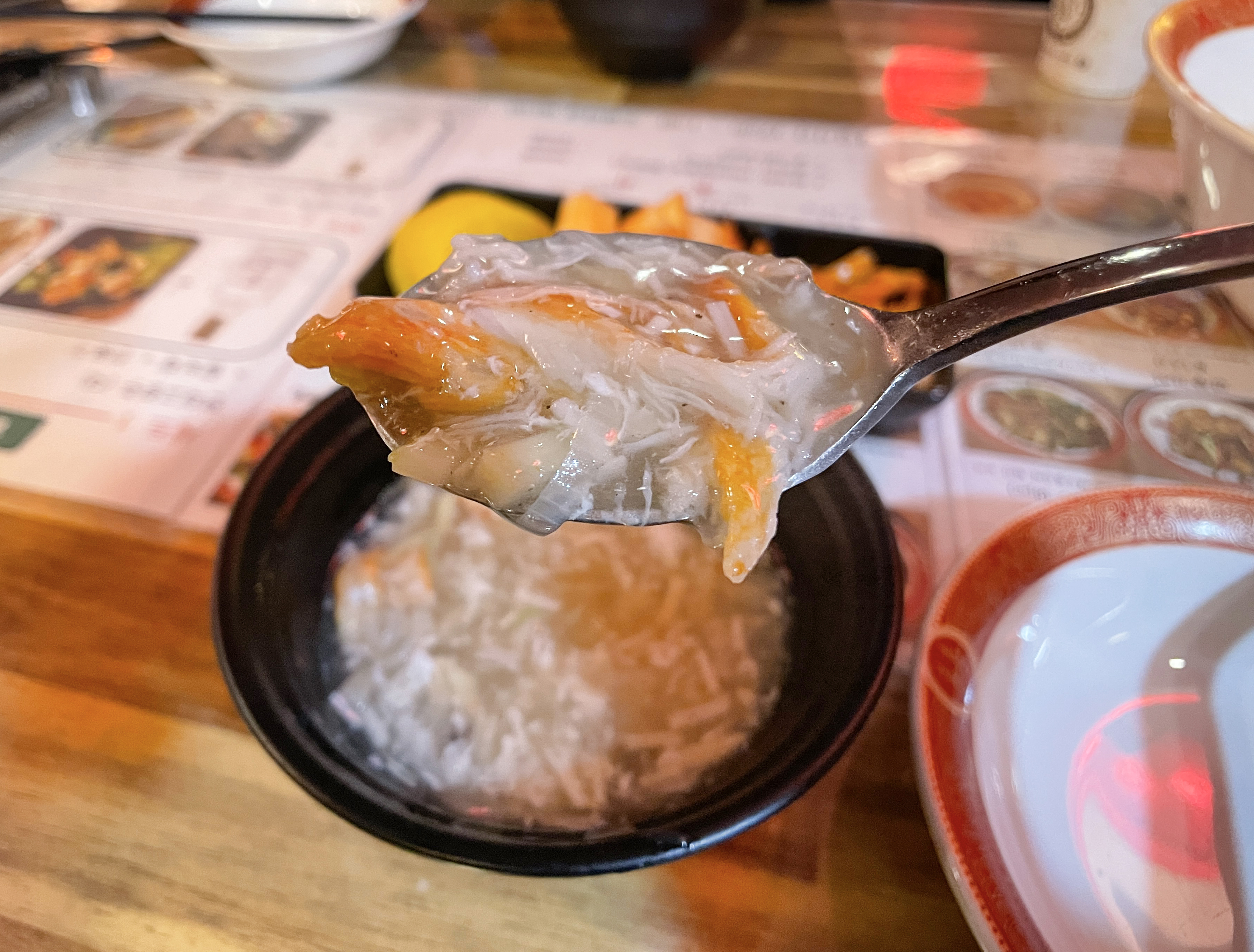 토마토계란볶음은 계란과 방울토마토를 볶은 요리였는데, 새콤한 토마토와 부드러운 계란의 조합이 신선한 메뉴였습니다. 개인적으로 저는 게살스프가 더 입맛에 맞더라고요. 뭔가 토마토계란볶음은 평소 먹을 일이 없어서 그런지 이질적인 느낌이었습니다.