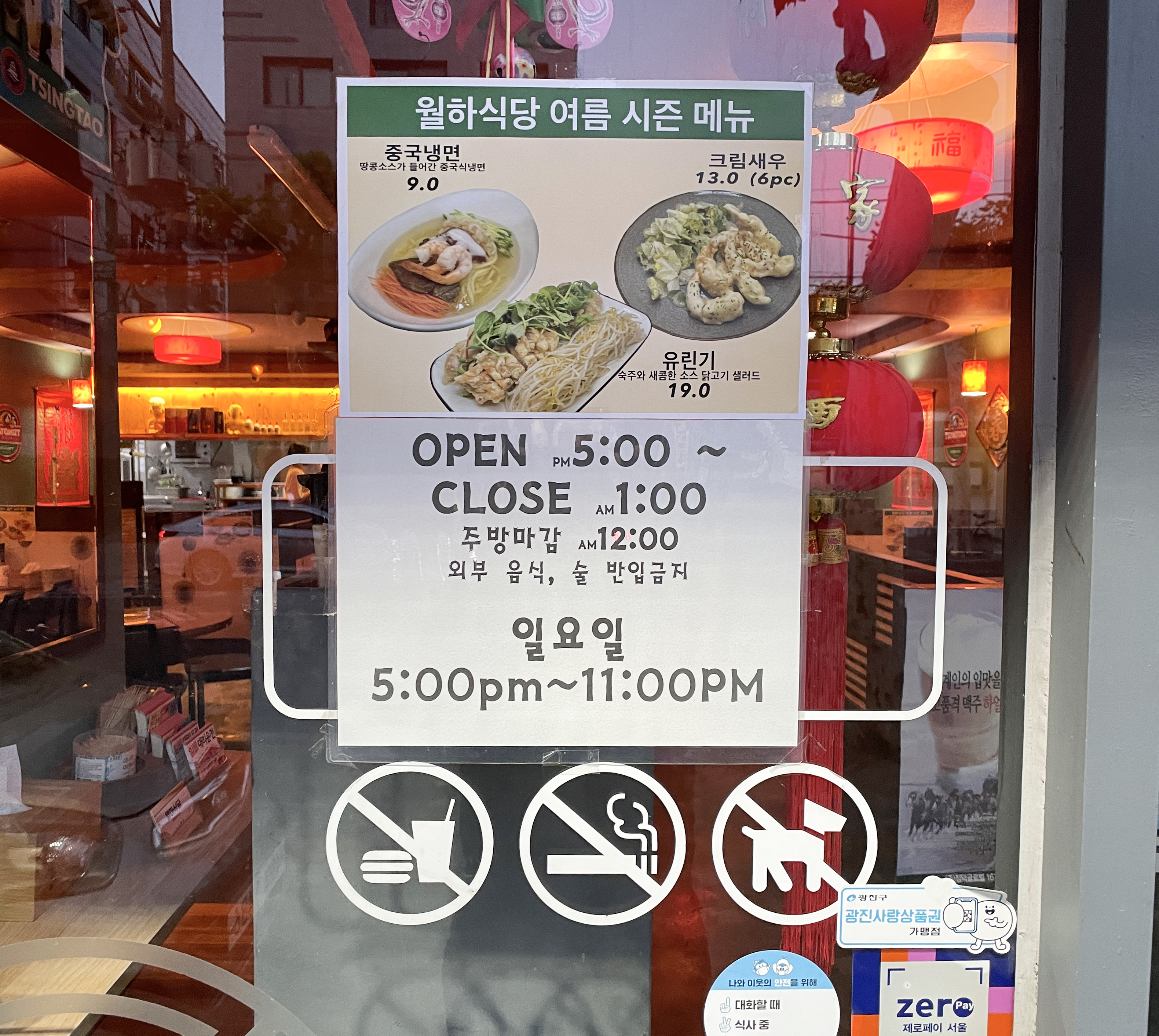 광진구 구의역 인근 월하식당의 모습은 이렇습니다. 가게 앞 주차공간이 없어 차량 이용은 불편할 수 있습니다. 다행히 사장님께 양해를 구하고 가게 앞에 주차를 하고 식사하러 가게에 들어갔습니다. 가게의 영업시간은 17:00~01:00 까지였으며, 주방 마감은 24:00 까지라고 합니다. 이용에 참고하시기 바랍니다.