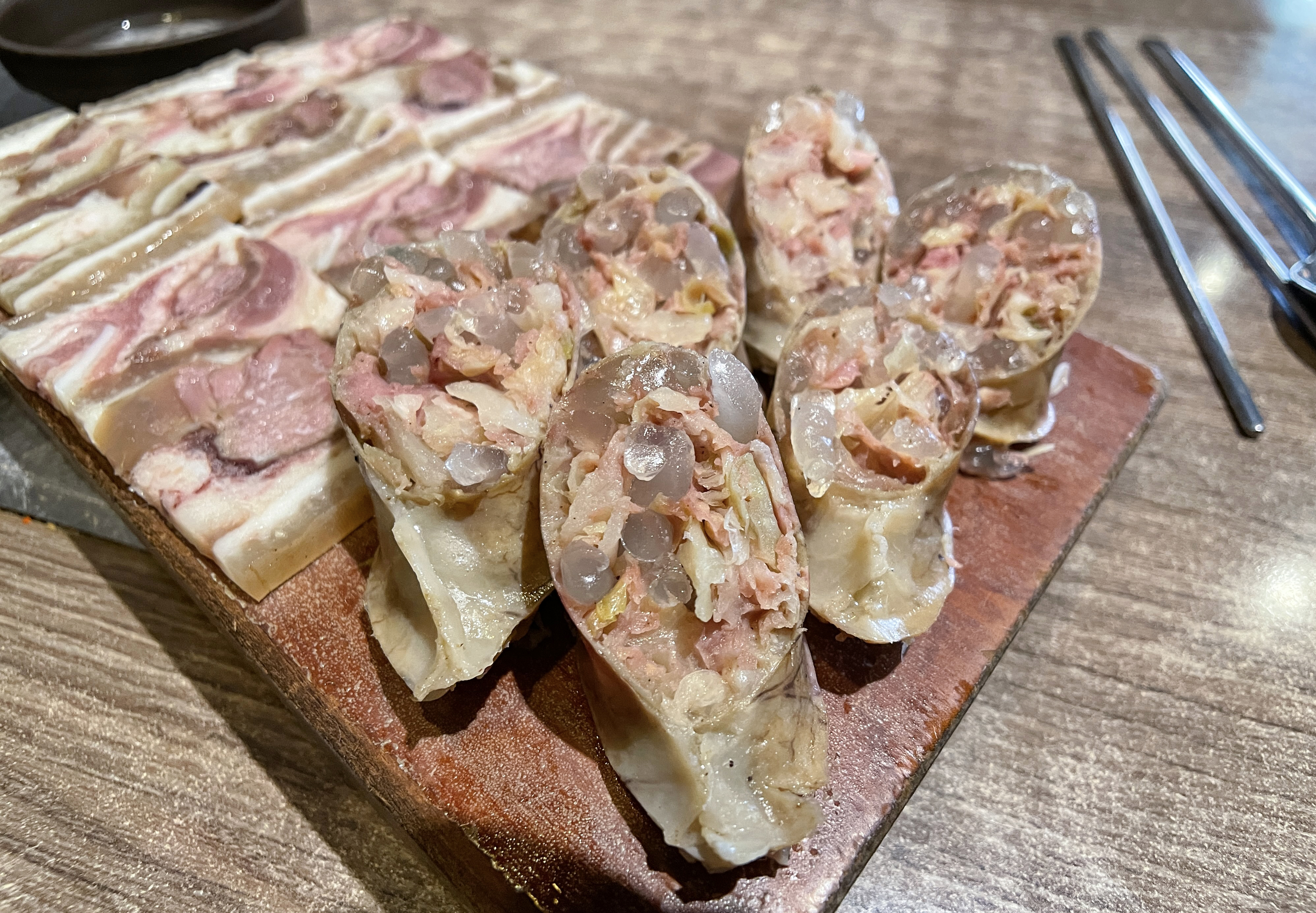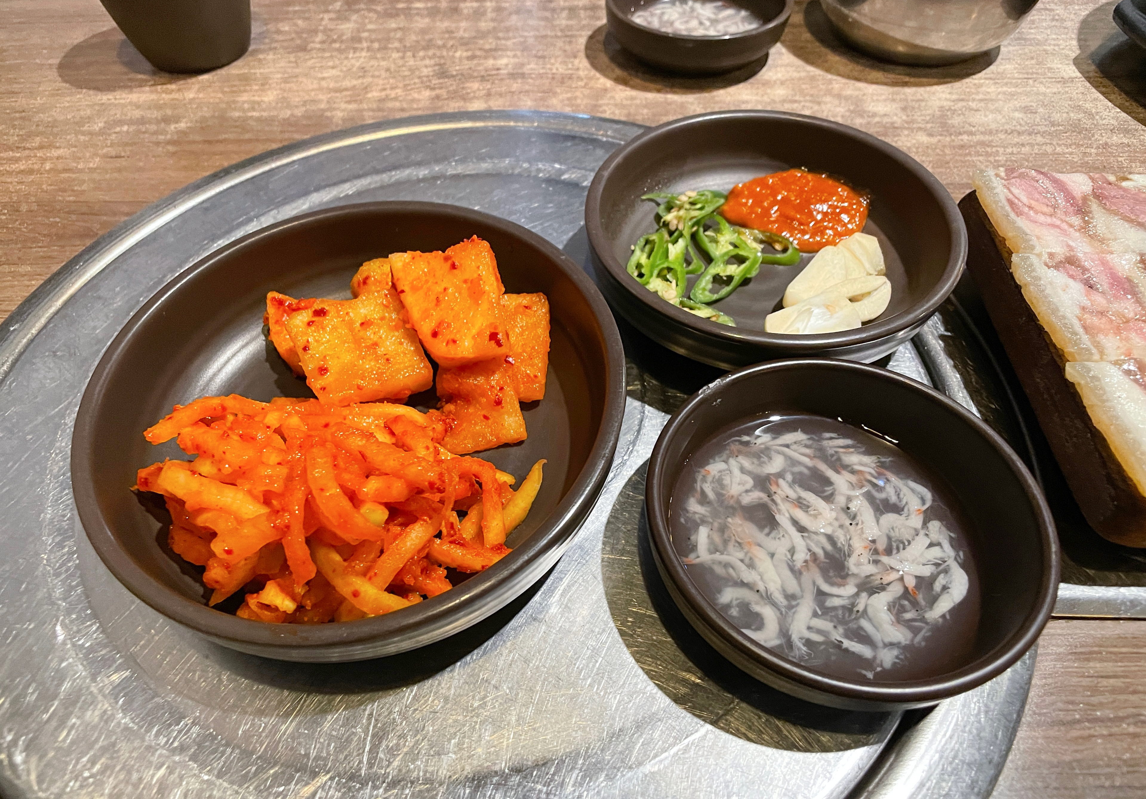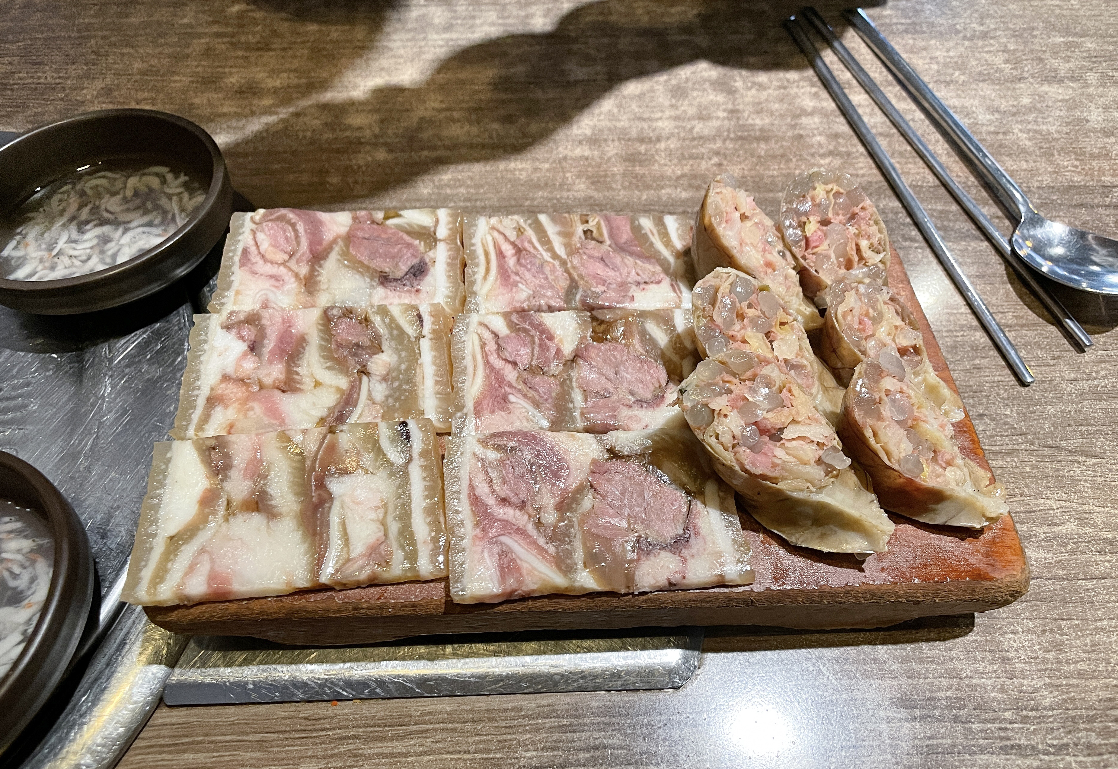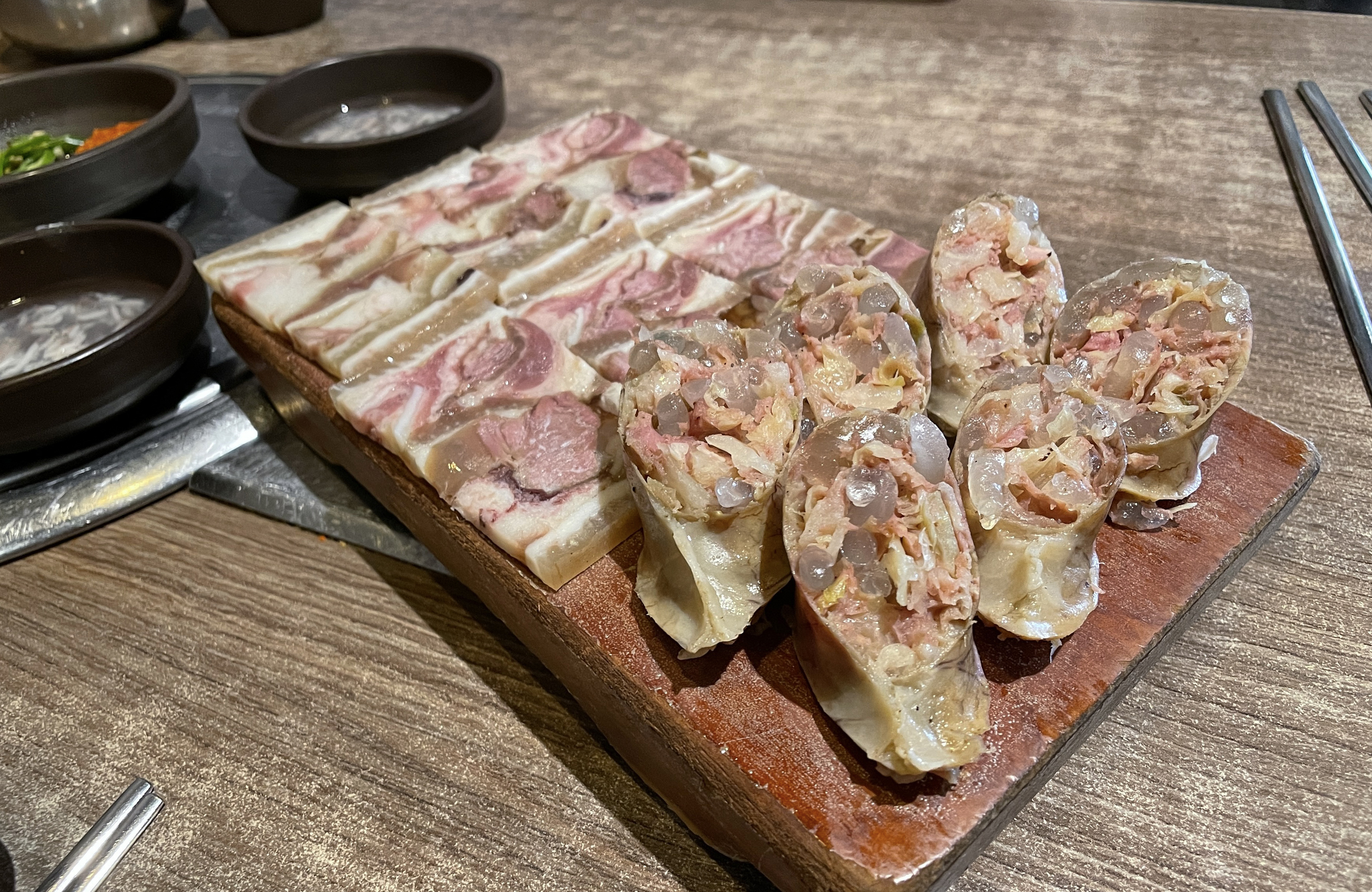 담소소사골순대국 정식 메뉴에는 순대와 편육이 함께 제공되었습니다. 반찬은 무김치와 무채가 나왔고 편육을 찍어먹을 수 있게 새우젓과 순대국에 곁들일 마늘, 청양고추 등이 같이 나왔습니다.