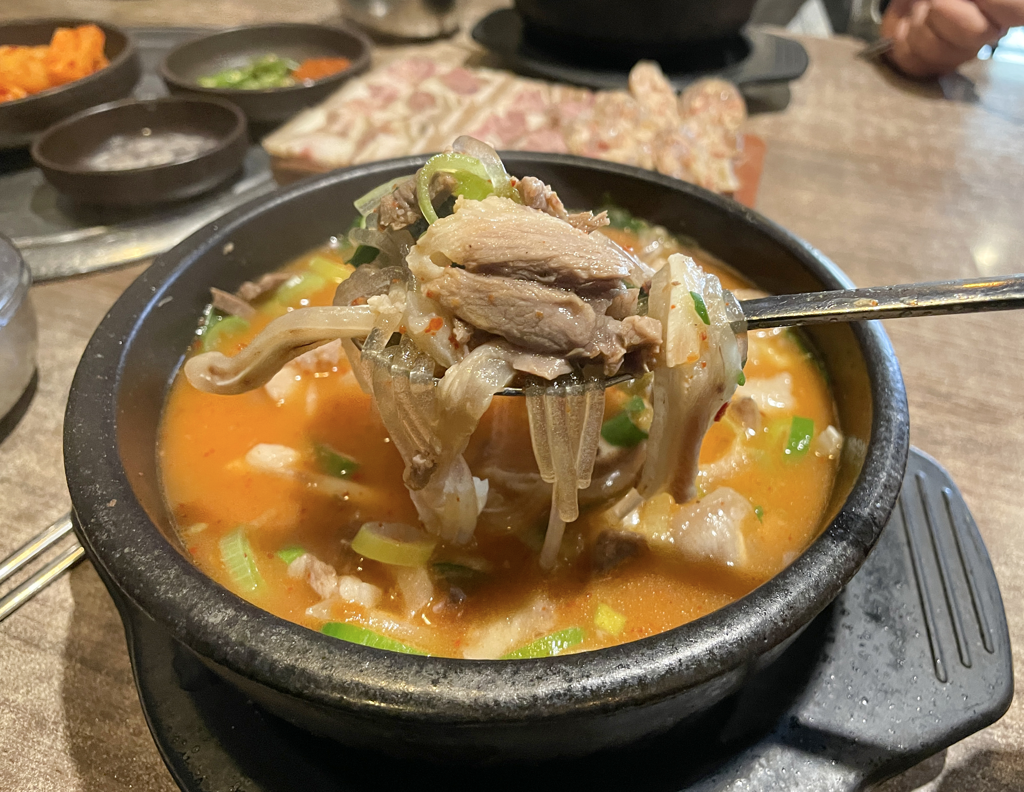 소사골돈순대국은 소사골에 순대, 머리고기, 오소리, 곱창, 부속고기 등이 들어간 메뉴인데, 저는 순대빼기로 주문하여 순대가 빠진 순대국이 나왔습니다. 독특한 점은 깻잎이랑 다진양념이 들어가 받을때는 흰 순대국이었지만, 섞어보니 붉은 양념이 국물이 배어나와 얼큰한 국물이 되었습니다.