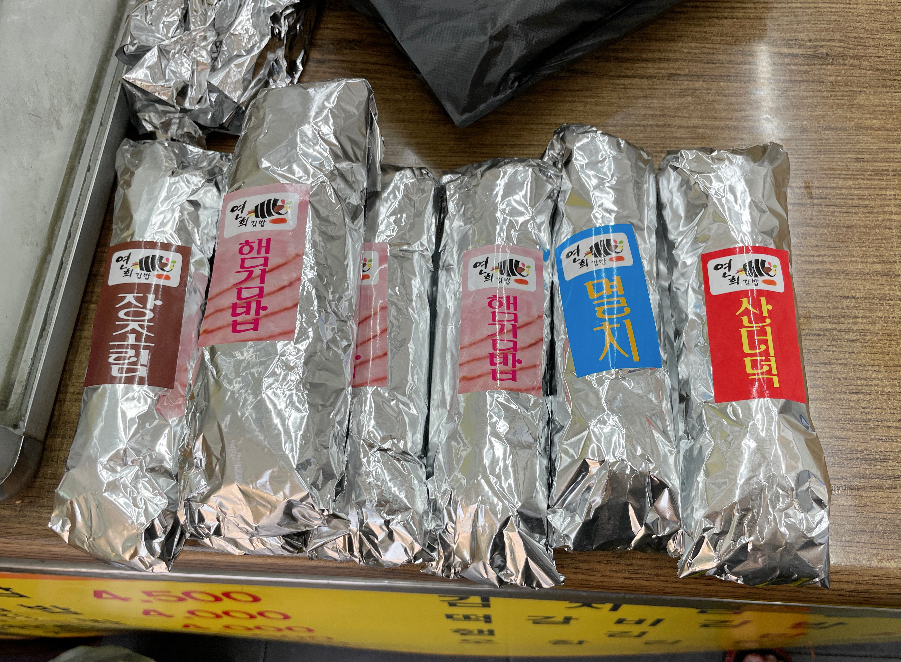 콘텐츠 촬영 중인 형을 기다리며 차 안에서 김밥을 먹었습니다. 윗줄은 참치김밥, 아랫줄은 오징어김밥입니다. 연희김밥의 두 김밥 모두 내용물이 알차게 들어있었고, 김밥 썰어주는 기계로 잘라주어서 반듯하게 잘 잘린 모습을 볼 수 있었습니다.
