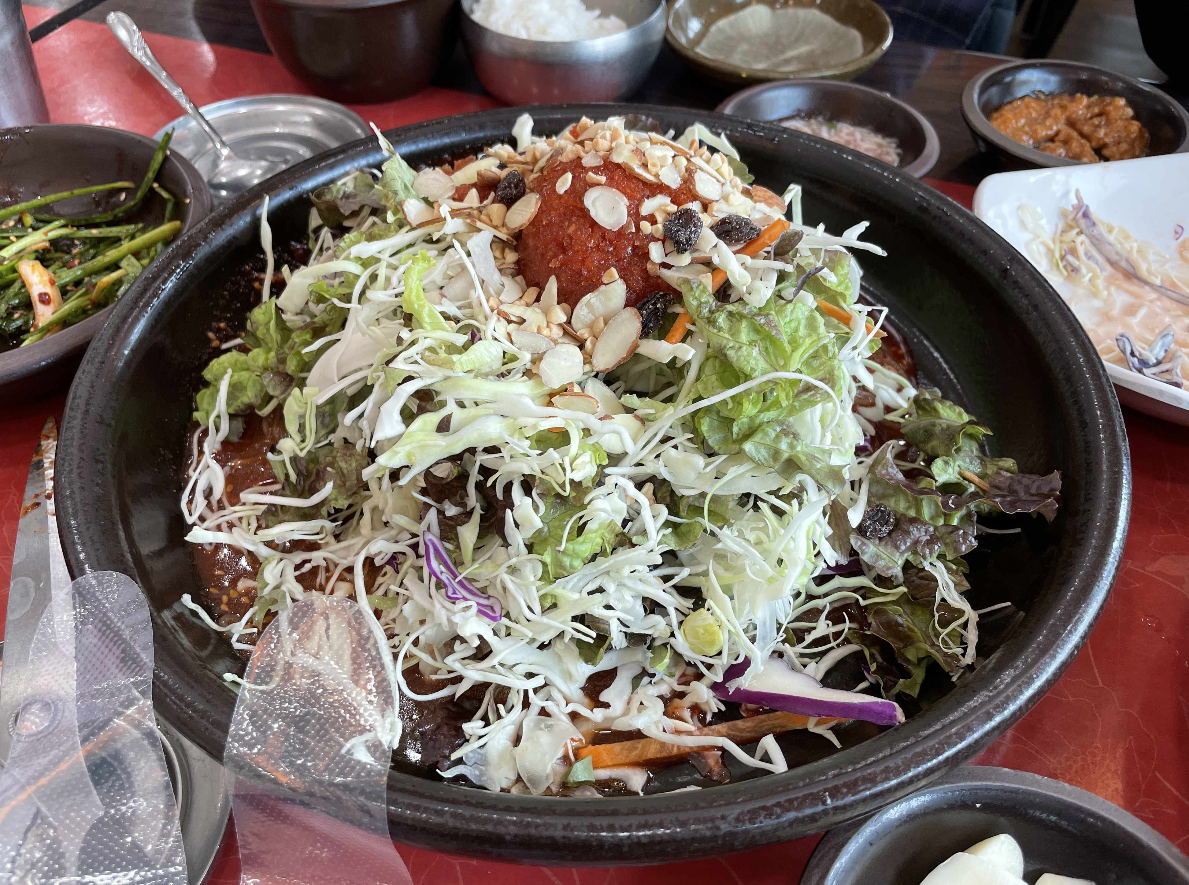 같이 나온 쟁반국수의 모습은 이렇습니다. 양배추와 상추, 아몬드, 땅콩, 건포도 등이 올라가 새콤하면서도 견과류의 바삭한 식감이 곁들여져 더욱 먹기 좋았습니다. 항아리보쌈 거여역점의 가성비 메뉴 점심특선 세트정식은 별 기대없이 먹었는데, 의외로 만족스럽게 먹었던 메뉴였습니다.
