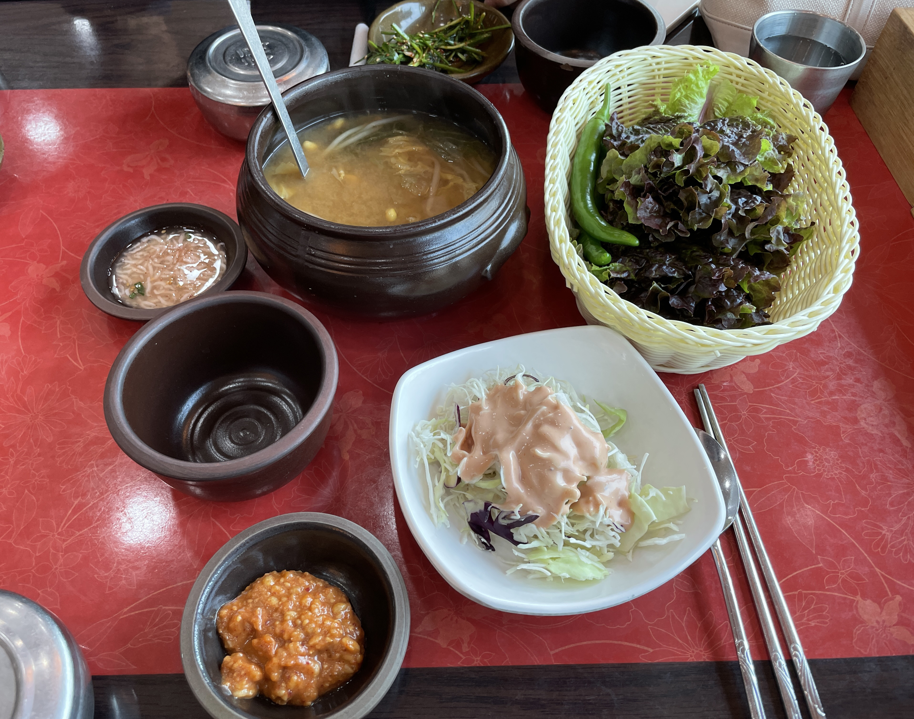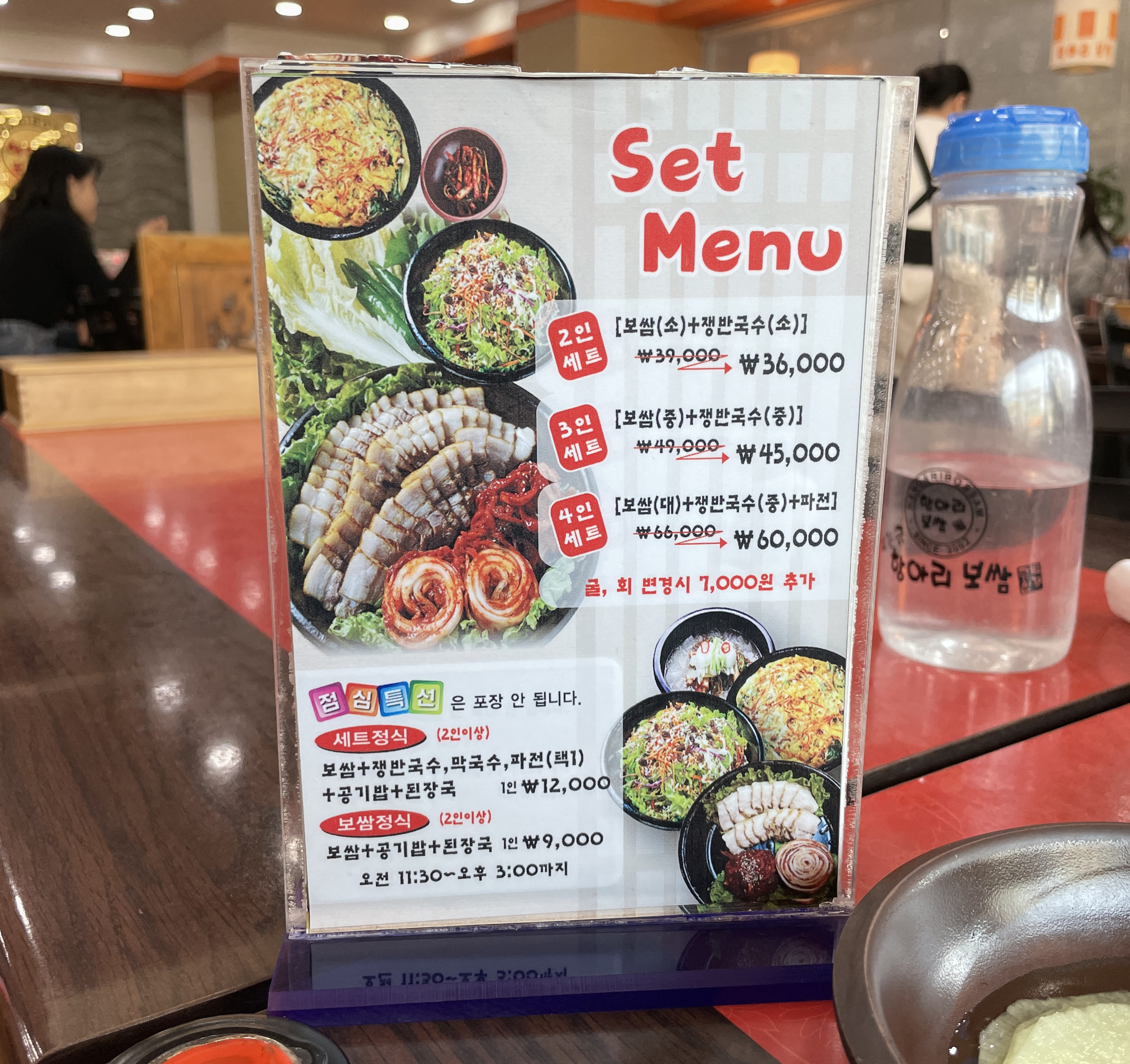 저는 거여동 항아리보쌈의 가성비 좋기로 유명한(?) 점심특선 세트정식을 먹어봤는데, 12,000원에 보쌈, 공기밥, 된장국은 기본으로 제공되며 쟁반국수, 막국수, 파전 중 선택하여 곁들여 먹을 수 있다는 게 특징이었습니다. 저희는 쟁반국수를 같이 곁들이는 것으로 하고 세트 정식을 주문하였습니다.