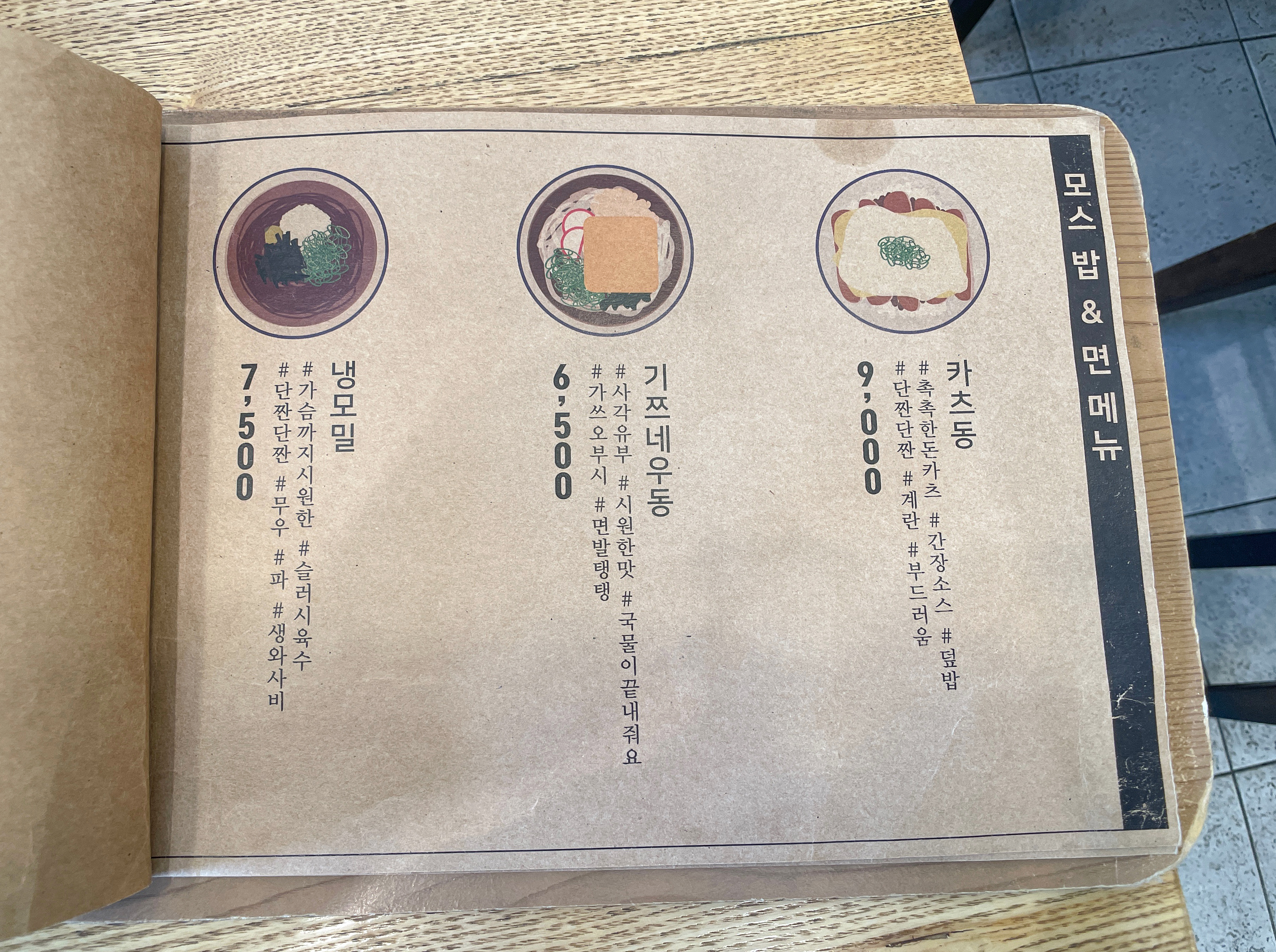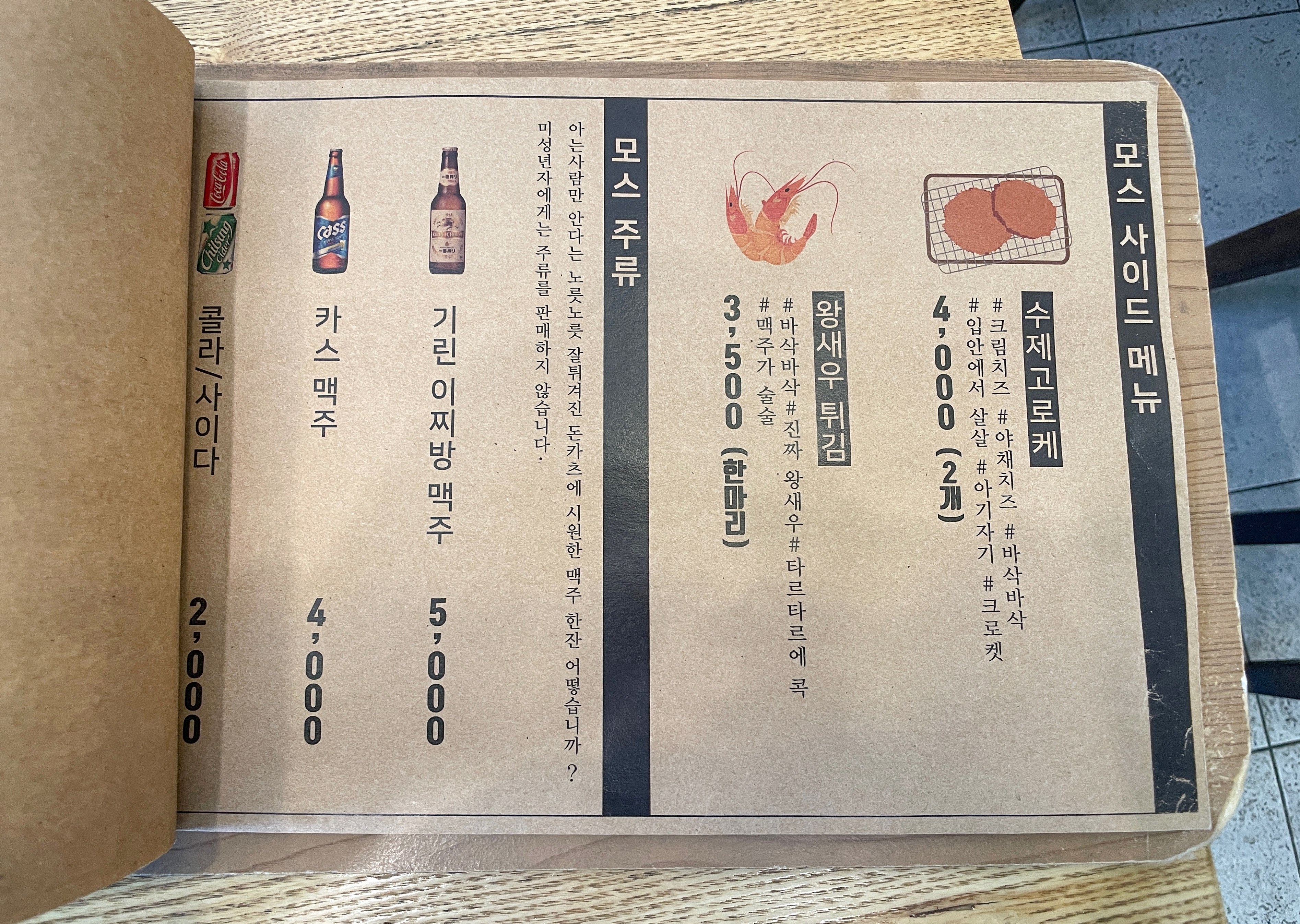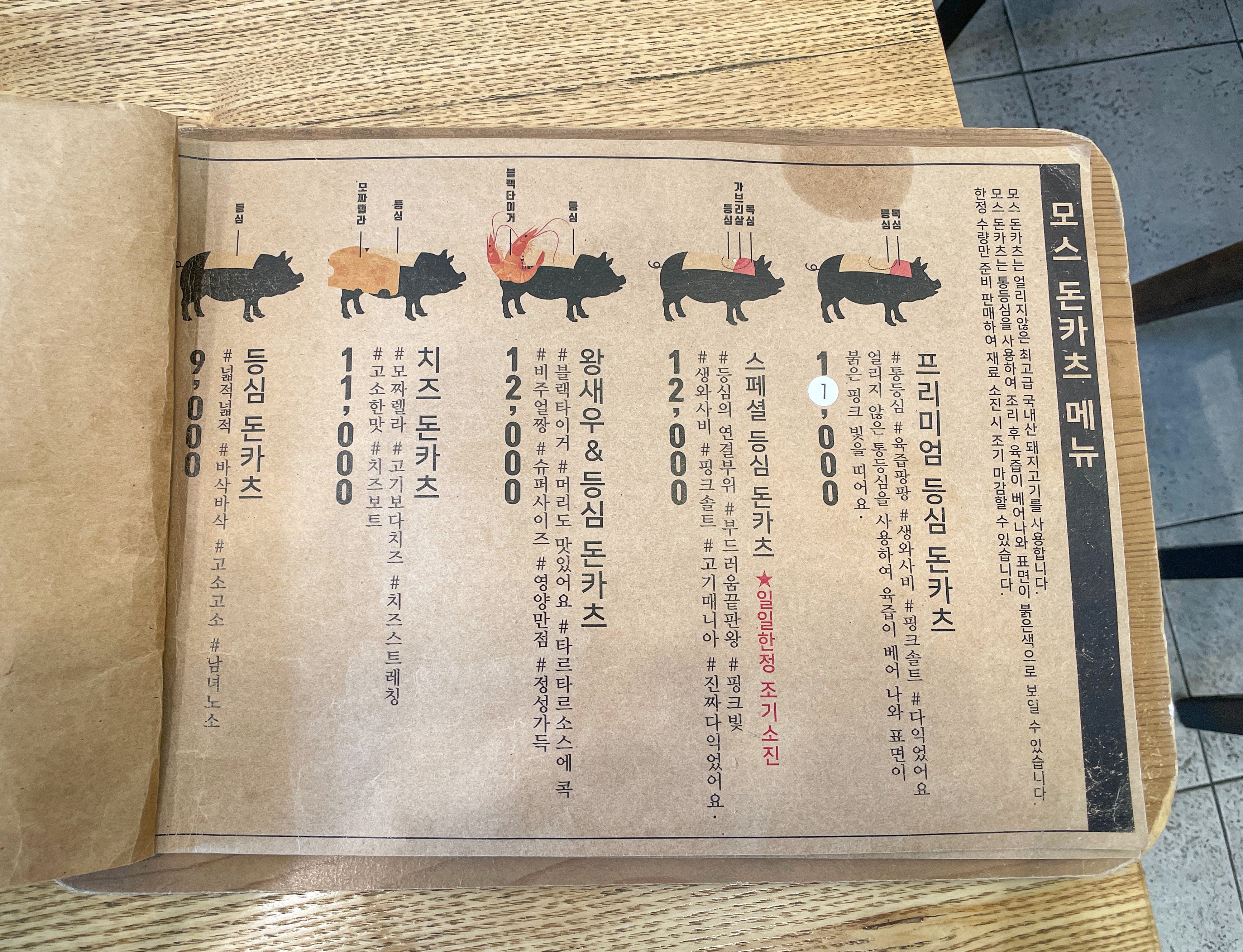 모스키친의 메뉴를 함께 살펴보겠습니다. 등심돈카츠, 치즈돈카츠, 왕새우&등심돈카츠, 스페셜등심돈카츠, 프리미엄등심돈카츠, 냉모밀, 기쯔네우동, 카츠동, 수제고로케, 왕새우튀김 등이 있었습니다. 저희는 일일 한정 메뉴인 스페셜등심돈카츠 2개를 주문하여 먹었습니다.