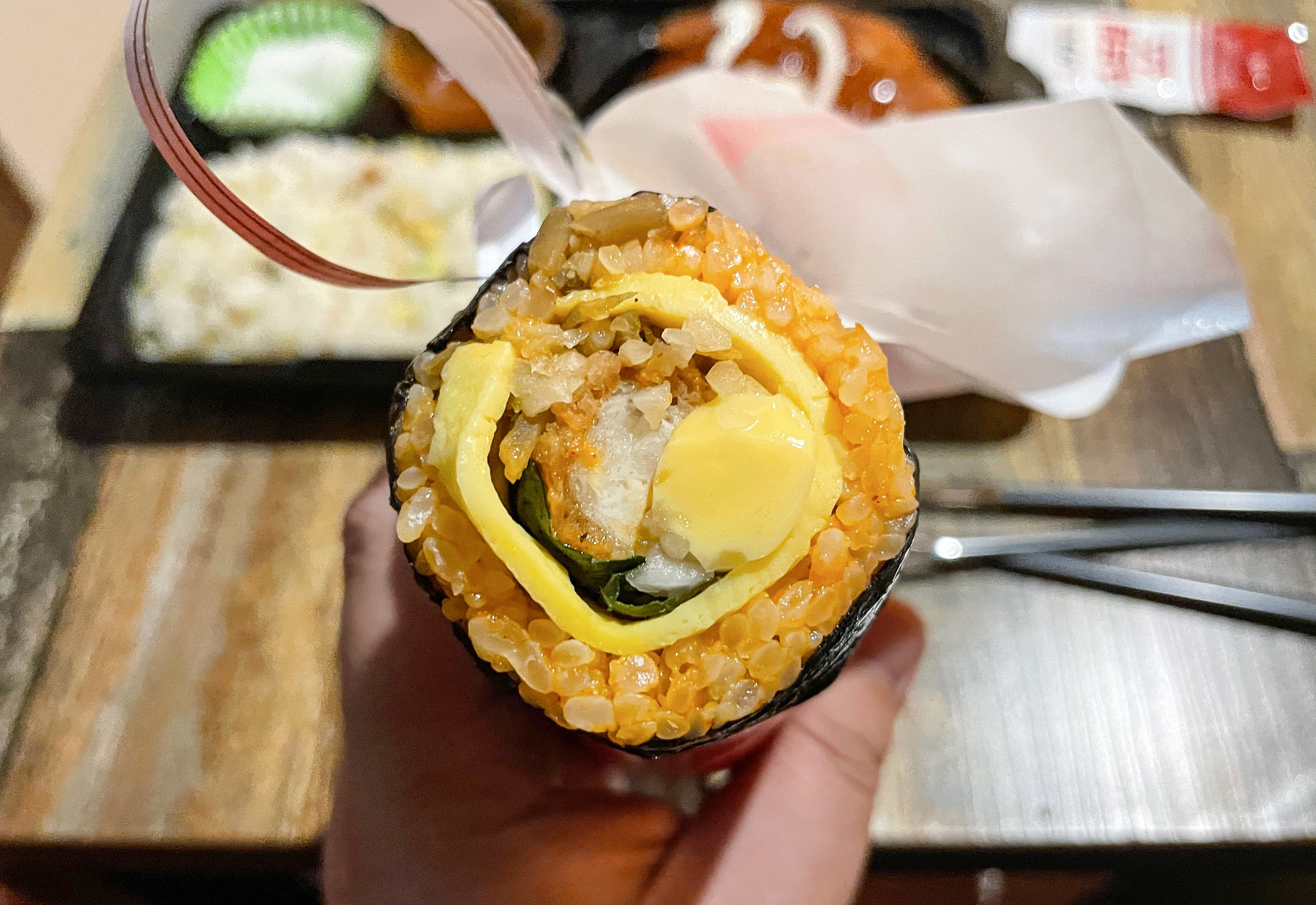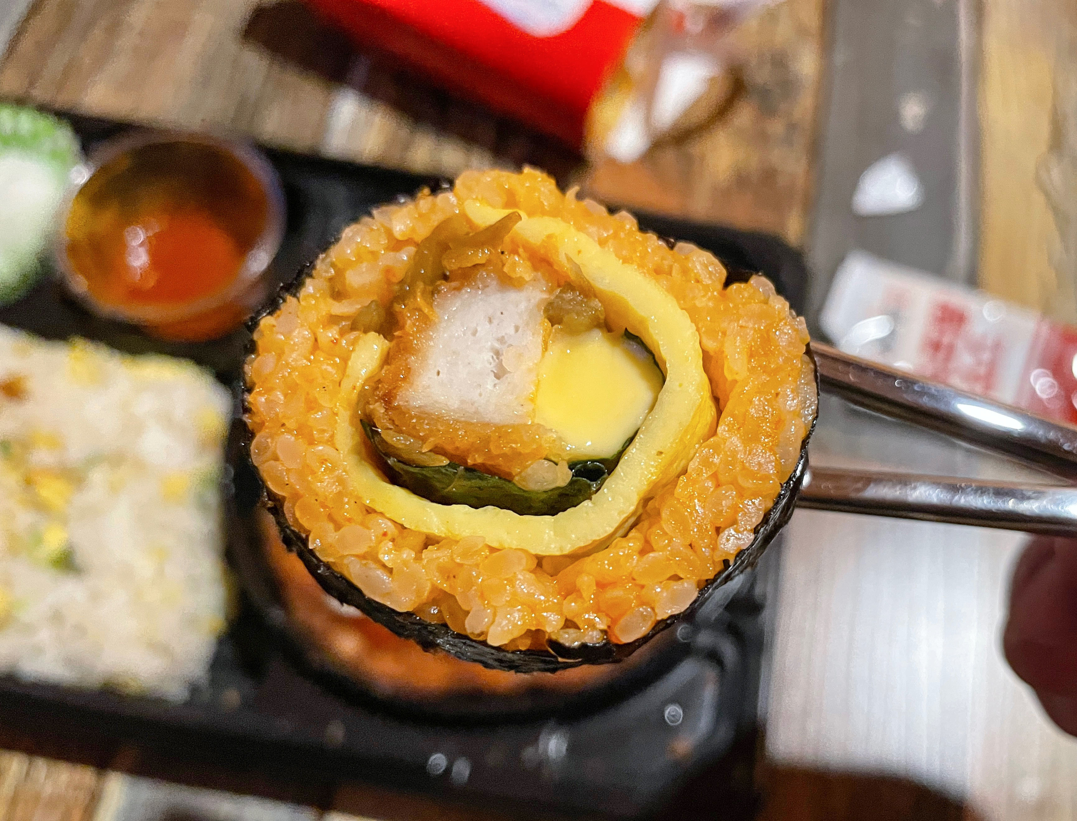 처갓집 양념치킨 김밥의 모습은 이렇습니다. 양념이 되어있는 밥과 계란지단, 튀김, 치즈 등이 들어있었습니다. 포스팅하면서 조사해보니 3,900원 처갓집 양념치킨 버거도 있다고 하네요. 김밥은 먹을만했지만 쏘쏘.