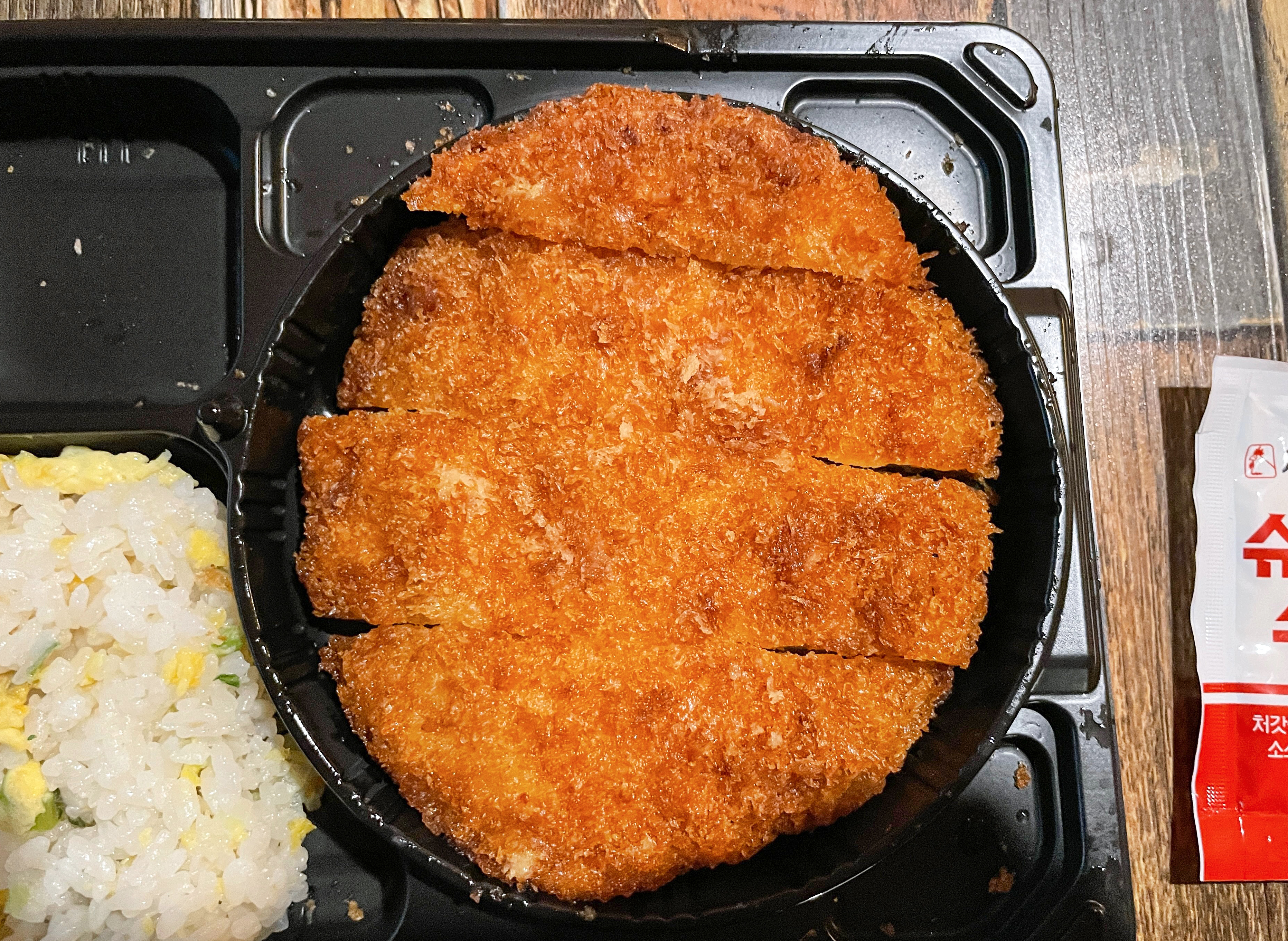 처갓집 양념치킨 도시락의 치킨까스는 전자레인지에 돌려서 익히는 방식이다 보니, 튀김옷이 바삭바삭하지 않고 눅눅하다는 게 가장 큰 단점인 것 같습니다. 실제 먹어보면 겉 부분은 조금 딱딱하기까지 합니다. 볶음밥도 계란과 파조각 조금 들어있는데, 맛은 괜찮았으나 4,900원이라는 가격 대비 구성은 딱히 좋아 보이지 않았습니다.