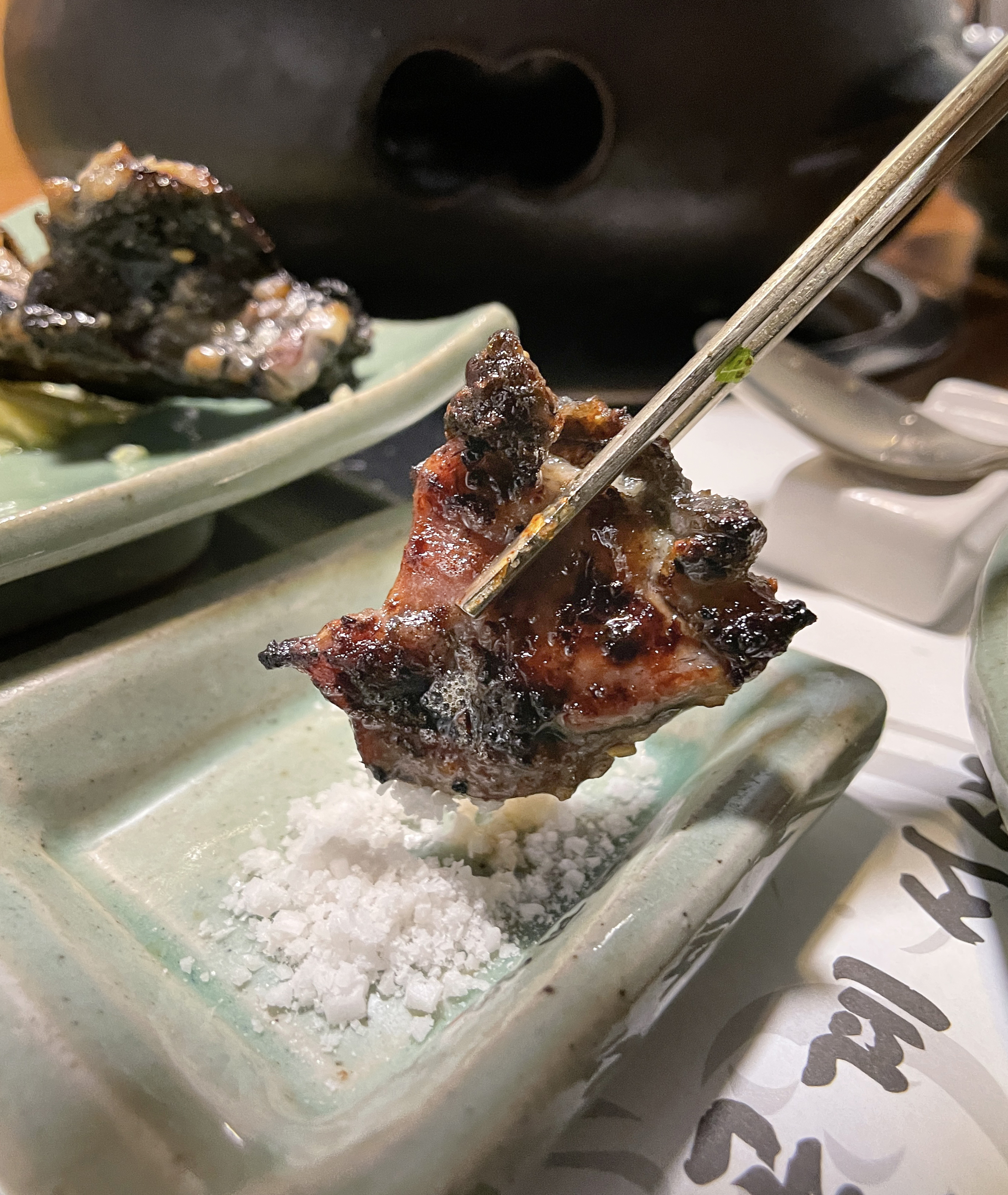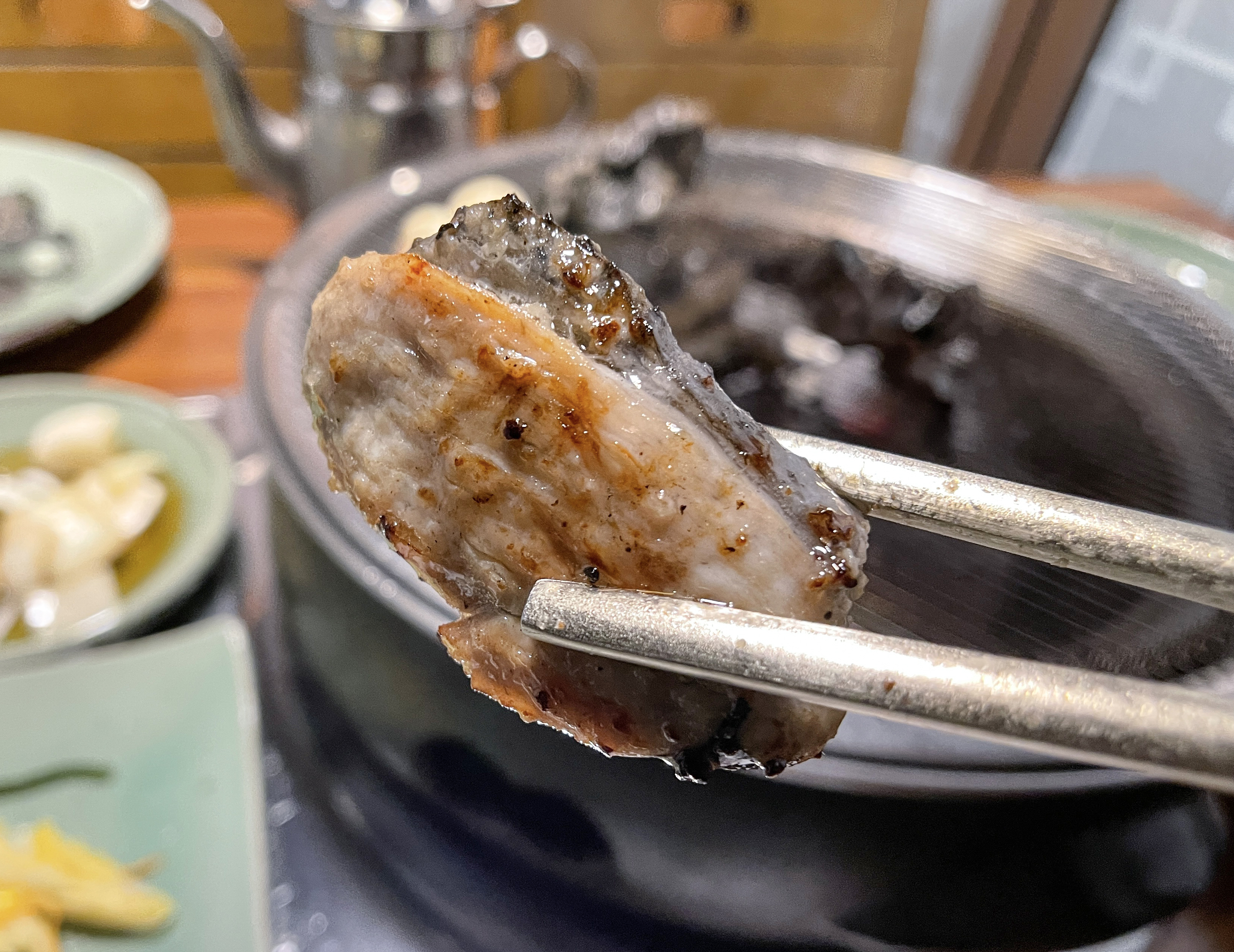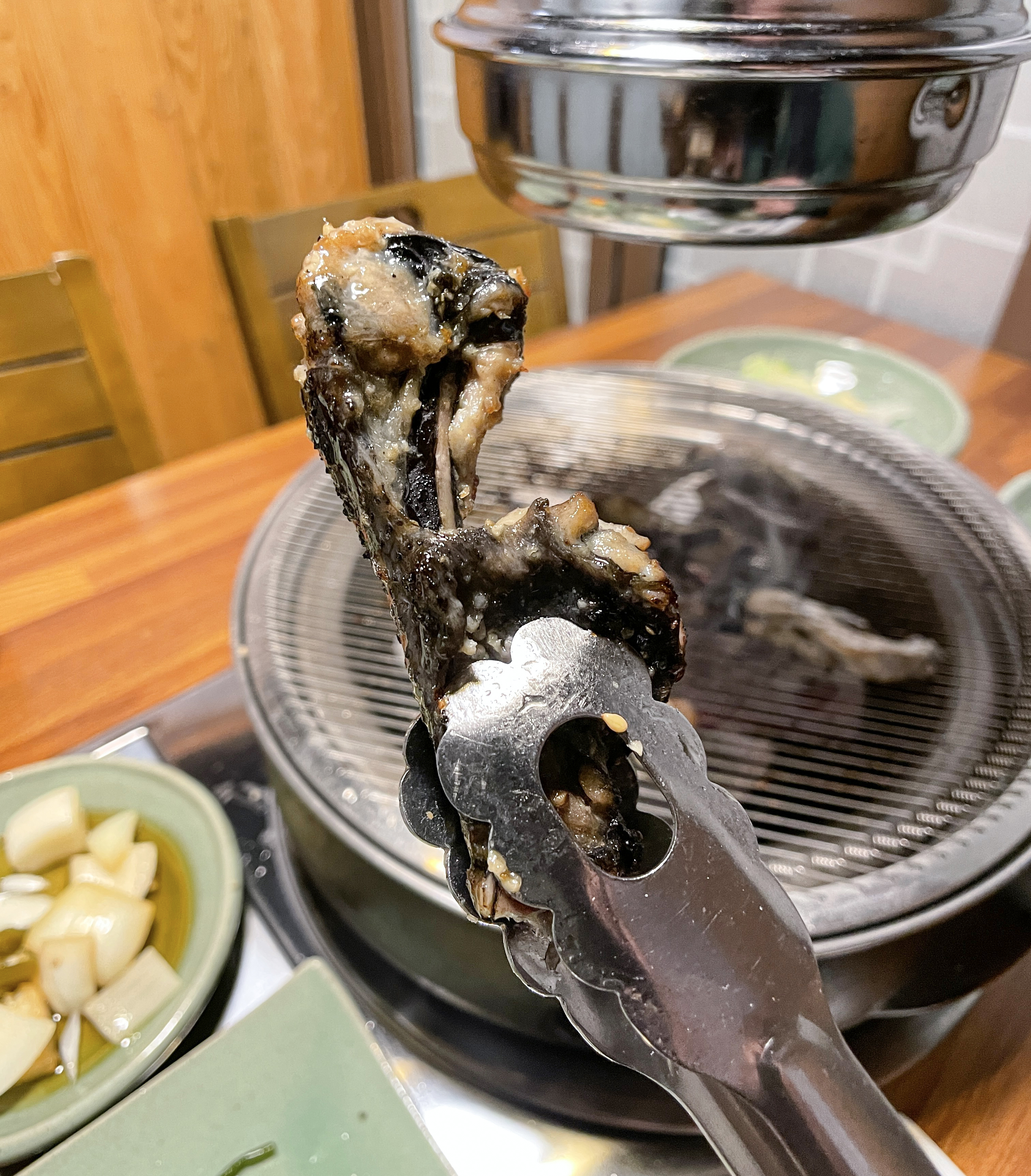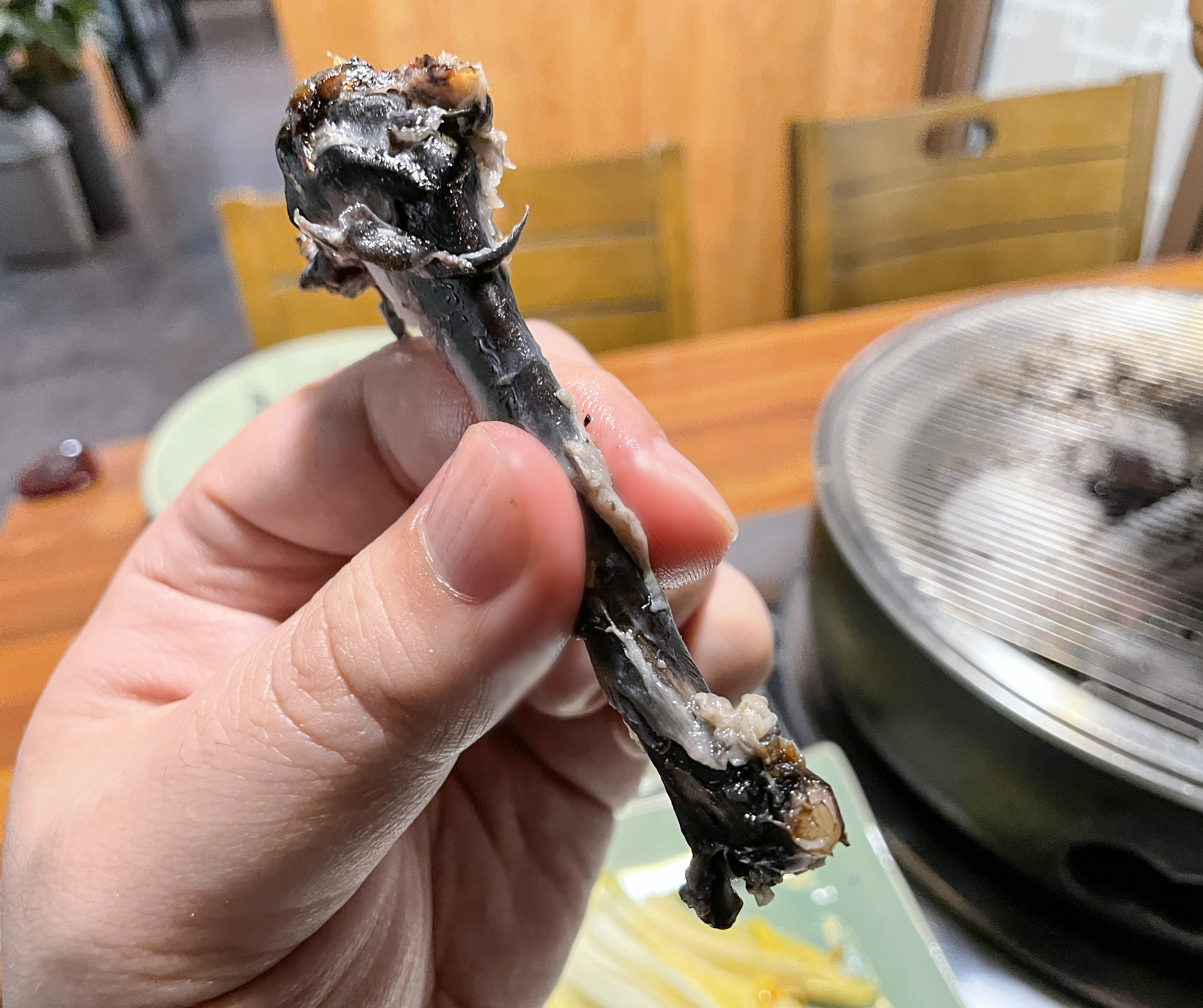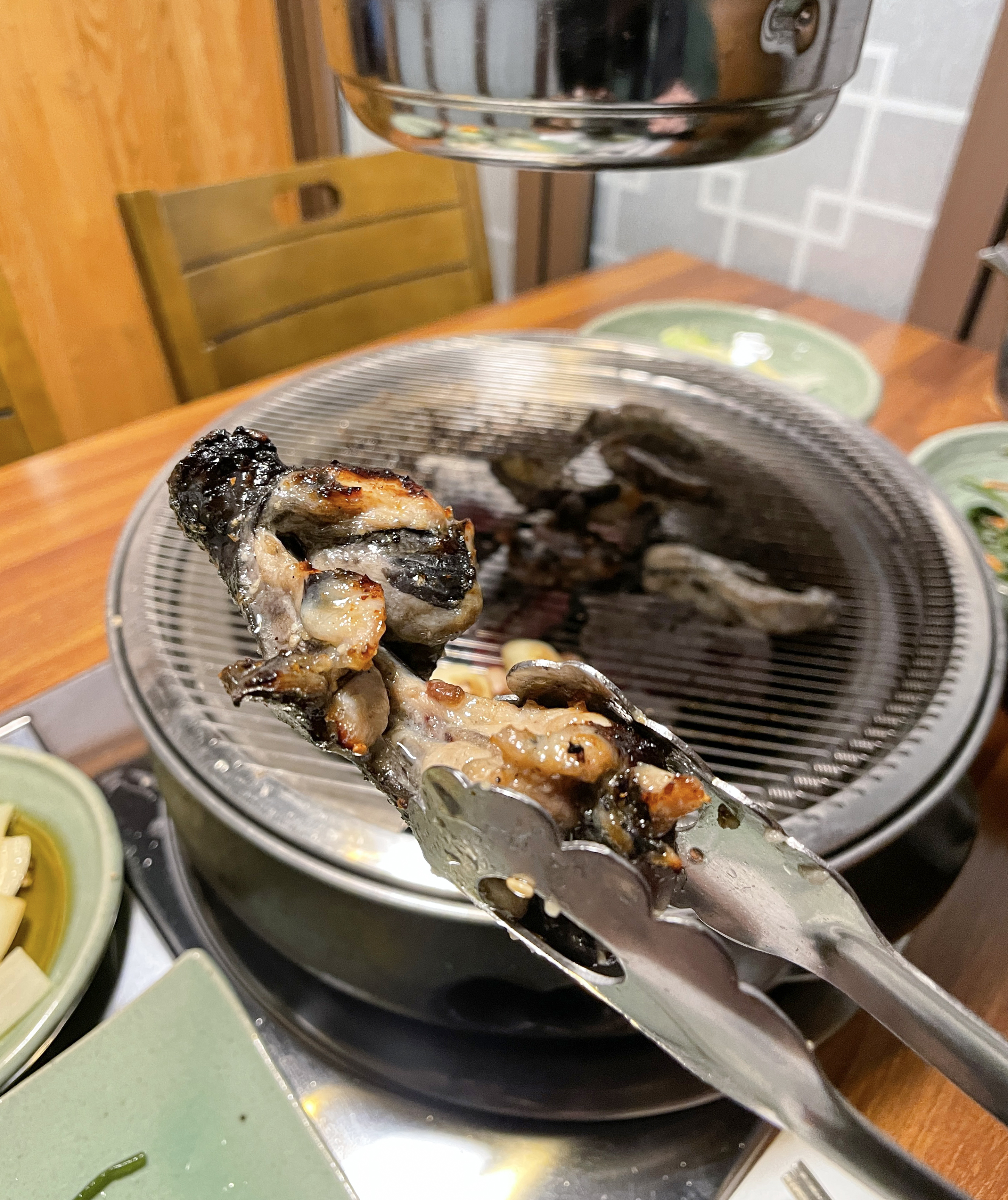 퇴계동 오골계선생의 오골계숯불구이는 항아리처럼 생긴 화로에 간이 배어있는 오골계를 구워 먹는 건데, 처음에는 고기 굽는 것을 도와주셔서 굽는 방법이 어렵지는 않았고 처음 먹어본 오골계는 생각보다 쫄깃한 식감이 있고 맛있었습니다.