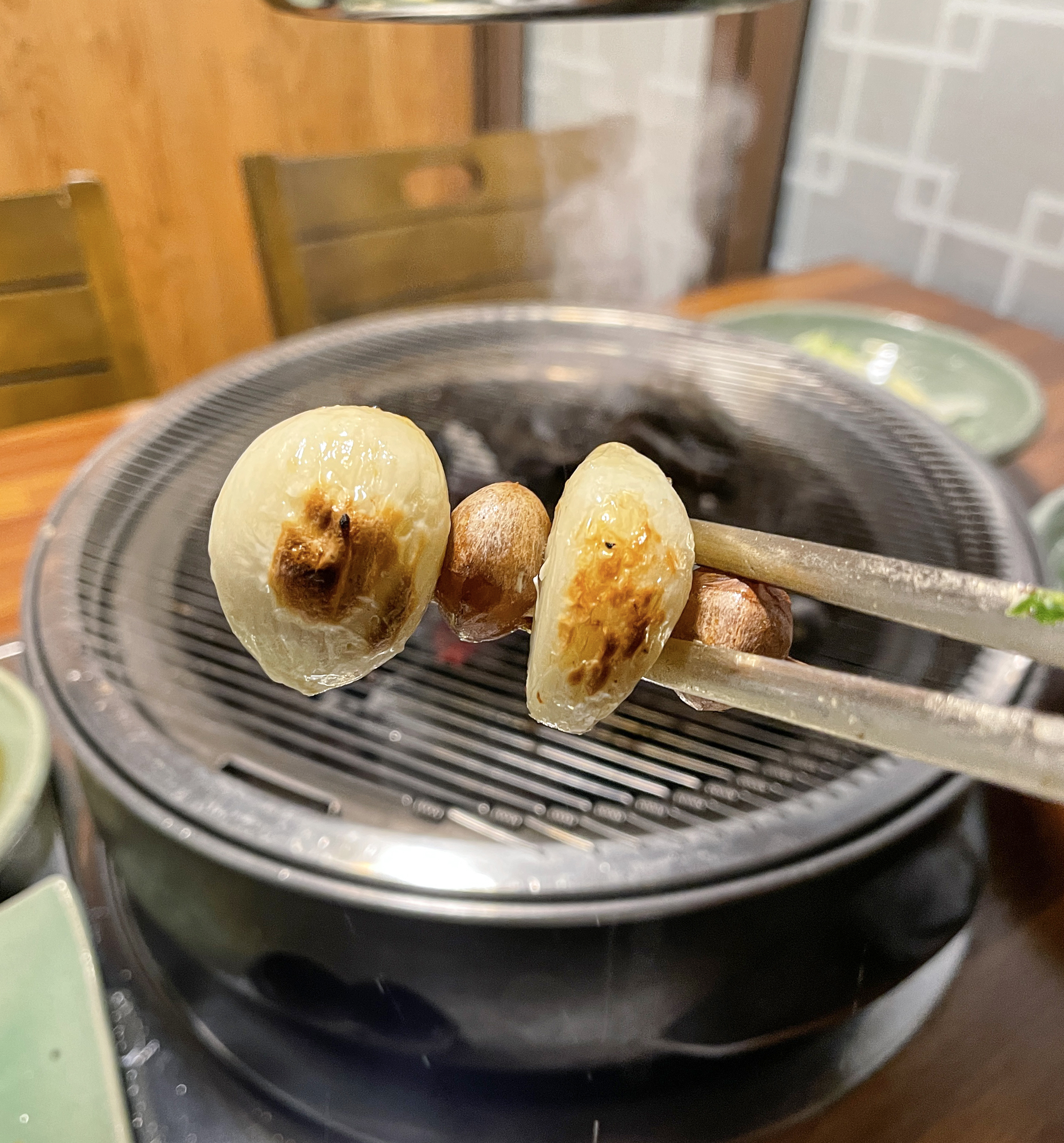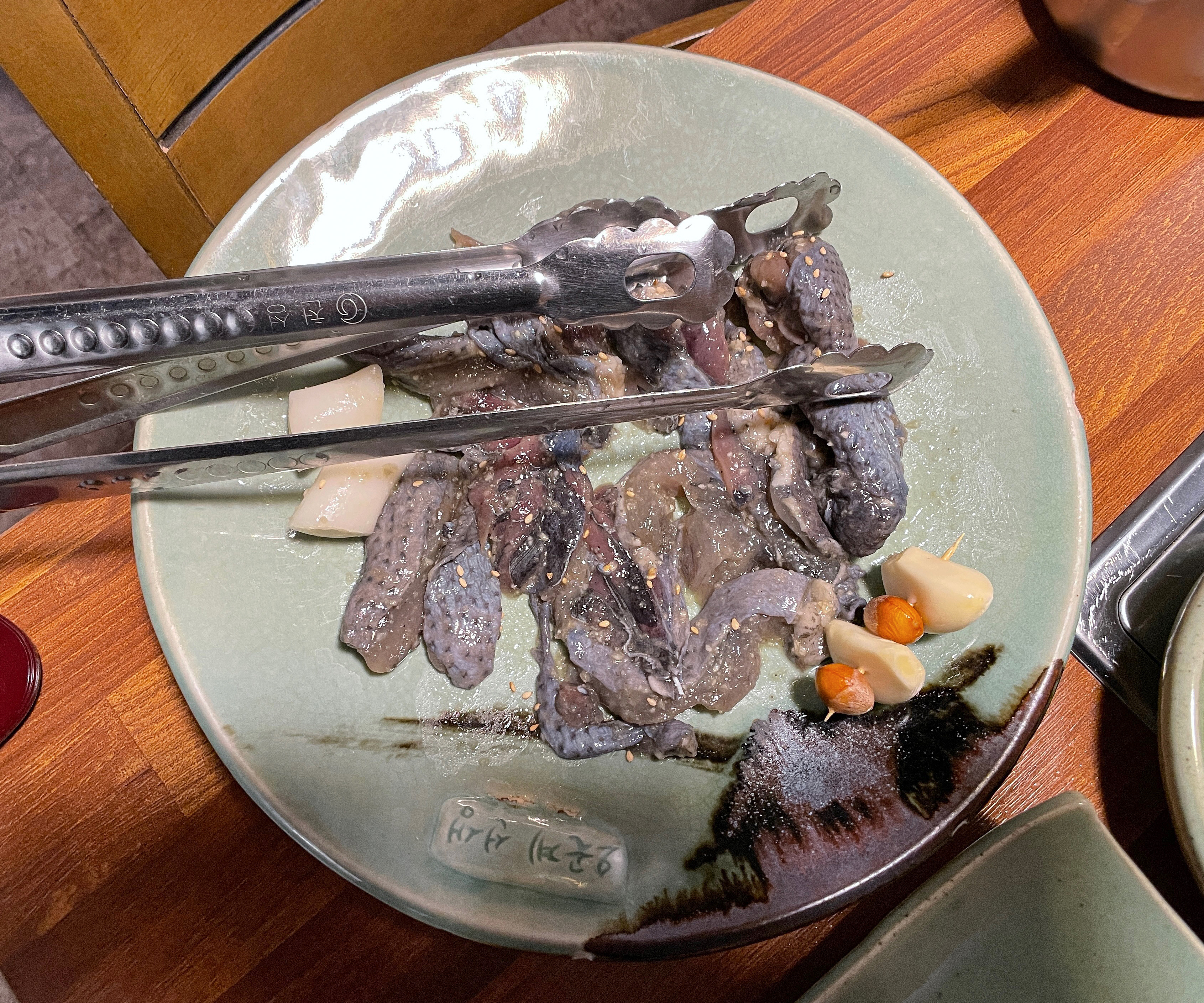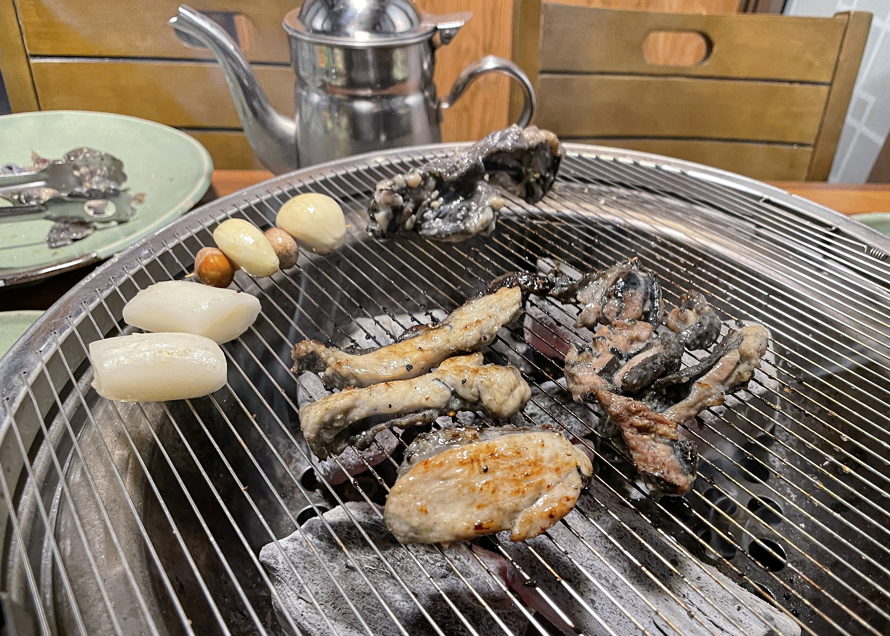 오골계를 잘 구워서 참나물에 곁들이면 고소하면서도 참나물의 향이 잘 어우러져 좋았습니다. 같이 제공된 떡과 마늘, 은행도 구워서 먹었습니다.