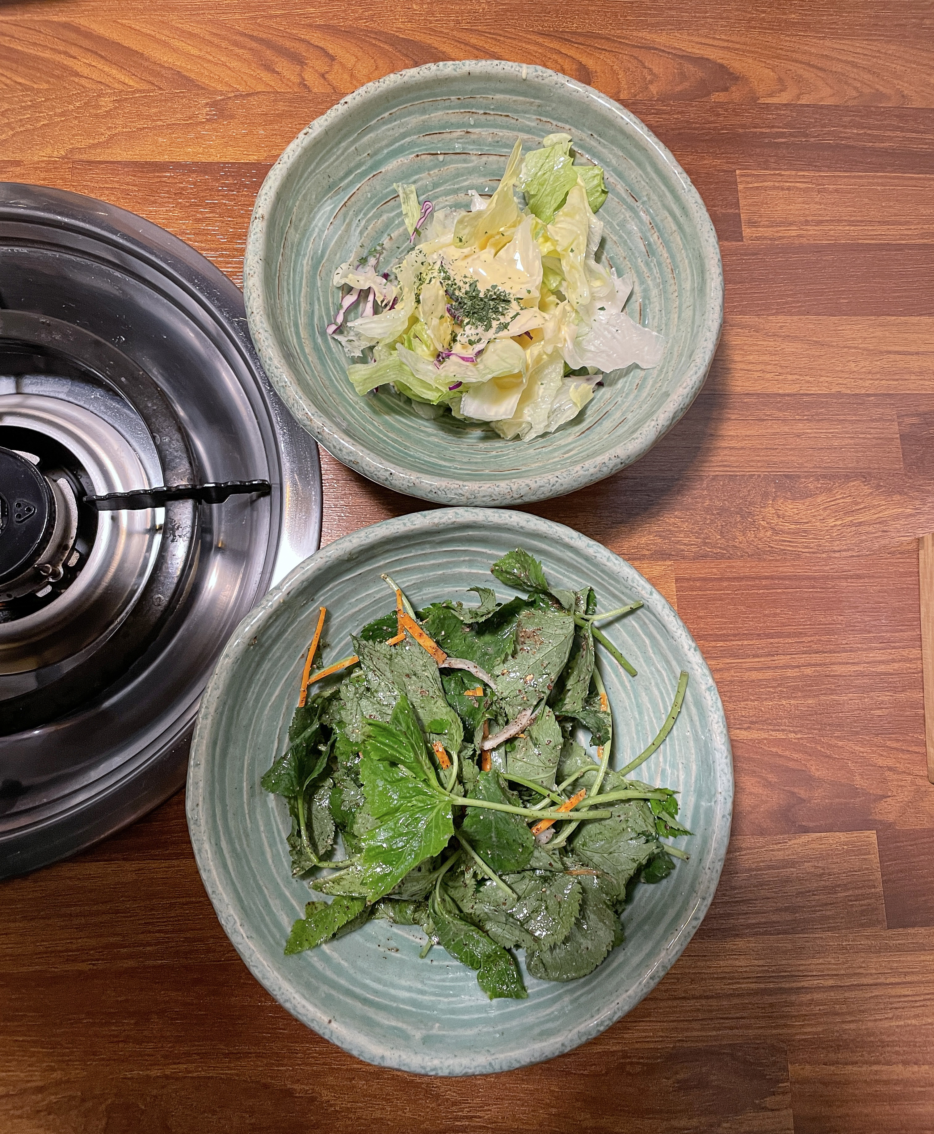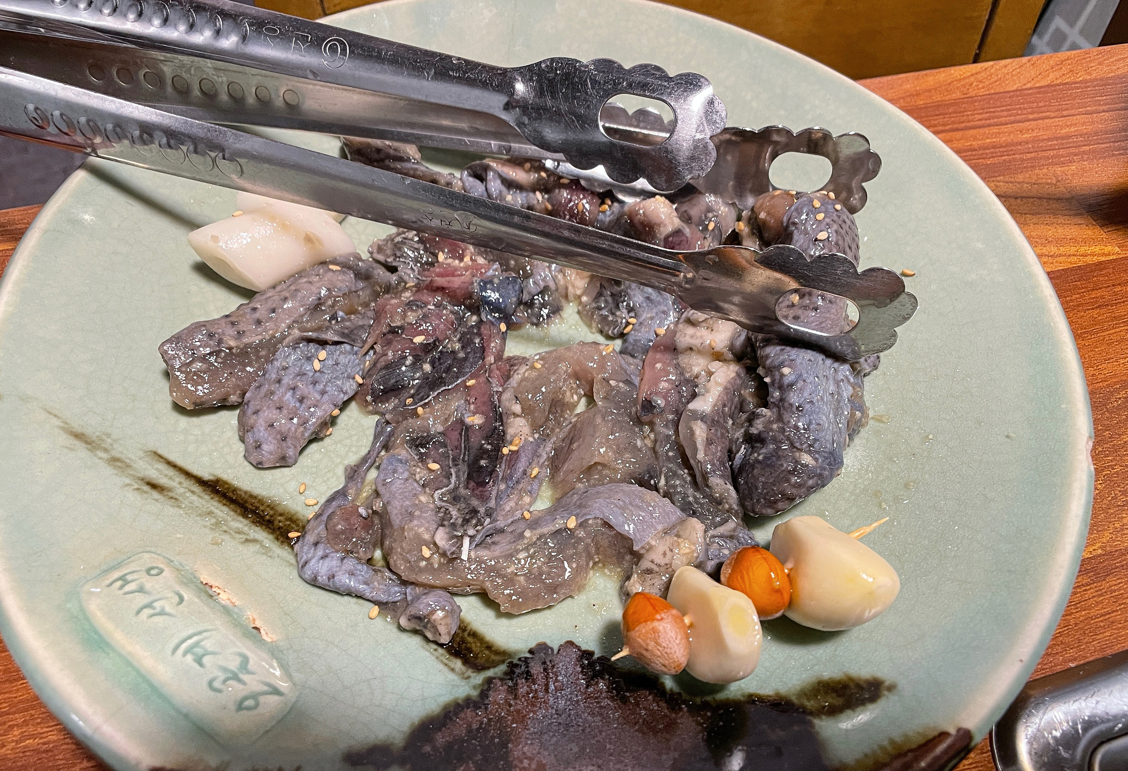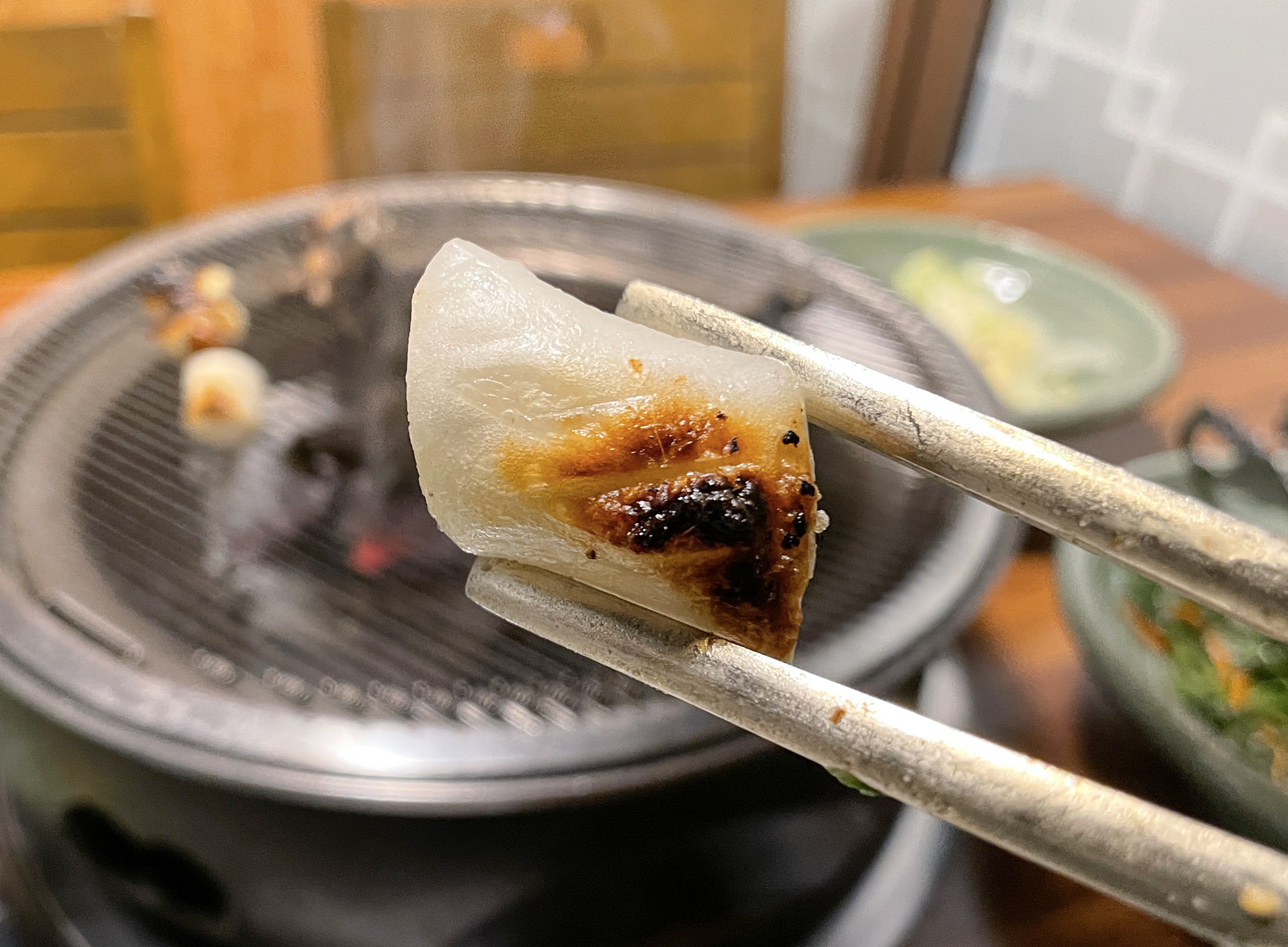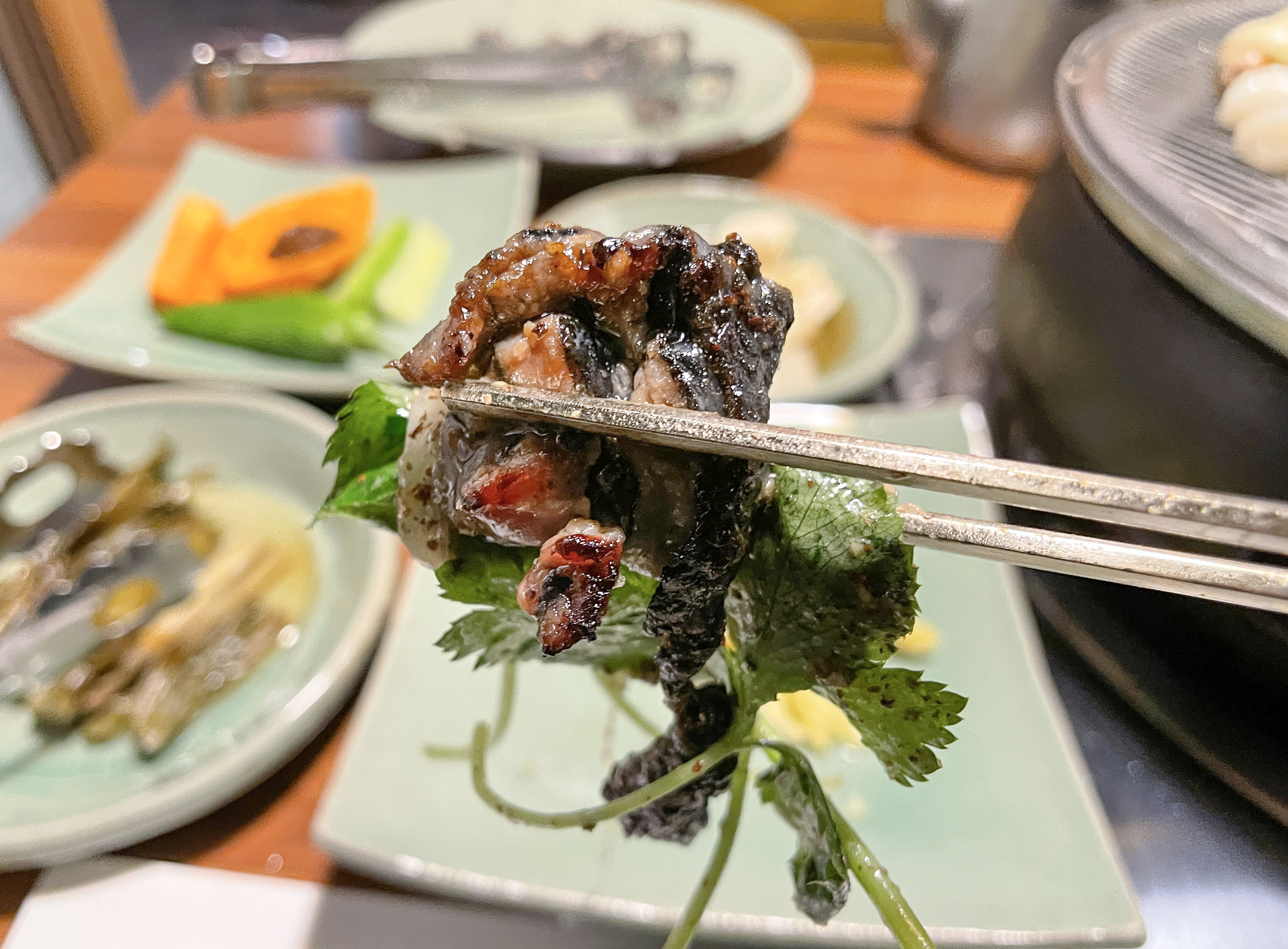 오골계를 잘 구워서 참나물에 곁들이면 고소하면서도 참나물의 향이 잘 어우러져 좋았습니다. 같이 제공된 떡과 마늘, 은행도 구워서 먹었습니다.