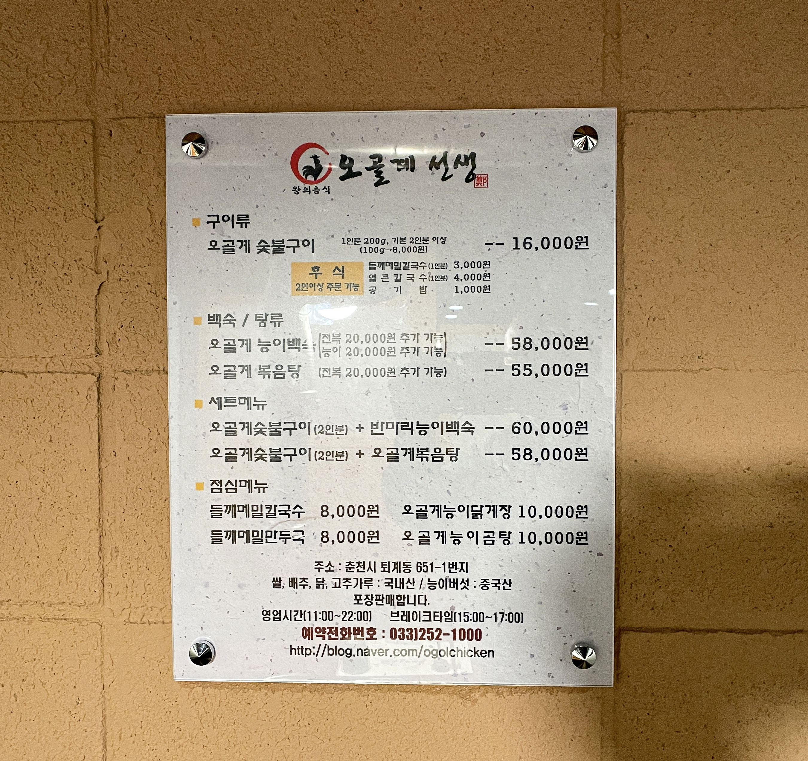 강원 춘천시 퇴계동 651-1, 1층에 위치해 있었고 가게 옆에는 주차장이 마련되어 있어서 이용이 편리했습니다. 오골계는 처음 먹어보는 메뉴인데 결론부터 말하자면 가격이 조금 부담스럽지만 정말 맛있었습니다.
