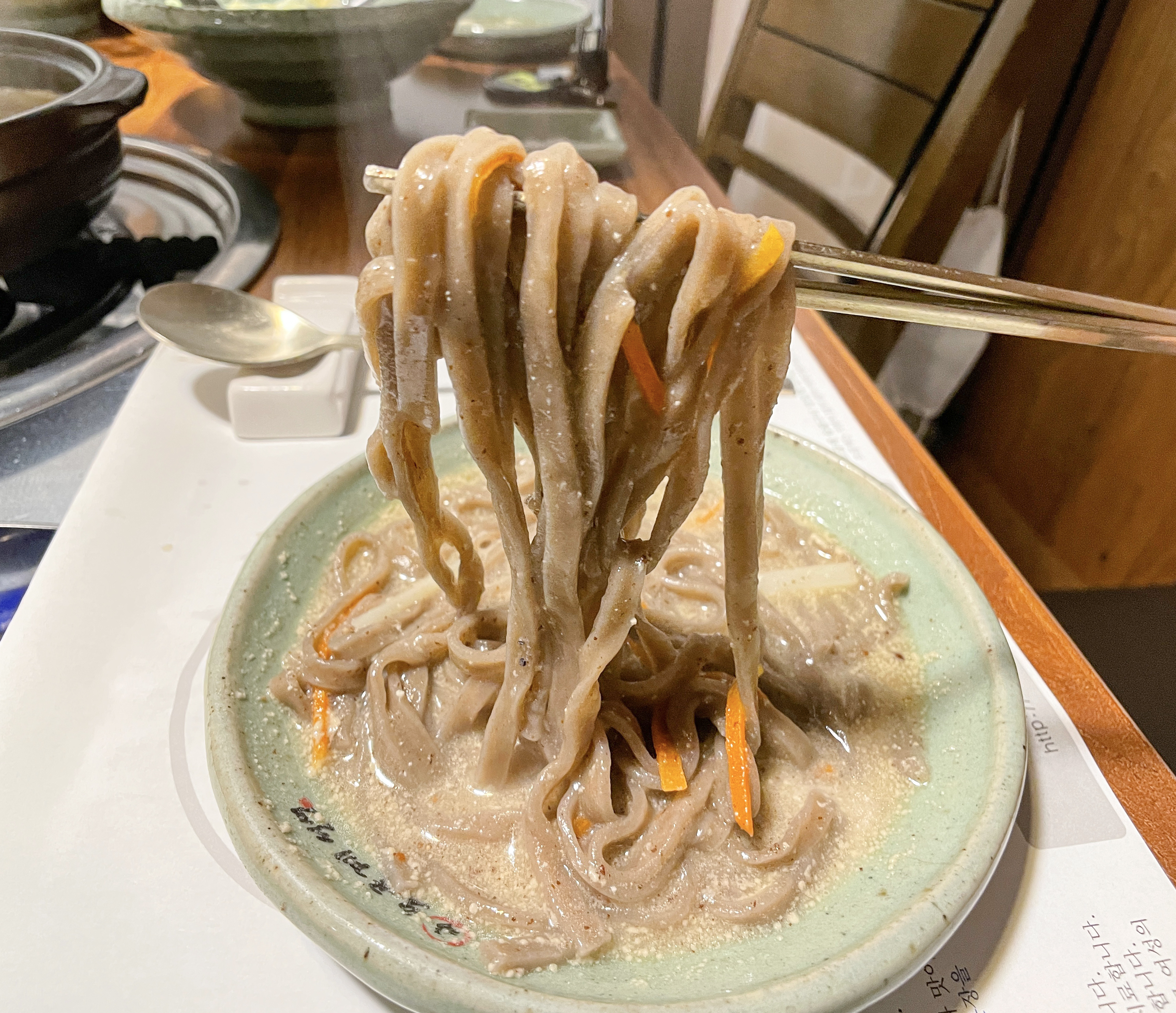오골계 숯불구이를 먹고 오골계의 뼈를 보는데 실제로 뼈와 살이 검은 것이 신기하더라고요. 오골계 숯불구이만 먹기에는 양이 조금 부족해서 들깨칼국수도 주문했습니다.