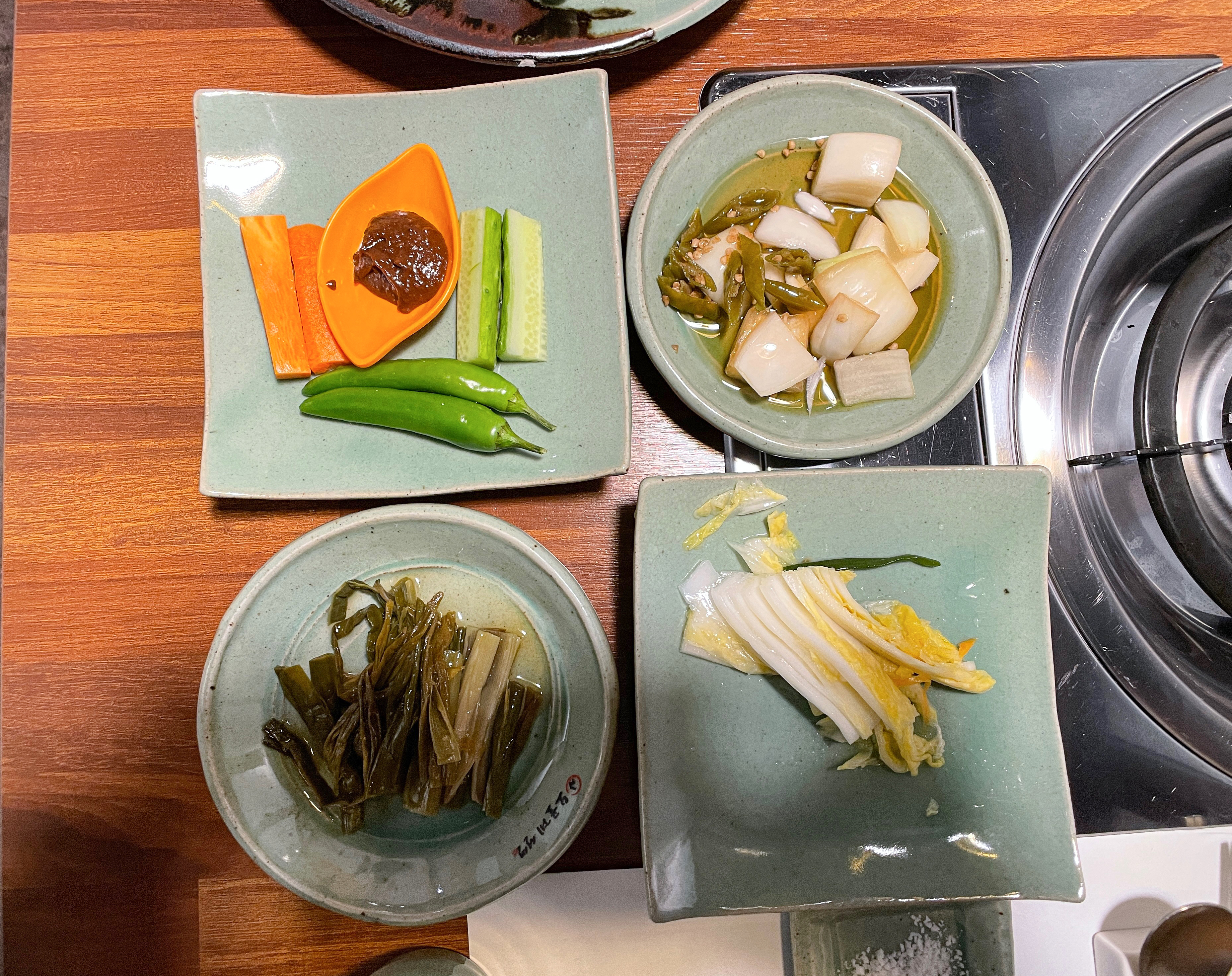 춘천 오골계선생의 오골계숯불구이는 위와 같이 나왔습니다. 오골계 숯불구이의 1인분의 양이 많지는 않지만 떡과 마늘・은행꼬치도 있고, 양파장아찌, 명이나물, 참나물 등이 나왔는데 반찬들이 하나같이 맛있더라고요.