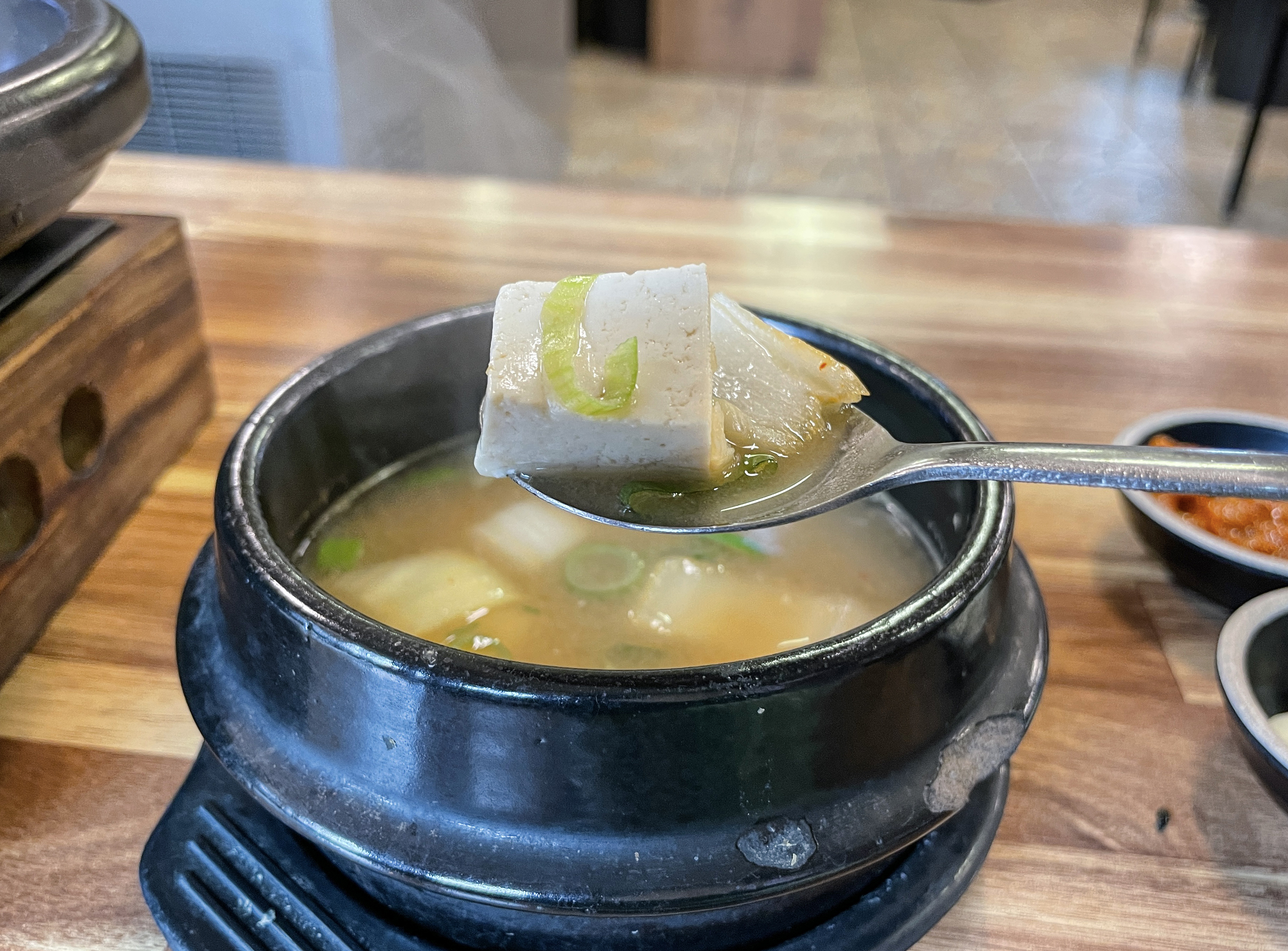 마송숯불구이밥상에 돼지 숯불구이와 같이 곁들일 된장찌개가 나왔습니다. 된장찌개는 특별할 것은 없었지만 구수하고 맛있었습니다. 김포시 통진읍의 마송 숯불구이 밥상은 가격대가 좀 있지만, 곁들이는 반찬과 집밥 먹는 분위기를 좋아하신다면 한 번쯤 이용해볼 만한 가게인 것 같습니다.