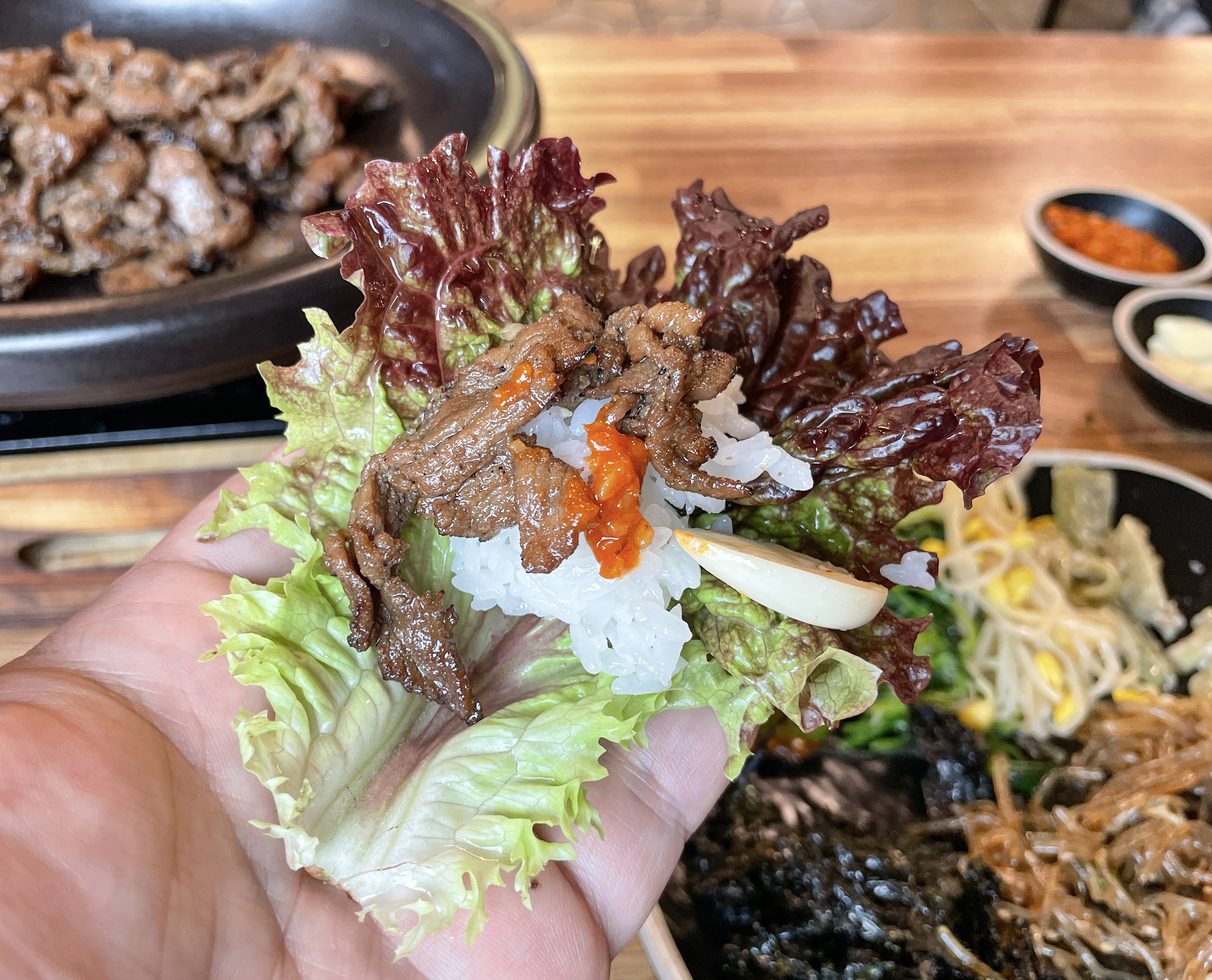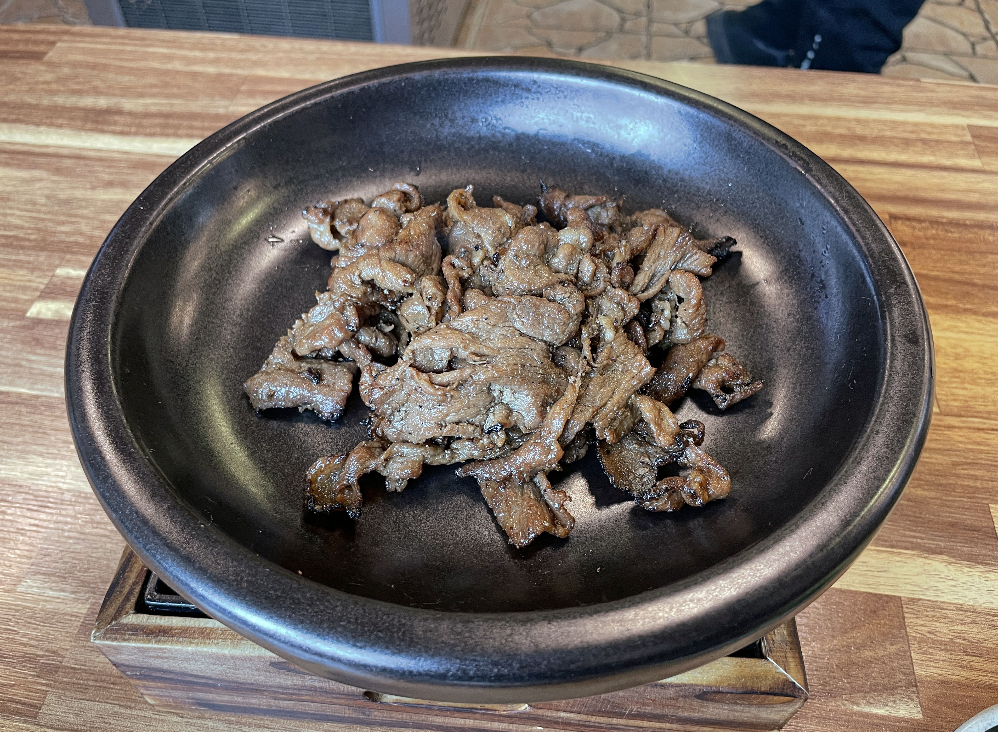 돼지 숯불구이는 기름기가 쫙 빠져 담백했고, 숯불에 구워내 은은한 불맛이 있어 맛이 좋았습니다. 고기가 식지 않도록 그릇을 데워주었는데, 양이 제 기준에 넉넉한 편은 아니었지만(?) 기본 반찬들을 양껏 먹을 수 있기 때문에 적은 양은 큰 문제가 되지는 않았습니다.