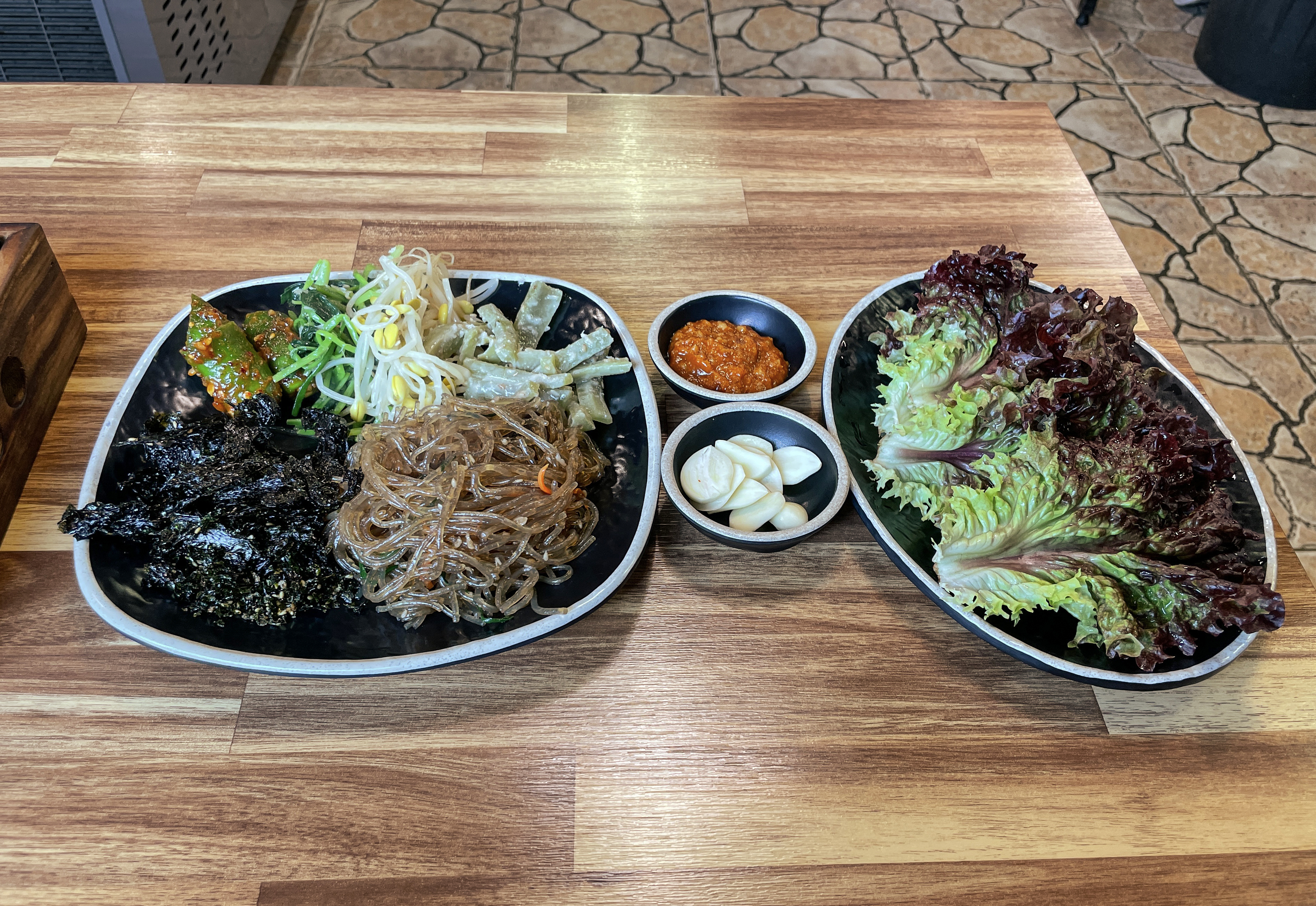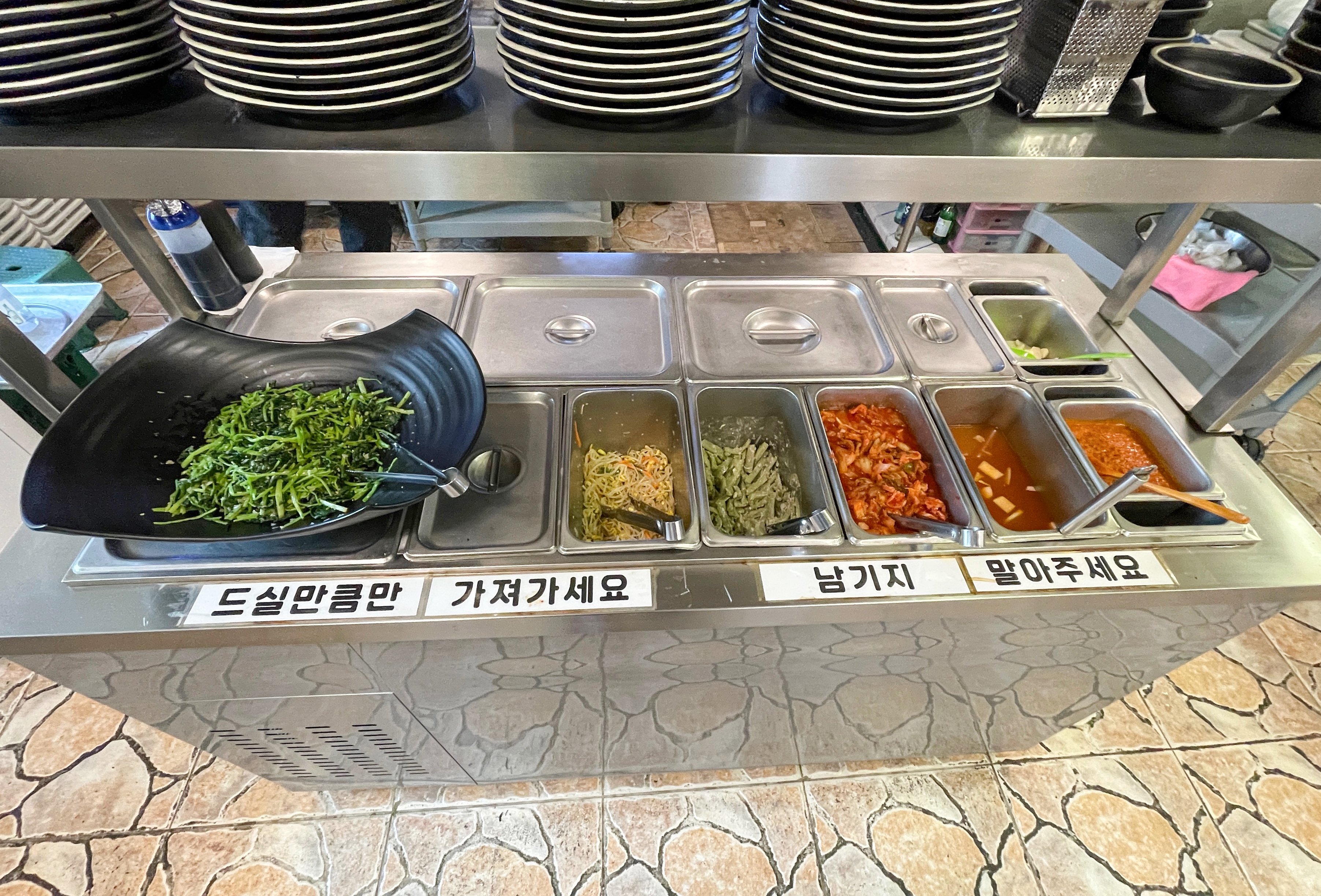 주문한 돼지숯불구이를 기다리는 동안 셀프바에서 반찬을 가지고 왔습니다. 잡채를 비롯해 고추, 시금치, 콩나물 등 다양한 반찬을 원하는 만큼 덜어 먹을 수 있었습니다.