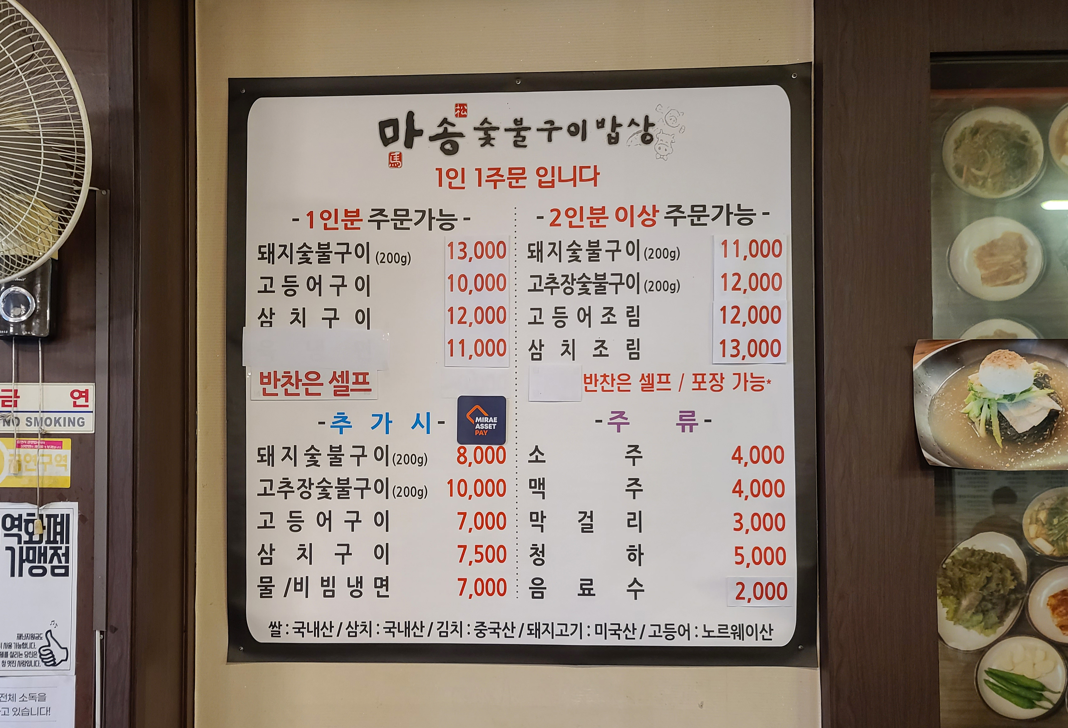 통진읍 <마송숯불구이밥상>은 돼지숯불구이와 고등어・삼치구이 등 숯불구이 전문점으로 유명한 가게입니다. 특히 반찬도 셀프코너에서 직접 가져다 먹을 수 있고, 기본 메뉴를 주문하면 구수한 된장찌개와 함께 나와서 인기 있는(?) 밥집이었습니다.