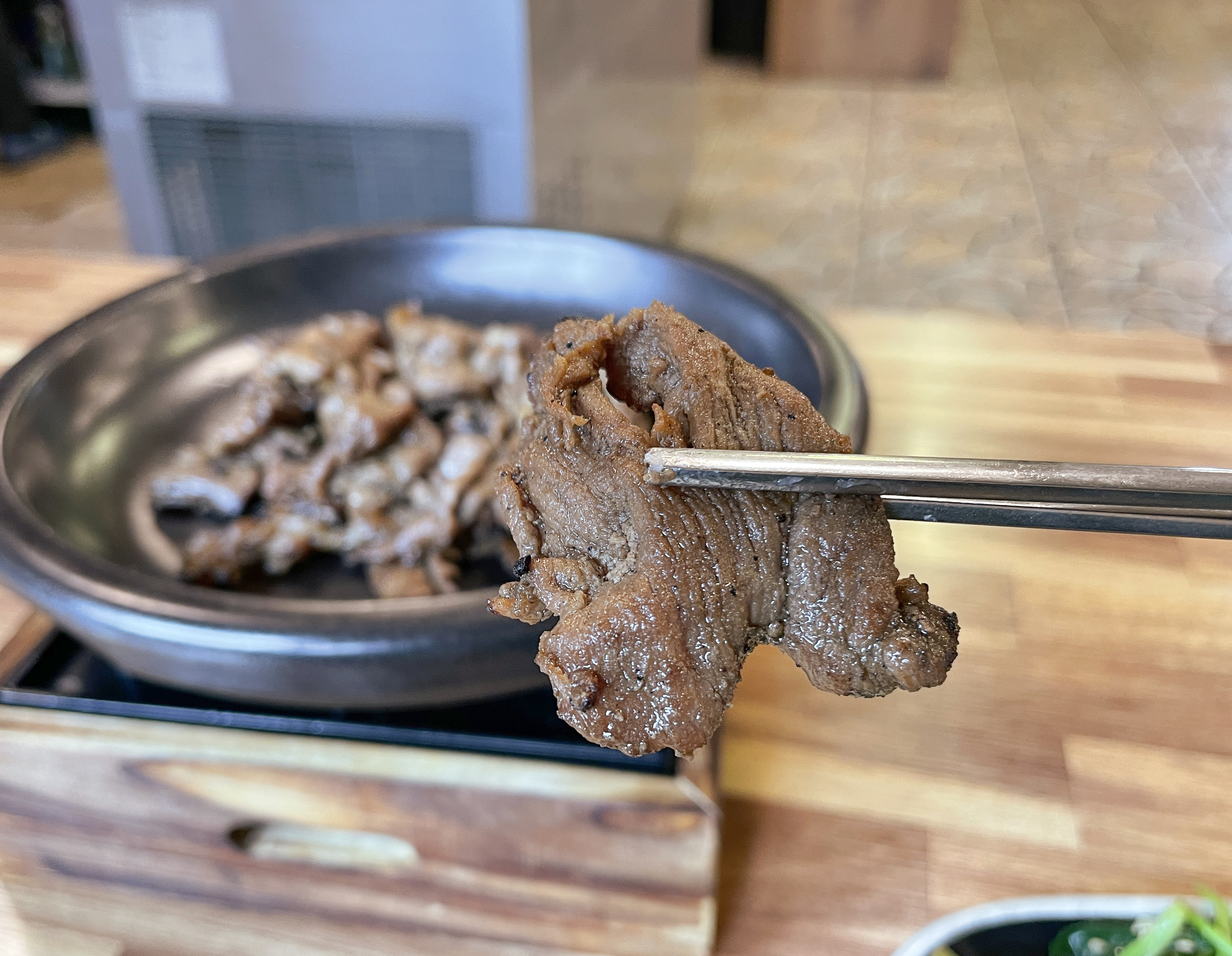 돼지 숯불구이는 기름기가 쫙 빠져 담백했고, 숯불에 구워내 은은한 불맛이 있어 맛이 좋았습니다. 고기가 식지 않도록 그릇을 데워주었는데, 양이 제 기준에 넉넉한 편은 아니었지만(?) 기본 반찬들을 양껏 먹을 수 있기 때문에 적은 양은 큰 문제가 되지는 않았습니다.