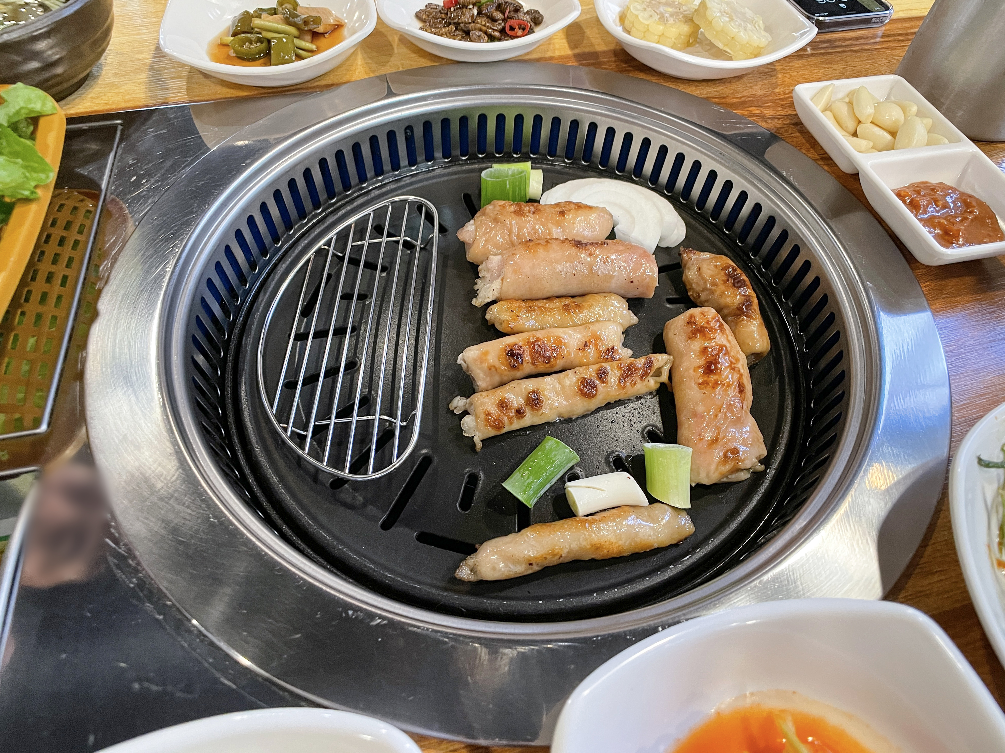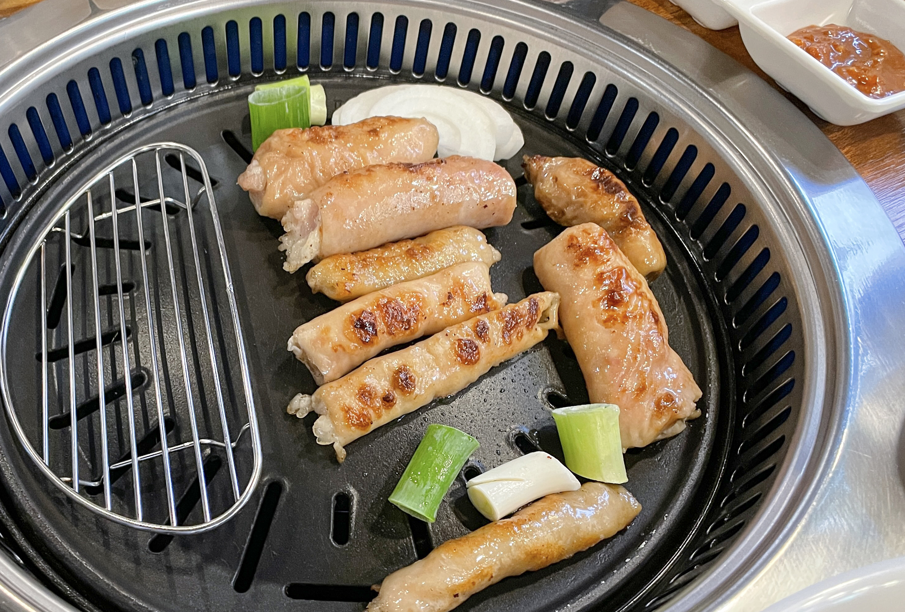 기본 상차림은 옥수수와 번데기, 장아찌, 무채, 파채, 쌈채소, 동치미 등이 나왔고, 막창을 찍어먹을 막장과 같이 곁들일 청양고추, 쪽파가 함께 나왔습니다. 아톰막창의 생막창은 1차로 초벌을 해서 나왔고, 생막창은 쫄깃하면서도 탱글한 식감과 씹을수록 고소한 맛이 잘 느껴져 맛이 좋았고 같이 제공되는 양파, 파 등과 곁들여도 맛있었습니다.