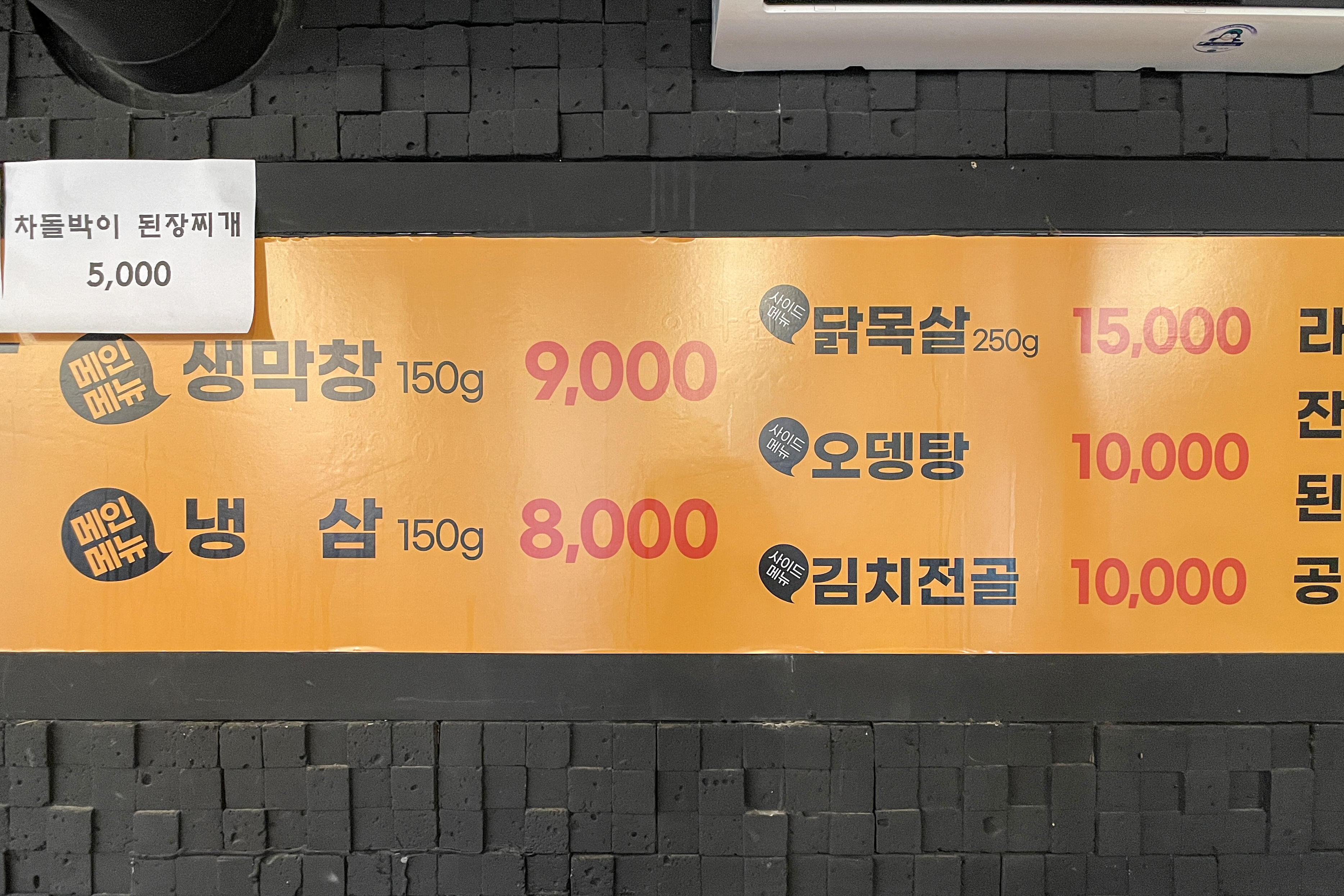 대구 국내산 생막창 맛집 아톰막창은 만화 캐릭터 아톰의 이름을 딴 가게였는데, 가게 사장님이 아톰을 좋아하시는 것 같더라고요. 아톰막창의 메뉴는 차돌박이, 생막창, 냉삼, 닭목살, 오뎅탕, 김치전골, 라면, 잔치국수, 된장찌개, 냉면 등이 있었습니다. 저희는 아톰막창의 기본 메뉴인 생막창과 닭목살, 된장찌개를 먹었습니다.