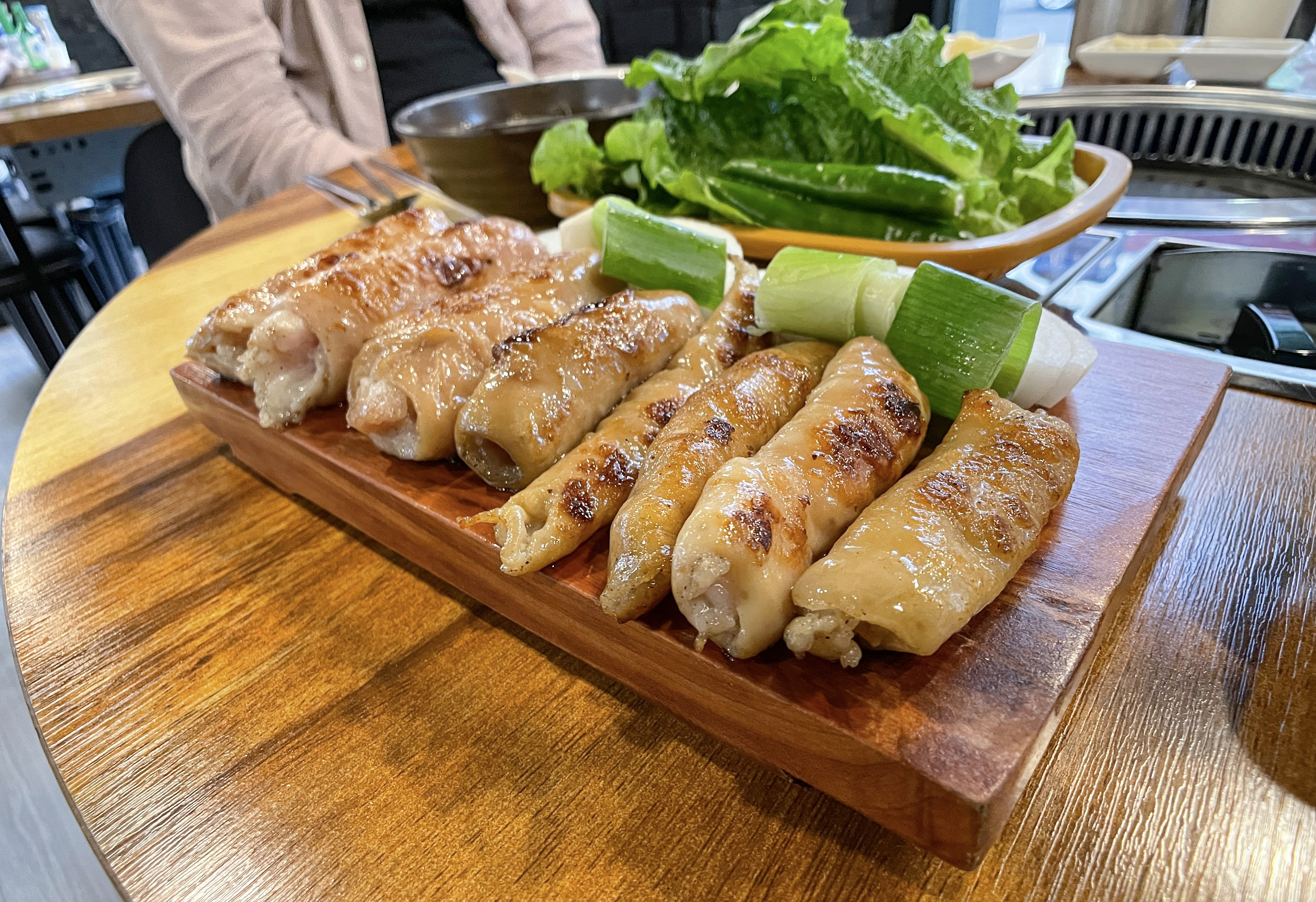 기본 상차림은 옥수수와 번데기, 장아찌, 무채, 파채, 쌈채소, 동치미 등이 나왔고, 막창을 찍어먹을 막장과 같이 곁들일 청양고추, 쪽파가 함께 나왔습니다. 아톰막창의 생막창은 1차로 초벌을 해서 나왔고, 생막창은 쫄깃하면서도 탱글한 식감과 씹을수록 고소한 맛이 잘 느껴져 맛이 좋았고 같이 제공되는 양파, 파 등과 곁들여도 맛있었습니다.