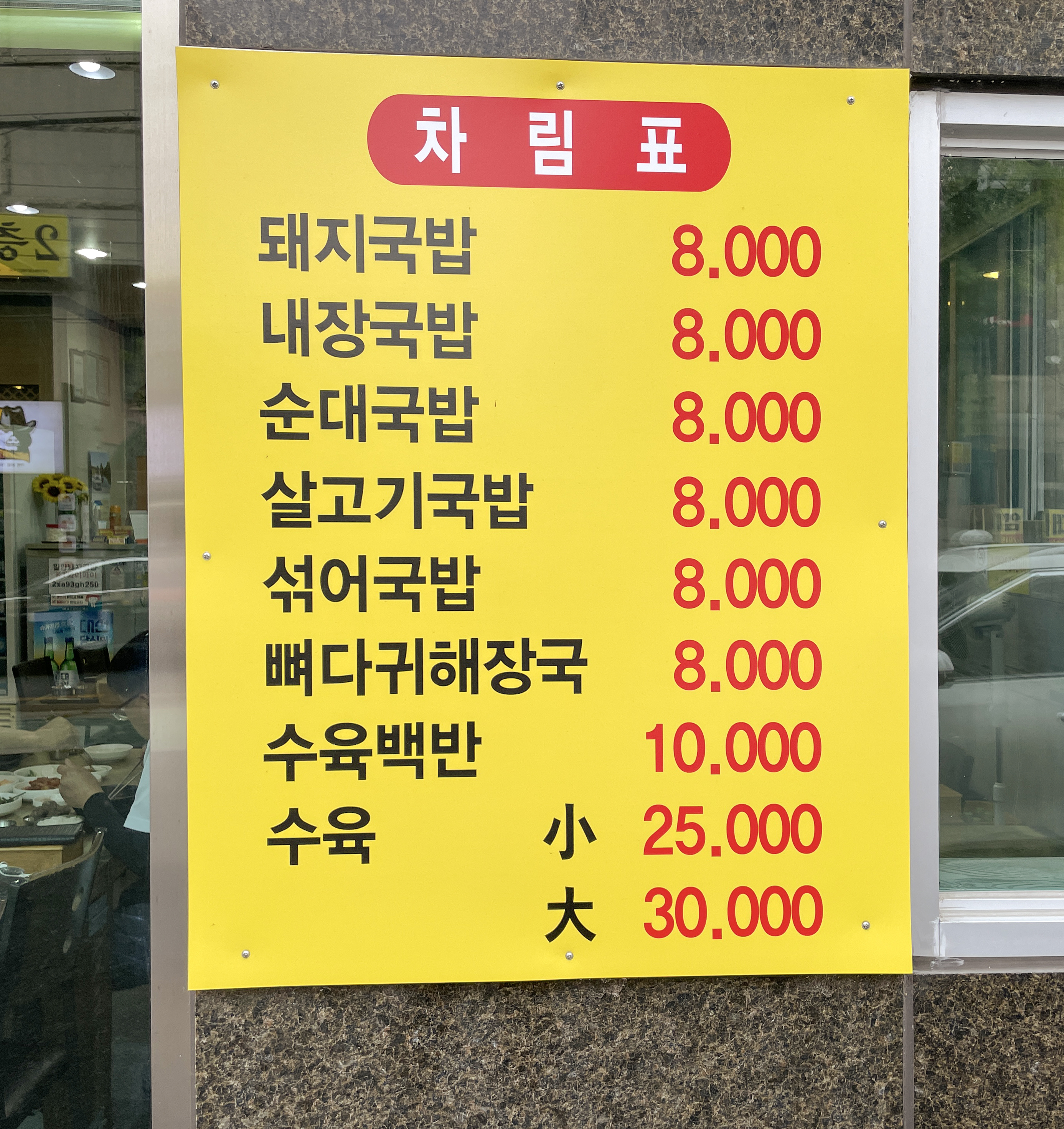 호계동 밀양돼지국밥의 메뉴는 돼지국밥, 내장국밥, 순대국밥, 살고기국밥, 섞어국밥, 뼈다귀해장국, 수육백반, 수육이 있었습니다. 가격은 국밥의 경우 8,000원의 가격에 형성되어 있었고, 수육을 주문할 경우 25,000원~ 30,000원 사이에 식사할 수 있었습니다. 저희는 기본 메뉴인 돼지국밥을 주문했습니다.