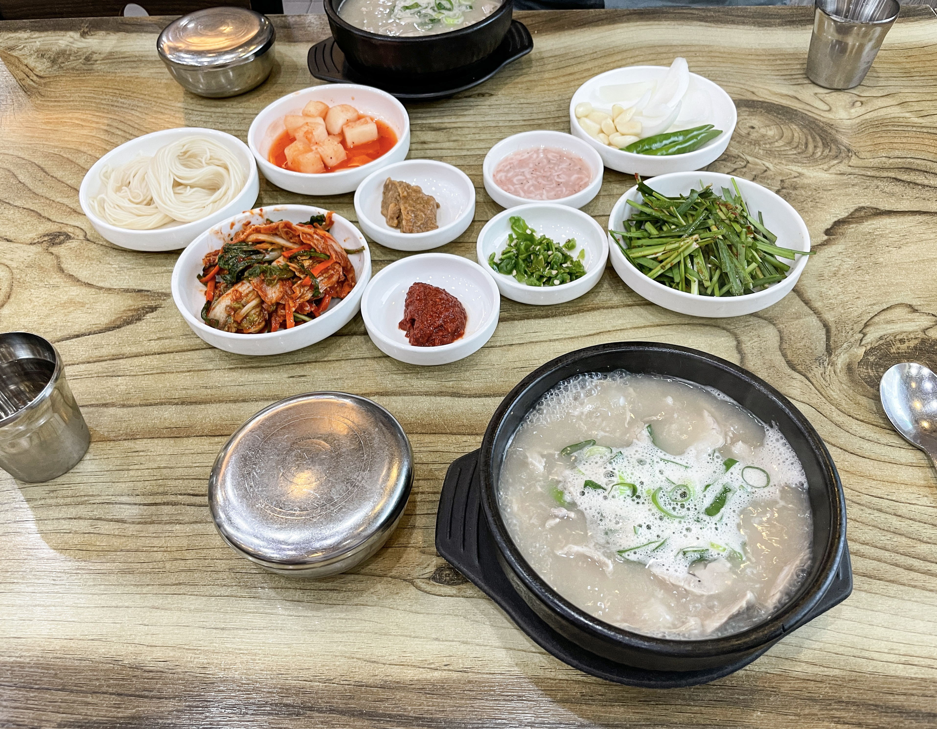 저는 종종 경상도 지역을 여행을 하게 되면 돼지국밥이나 밀면 같은 메뉴들을 먹곤 하는데, 이번 여행에서 돼지국밥을 선택한 것도 그런 이유에서였죠. 밀양돼지국밥의 돼지국밥에는 새우젓과 청양고추, 부추무침, 배추김치, 깍두기, 소면 등이 나왔습니다. 기호에 따라서 돼지국밥에 새우젓을 넣거나 부추무침을 곁들이면 좋았고, 매콤하게 먹는 것을 선호하신다면 청양고추를 같이 곁들여도 좋을 것 같았습니다.