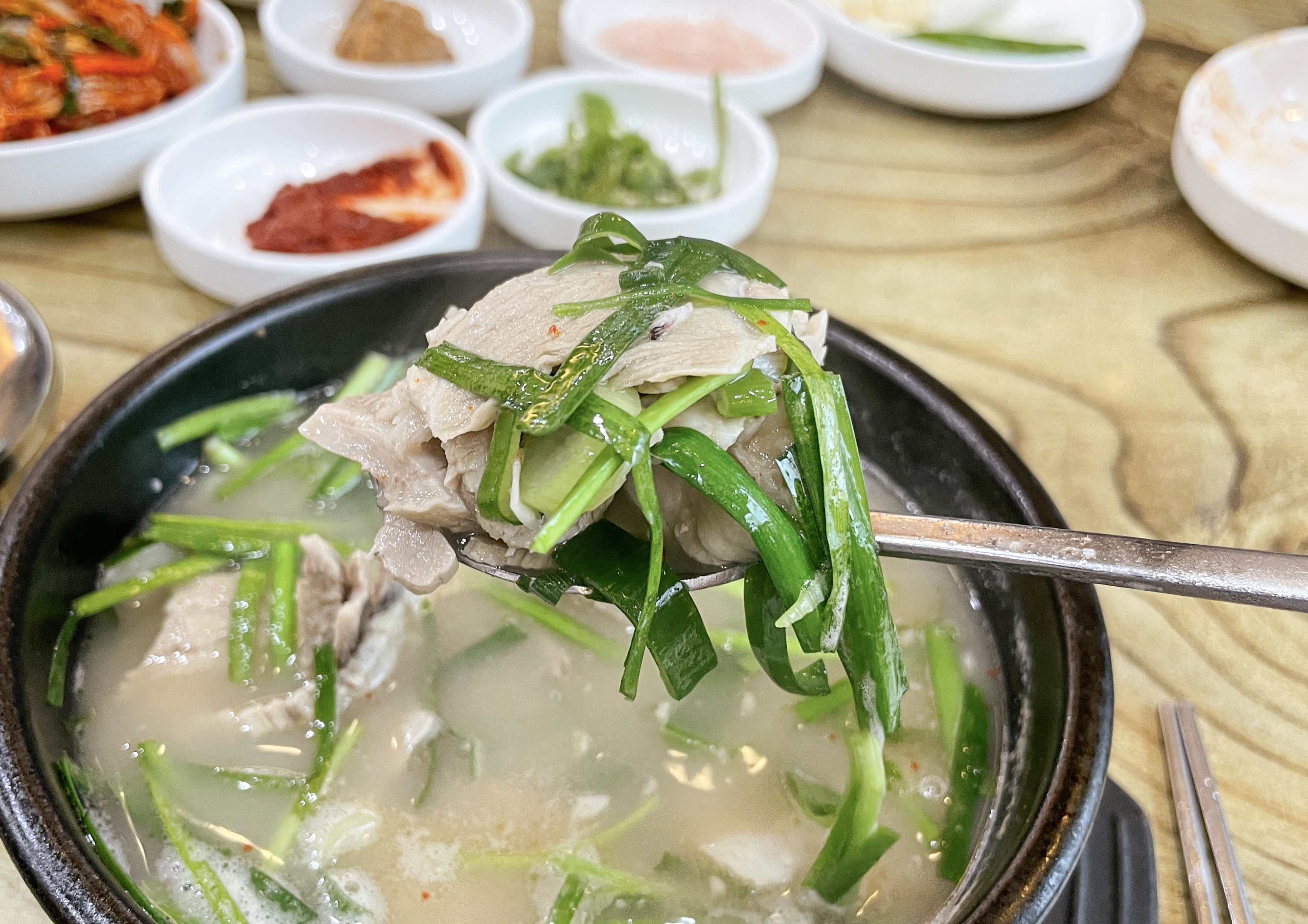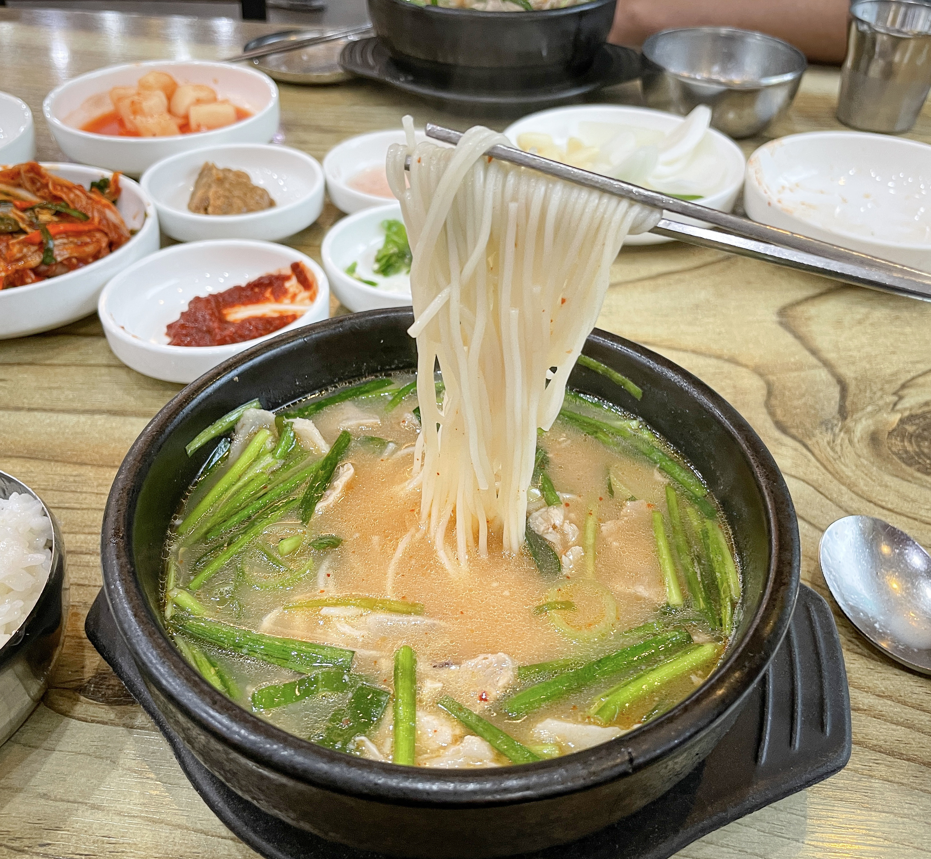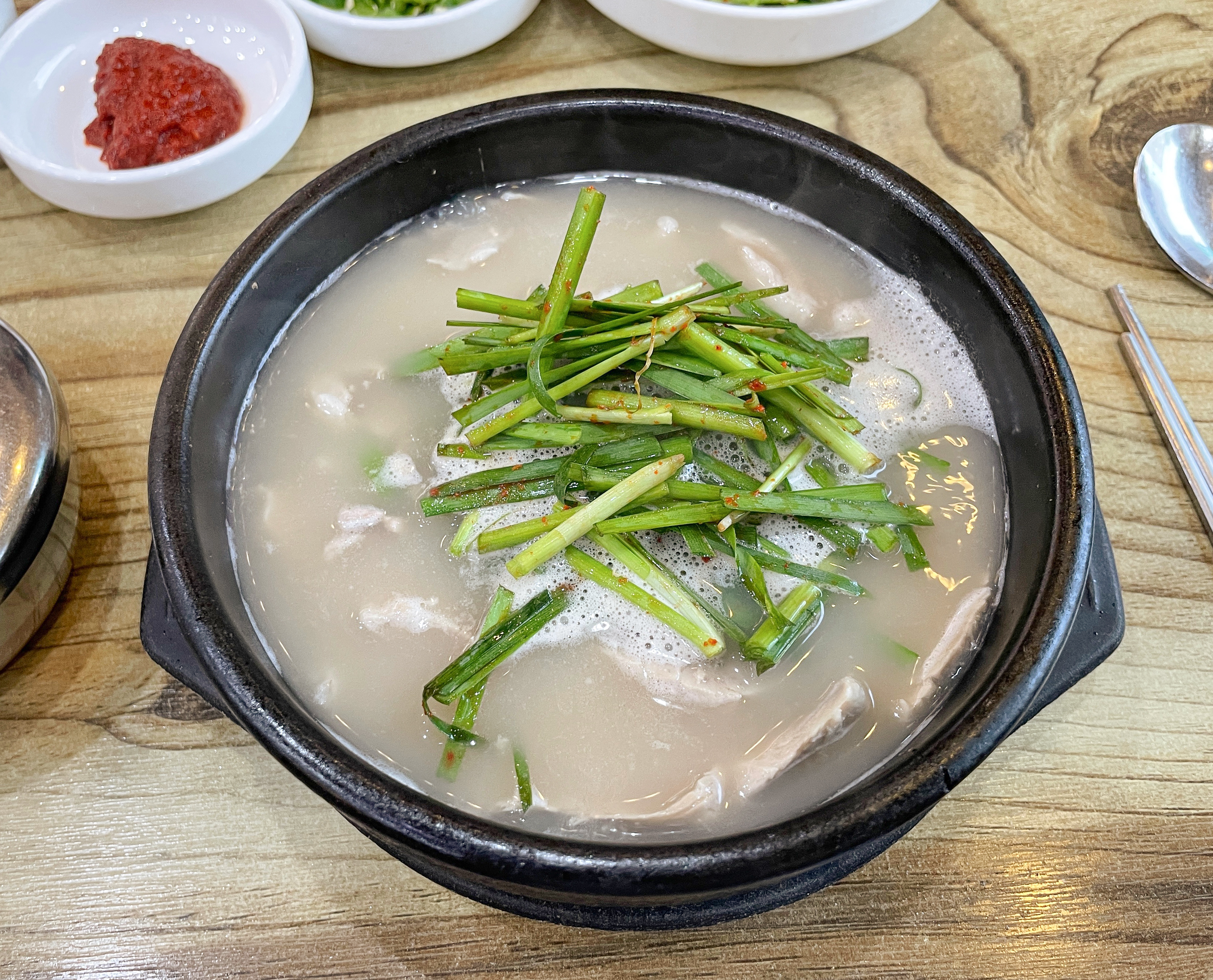 저는 종종 경상도 지역을 여행을 하게 되면 돼지국밥이나 밀면 같은 메뉴들을 먹곤 하는데, 이번 여행에서 돼지국밥을 선택한 것도 그런 이유에서였죠. 밀양돼지국밥의 돼지국밥에는 새우젓과 청양고추, 부추무침, 배추김치, 깍두기, 소면 등이 나왔습니다. 기호에 따라서 돼지국밥에 새우젓을 넣거나 부추무침을 곁들이면 좋았고, 매콤하게 먹는 것을 선호하신다면 청양고추를 같이 곁들여도 좋을 것 같았습니다.