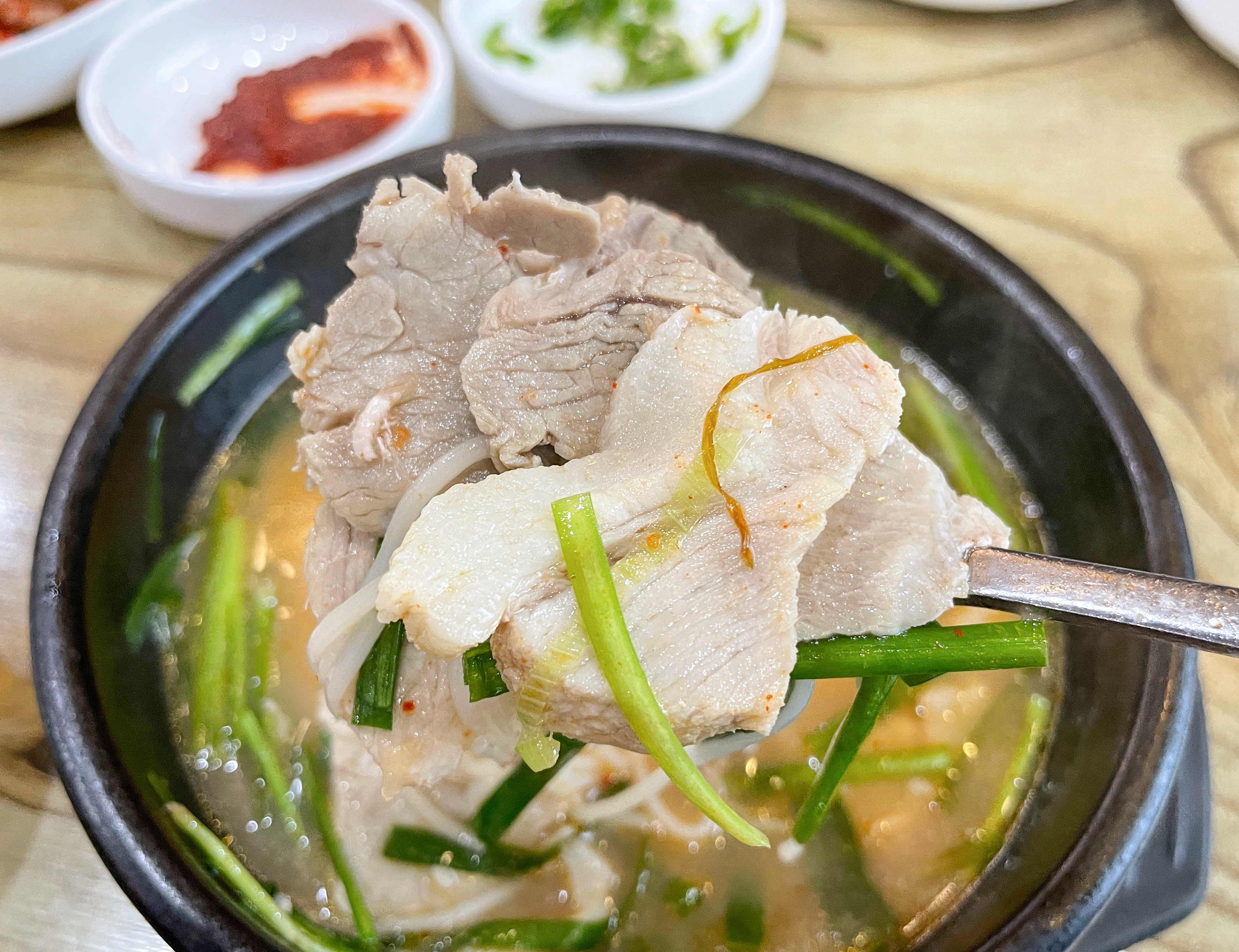 저는 일단 돼지국밥에 돼지고기를 어느 정도 건져먹고 소면을 같이 넣어서 먹었습니다. 밀양돼지국밥의 국물은 진한 편이었는데, 돼지고기는 담백하지만 약간 퍽퍽한 느낌이 있었습니다.