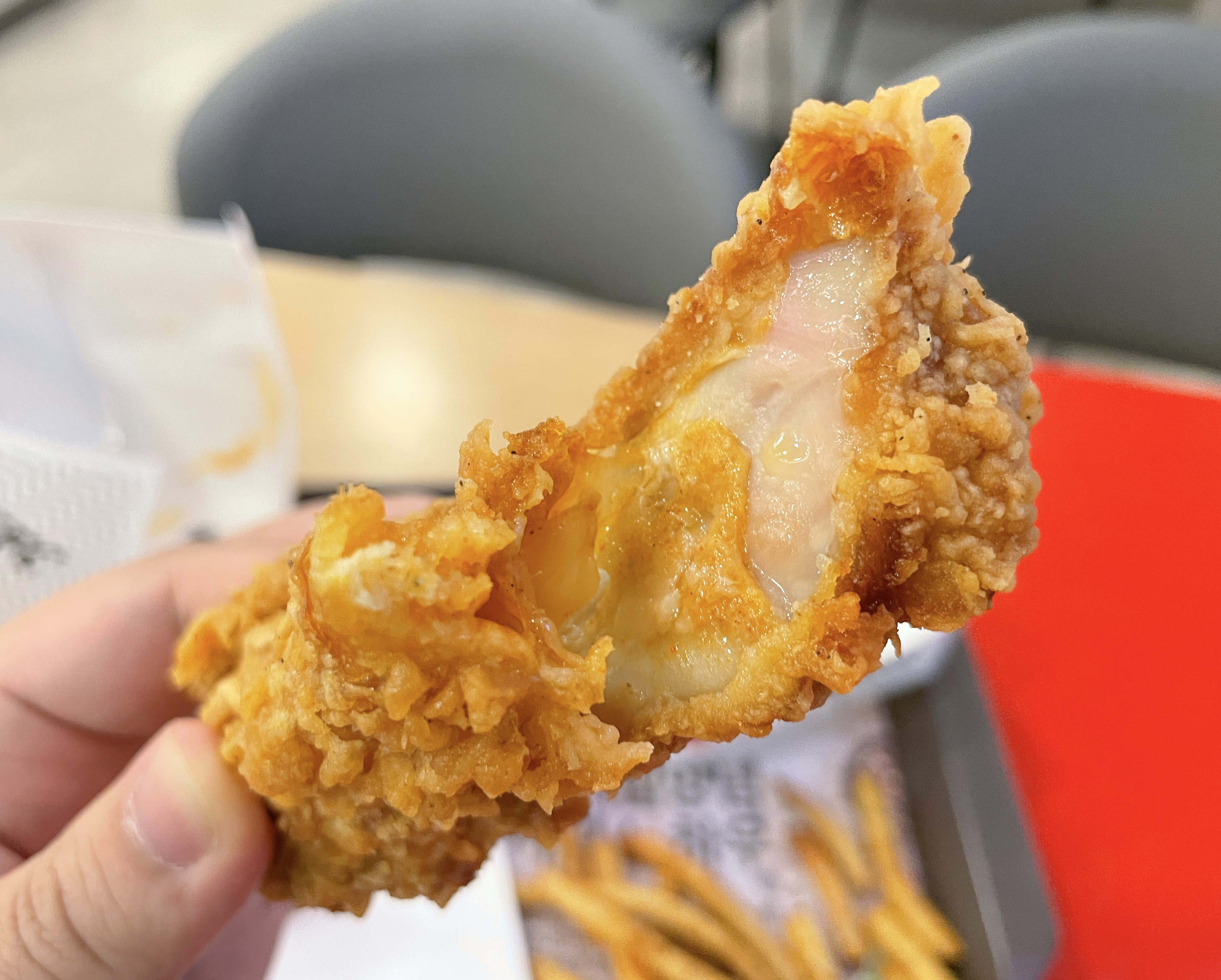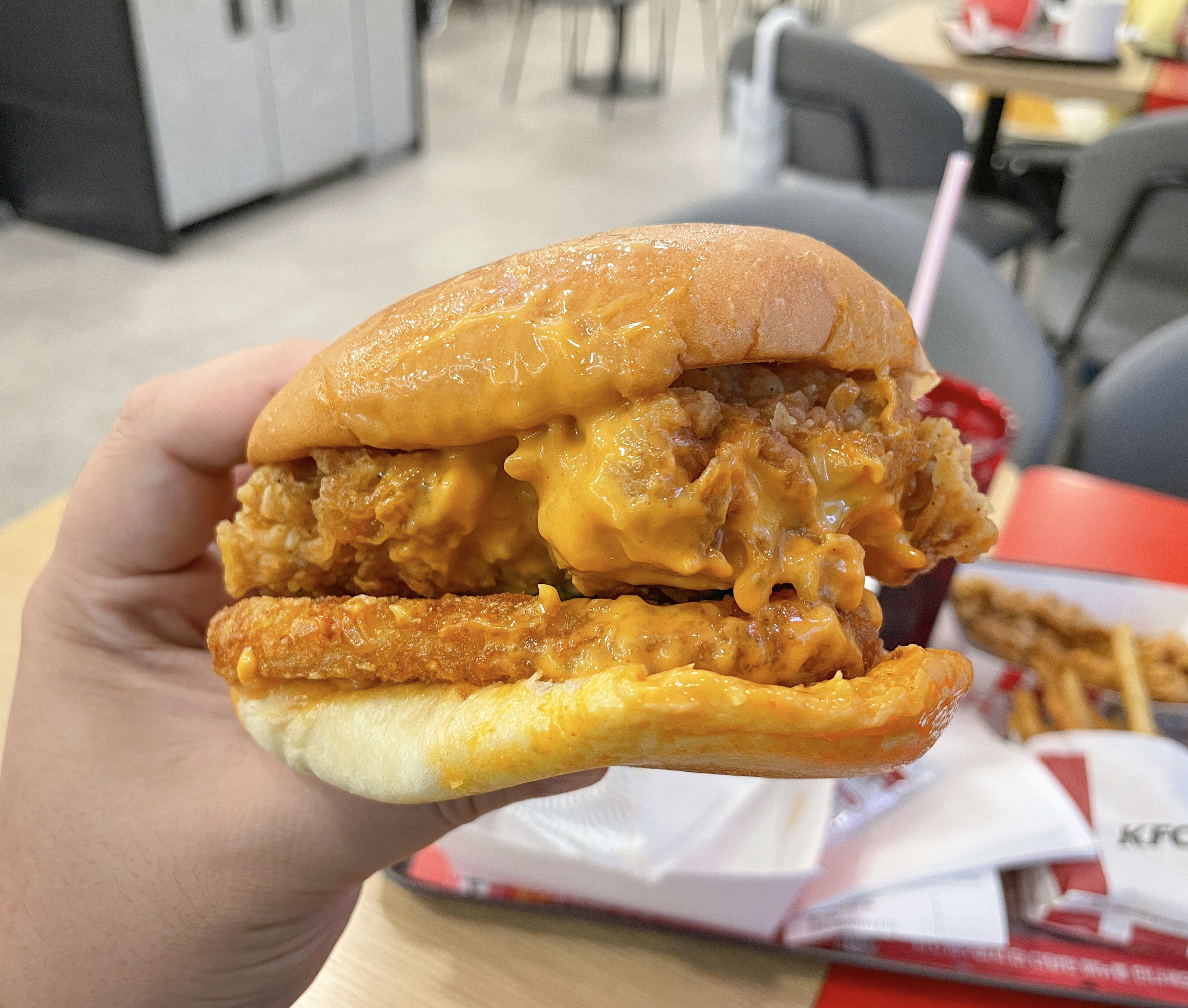 KFC 신메뉴 스콜쳐버거의 모습은 이렇습니다. 닭다리살 패티와 해시브라운, 피클, 스콜쳐 소스가 들어간 메뉴였는데, 저는 처음엔 별 기대 없이 먹었는데 "왜 글로벌 판매 1위인 메뉴를 이제 출시한거야?" 라는 생각이 들 정도로 매콤하면서 맛있었습니다. 부드러운 닭다리살 패티와 해시브라운 그리고 매콤한 소스가 첫맛은 화끈하게 매웠는데, 먹을수록 재료들과 잘 어울렸고 맛도 좋았습니다.