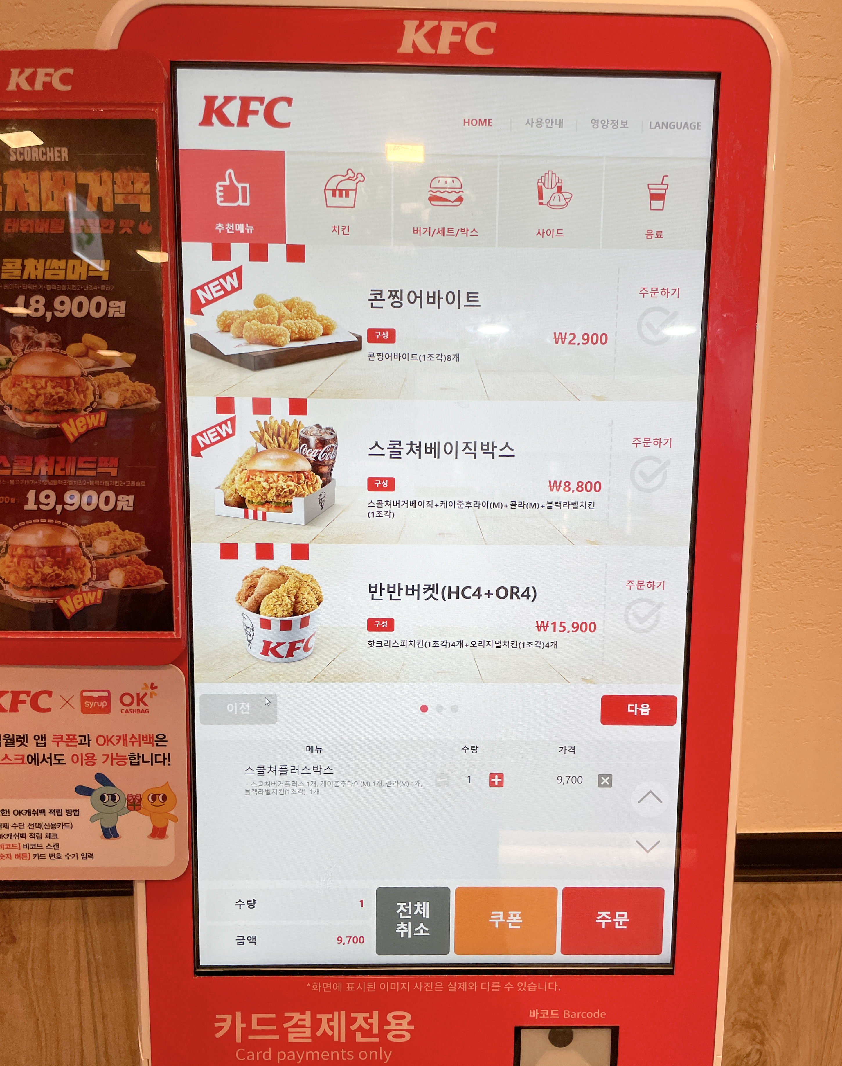 키오스크를 통해 스콜쳐버거를 주문했습니다. 스콜쳐 버거의 메뉴는 스콜쳐베이직박스, 스콜쳐플러스박스, 스콜쳐썸머팩, 스콜쳐레드팩 이 있었습니다. 제가 주문한 메뉴는 스콜쳐플러스박스로 가격은 9,700원 이었습니다. 이번에 KFC에서 스페셜 굿즈로 'KFC 쿨러' 이벤트도 한다고 하는데, 생각보다 기준이 까다로워서 도전하지는 않았습니다.