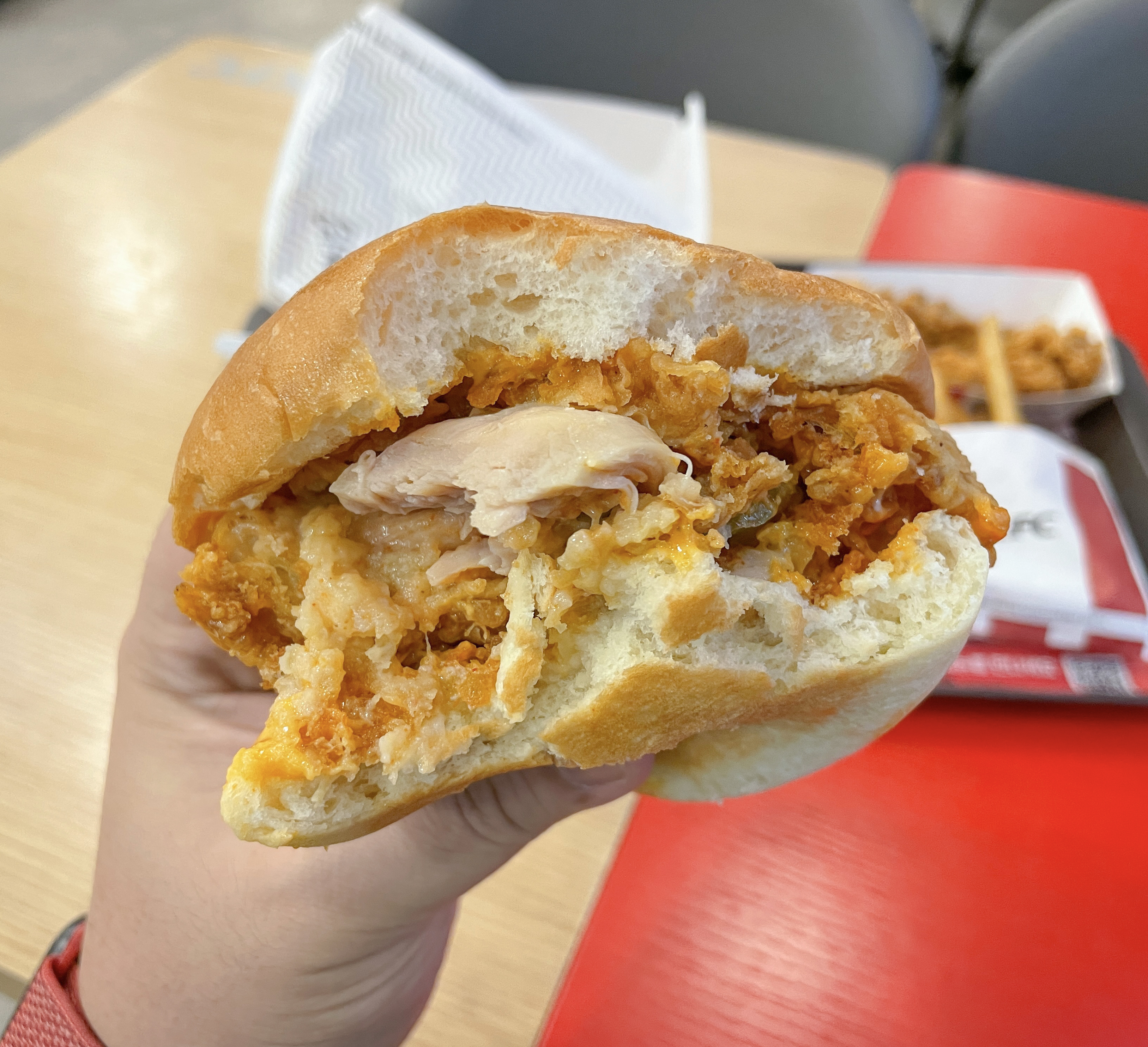 KFC 신메뉴 스콜쳐버거의 모습은 이렇습니다. 닭다리살 패티와 해시브라운, 피클, 스콜쳐 소스가 들어간 메뉴였는데, 저는 처음엔 별 기대 없이 먹었는데 "왜 글로벌 판매 1위인 메뉴를 이제 출시한거야?" 라는 생각이 들 정도로 매콤하면서 맛있었습니다. 부드러운 닭다리살 패티와 해시브라운 그리고 매콤한 소스가 첫맛은 화끈하게 매웠는데, 먹을수록 재료들과 잘 어울렸고 맛도 좋았습니다.