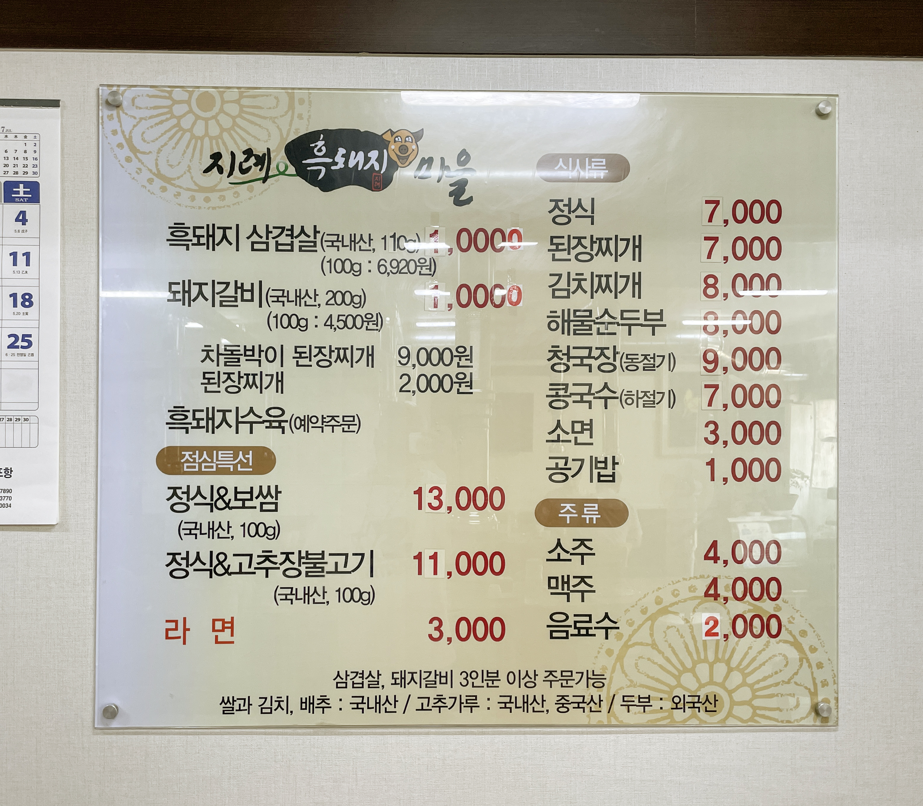 포항 지례흑돼지마을은 경북 포항시 남구 상도동 18-271, 1층에 위치한 가게이고, 주차공간은 협소한 편인데 가게 앞이나 인근에 주차하면 되었습니다. 메뉴는 흑돼지삼겹살, 돼지갈비, 흑돼지수육, 보쌈정식, 고추장불고기정식, 라면, 정식, 된장찌개, 김치찌개, 해물순두부, 청국장, 콩국수, 소면 등이 있었습니다. 저는 고추장불고기정식을 주문했습니다.