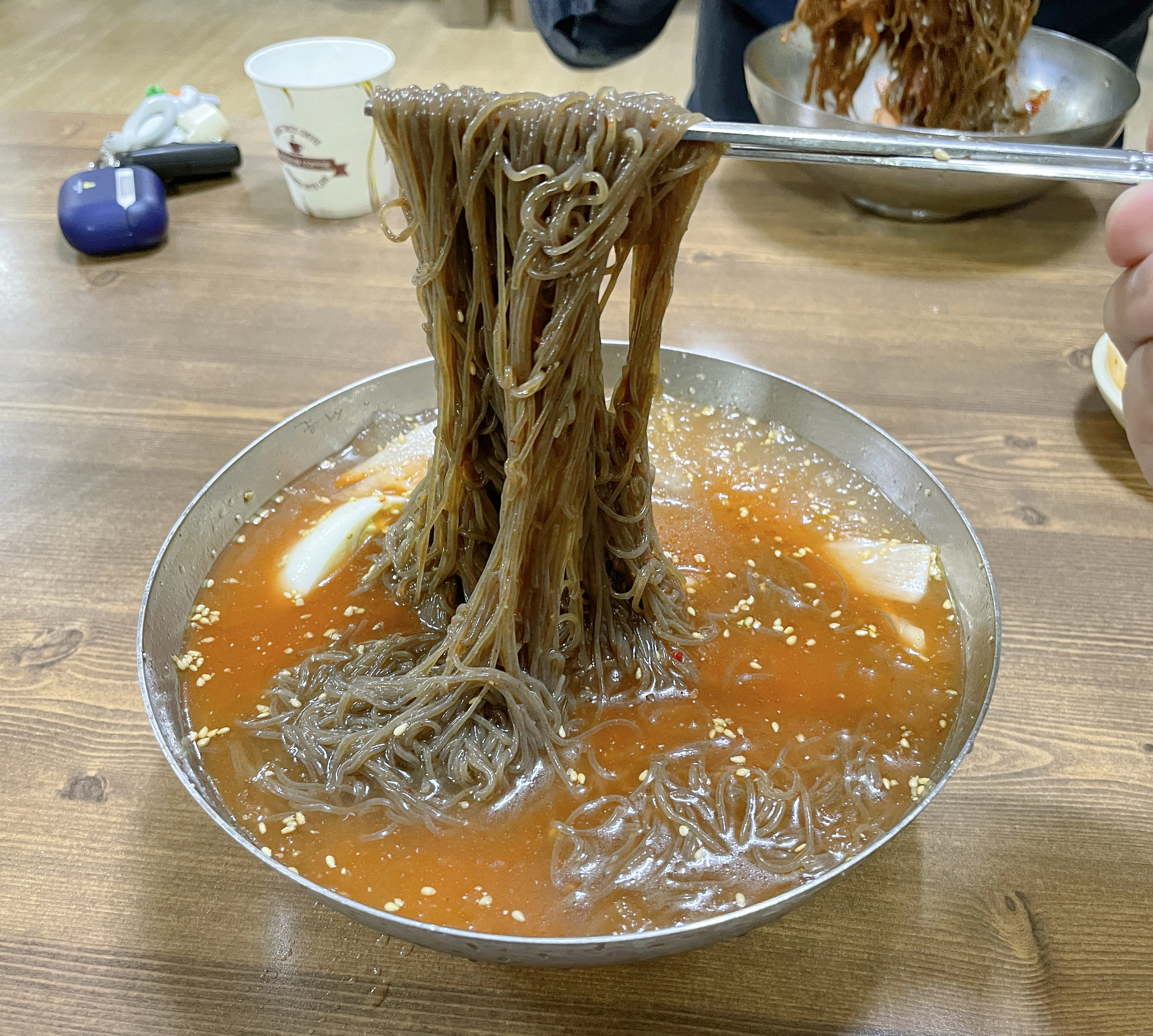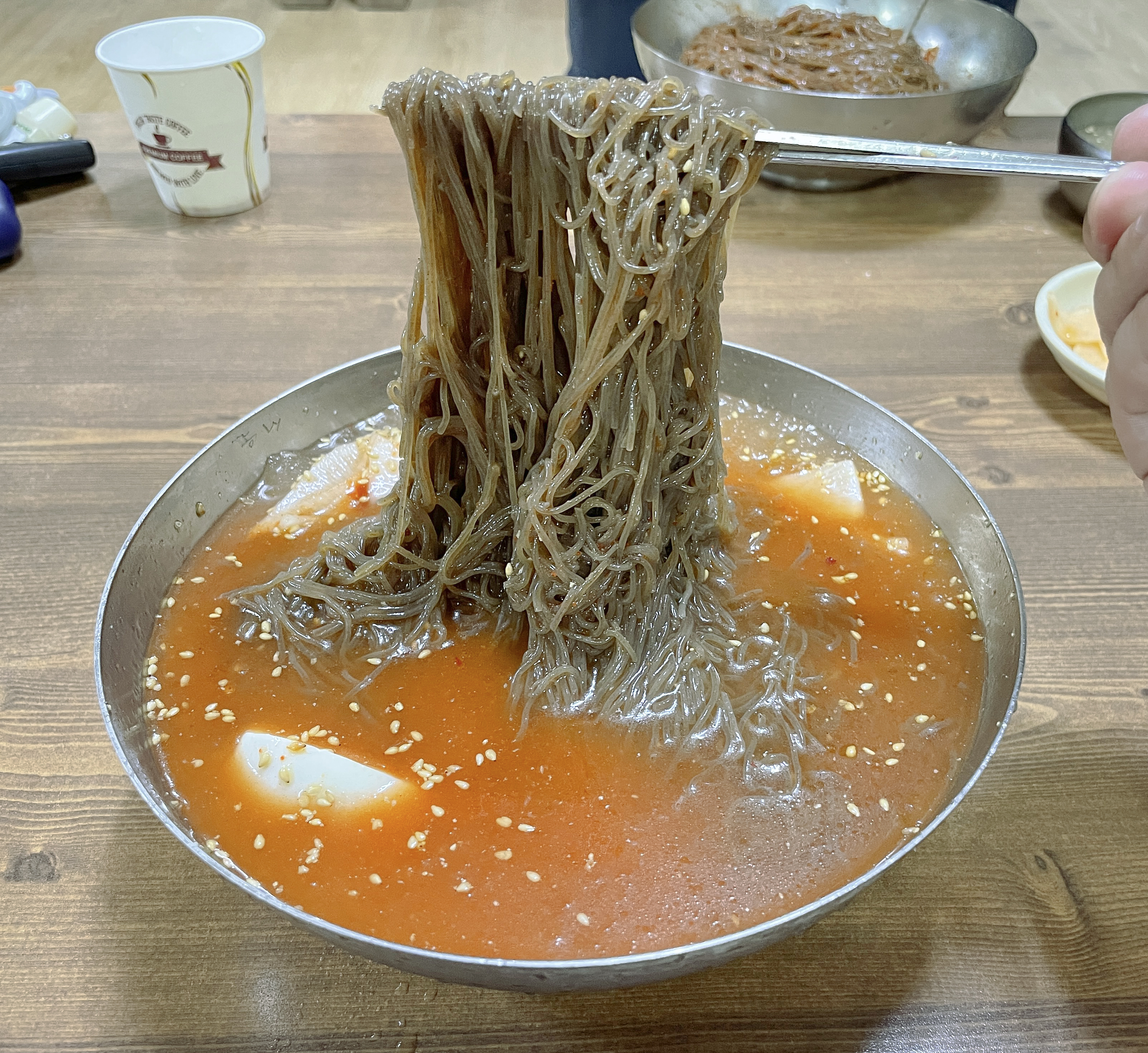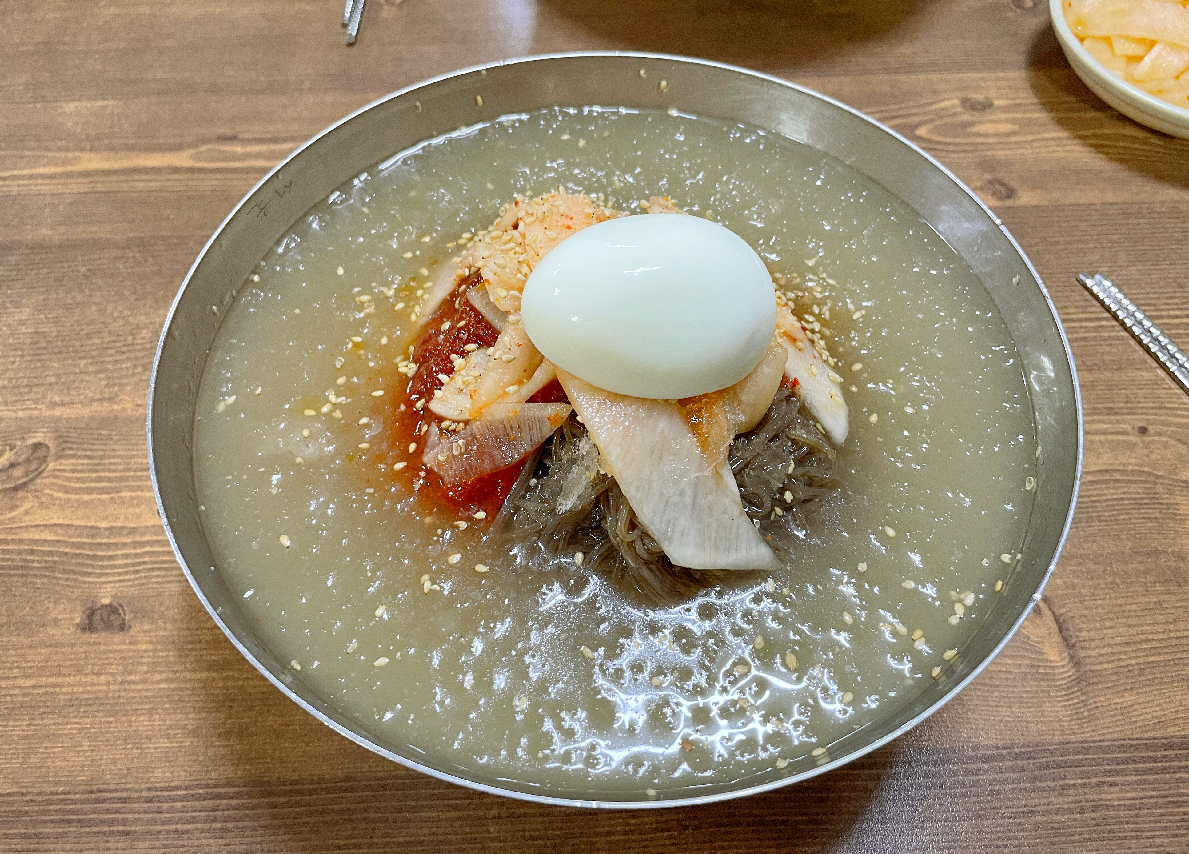 주문한 비빔냉면과 물냉면이 나왔습니다. 비빔냉면은 매콤 고소한 양념장에 무생채가 올라가 새콤함을 더해주었고, 물냉면은 육수에 살얼음을 동동 띄워서 시원함을 더해주었습니다. 면발도 꽤 많이 있어서 하나만 먹어도 배가 부를 것 같더라고요.
