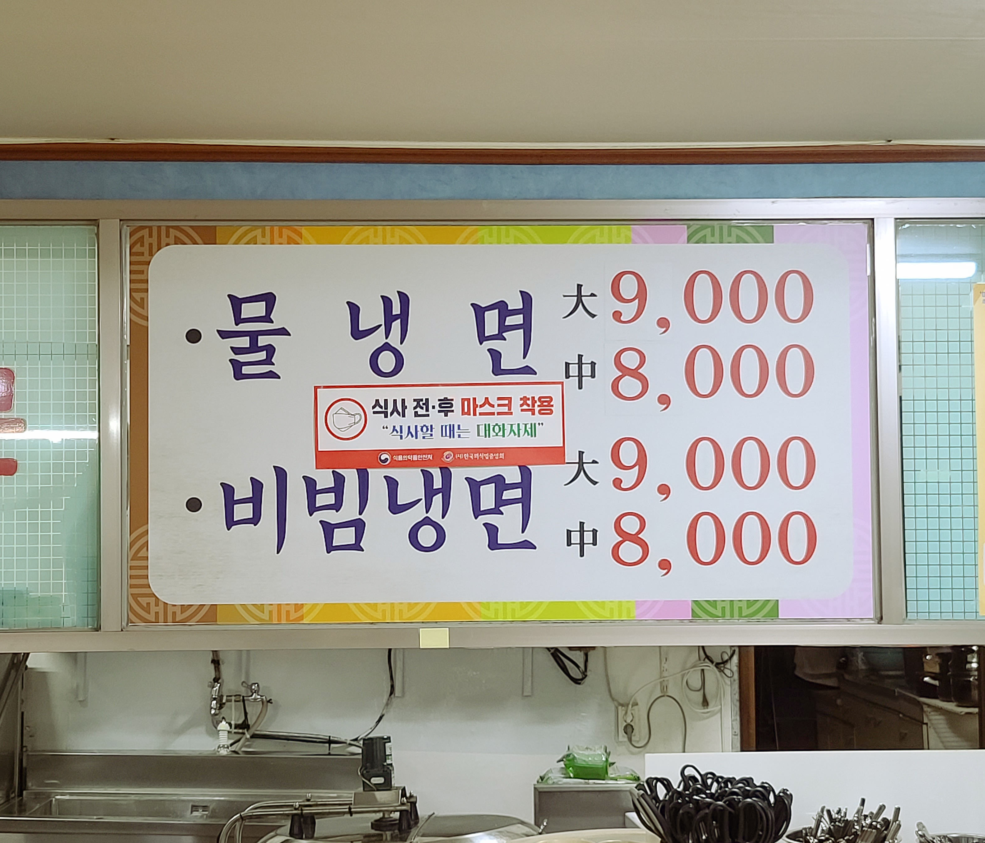 유촌칡냉면의 메뉴는 단순하게 물냉면, 비빔냉면 두 가지가 있었고 대 자는 9,000원, 중 자는 8,000원 이었습니다. 저와 친구는 물냉면과 비빔냉면을 주문하였습니다.