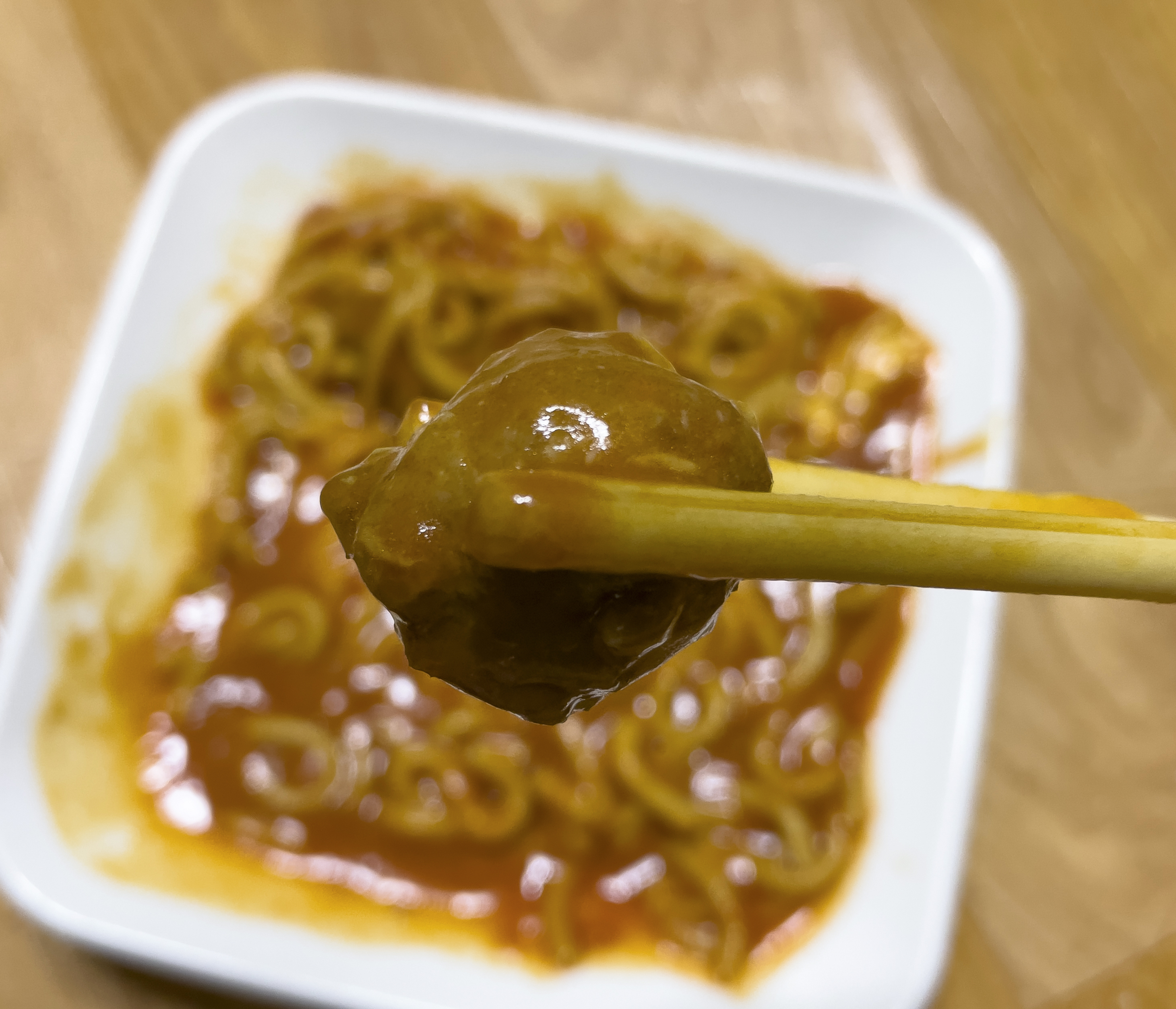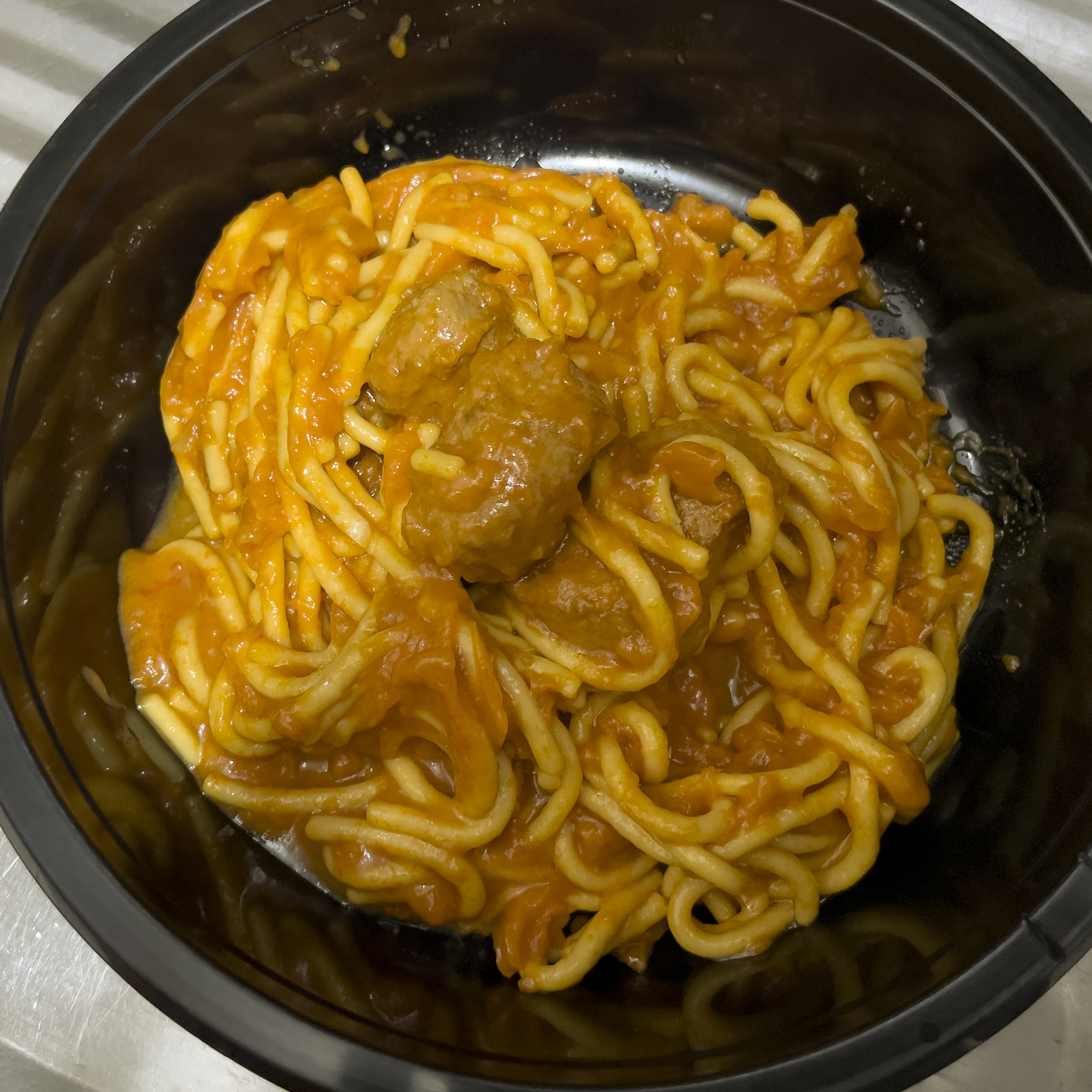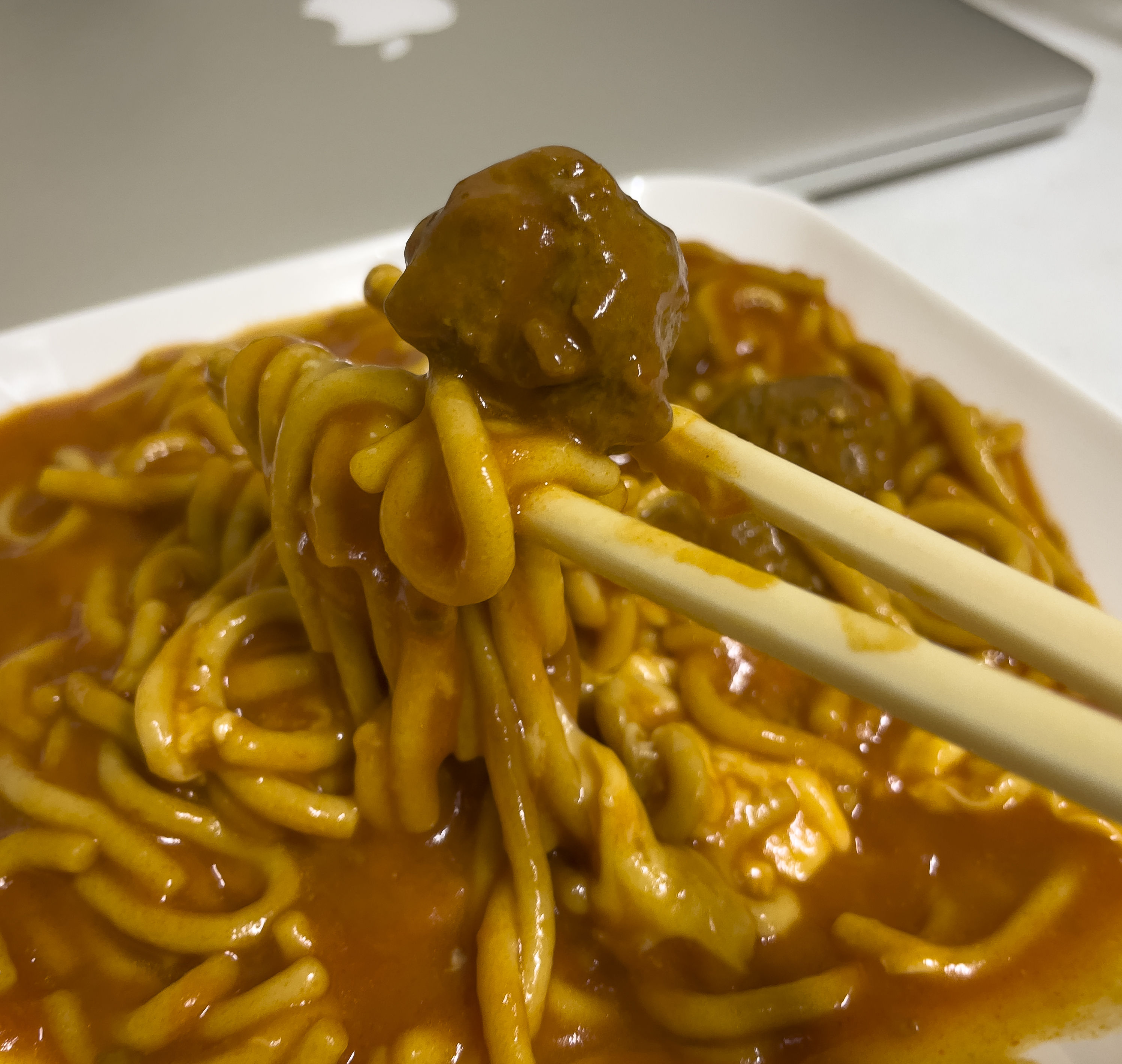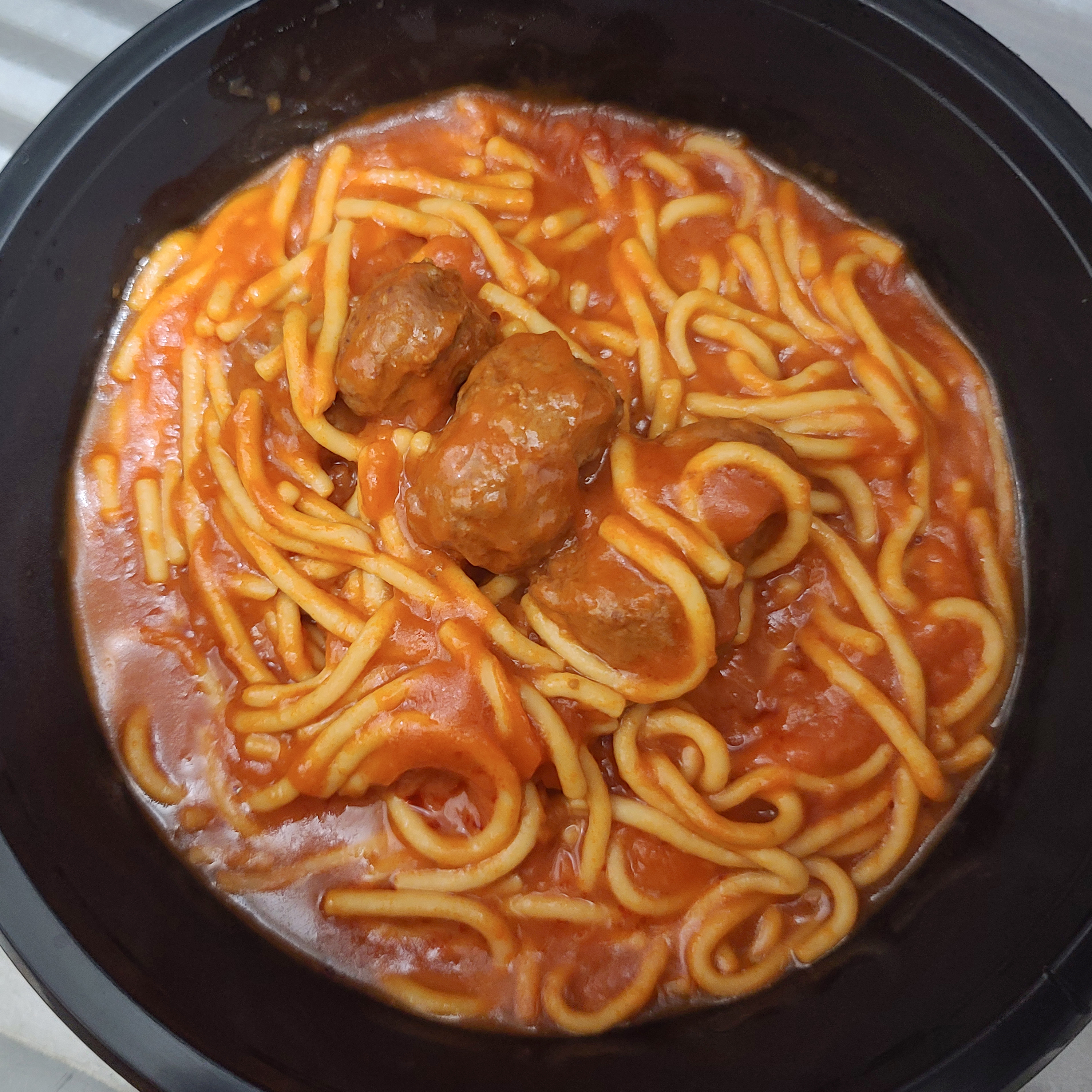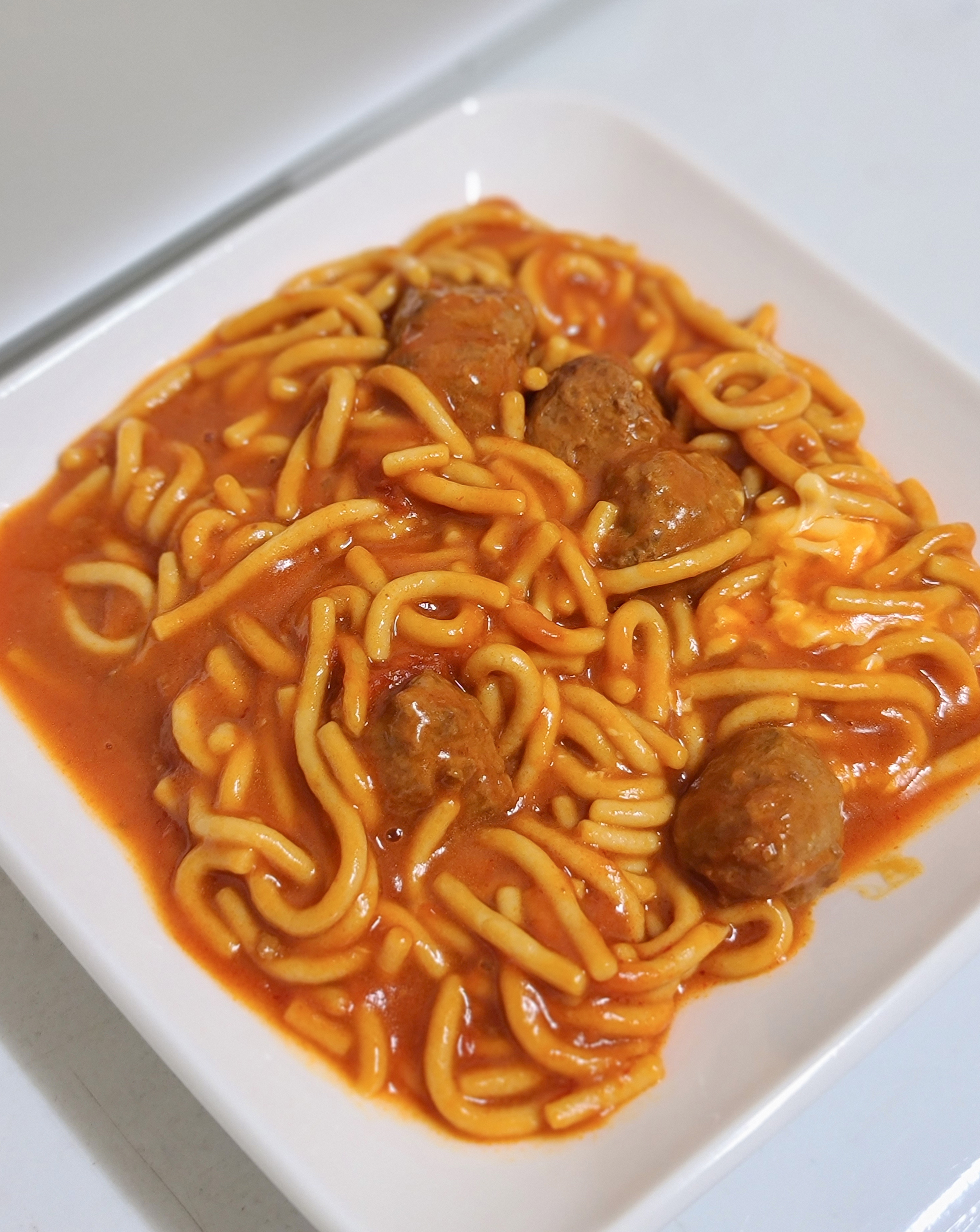 미트볼은 식감이 약간 무른 느낌이 있었지만, 양이 꽤 많이 들어있어서 좋았습니다. 전체적인 맛 평가를 하자면 예전에 학교 다닐 때 급식에서 먹었던 것 같은 퀄리티, 대신 면이 좀 쉽게 풀어지고 짧다는 게 아쉬웠던 그런 제품이었습니다.