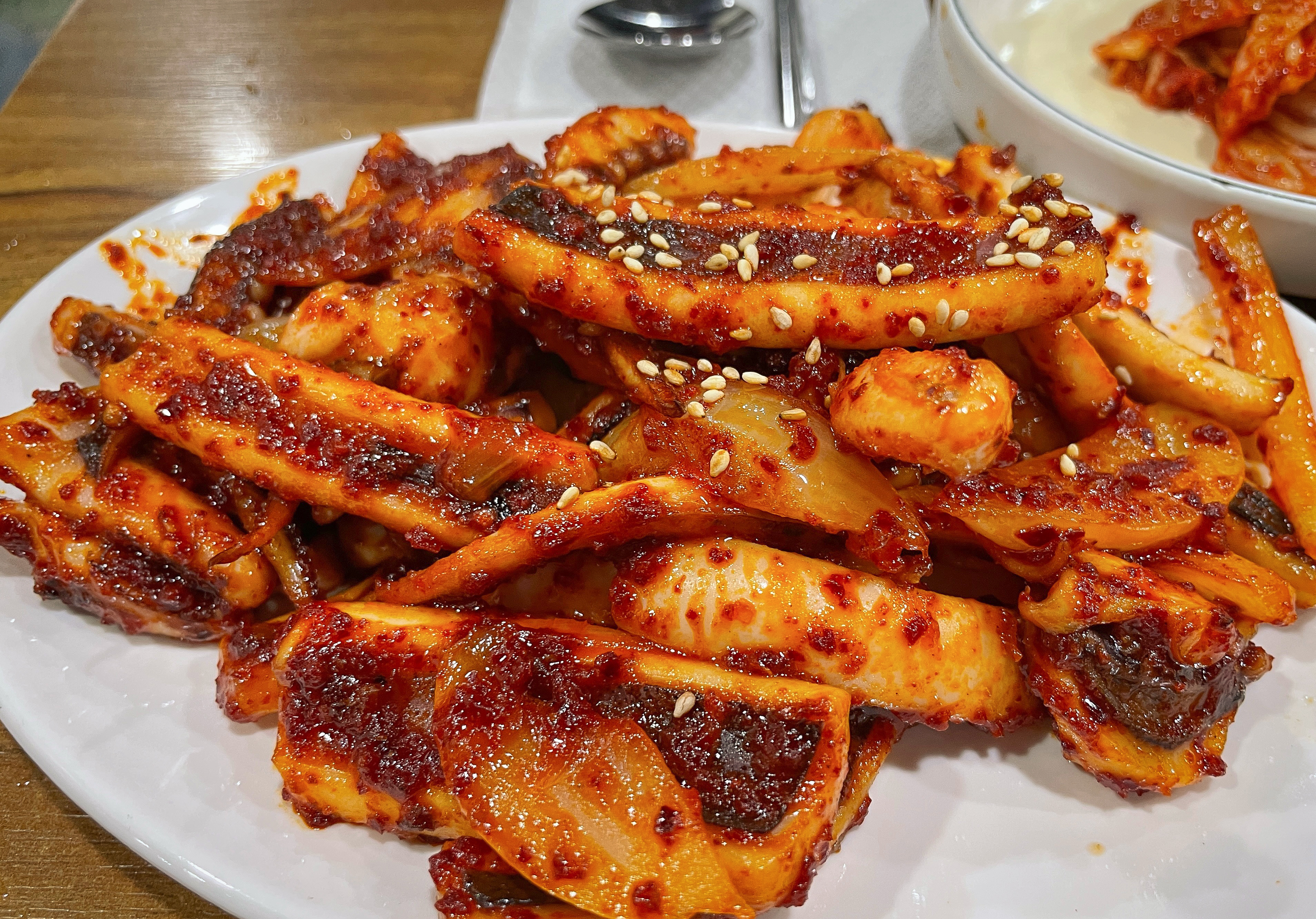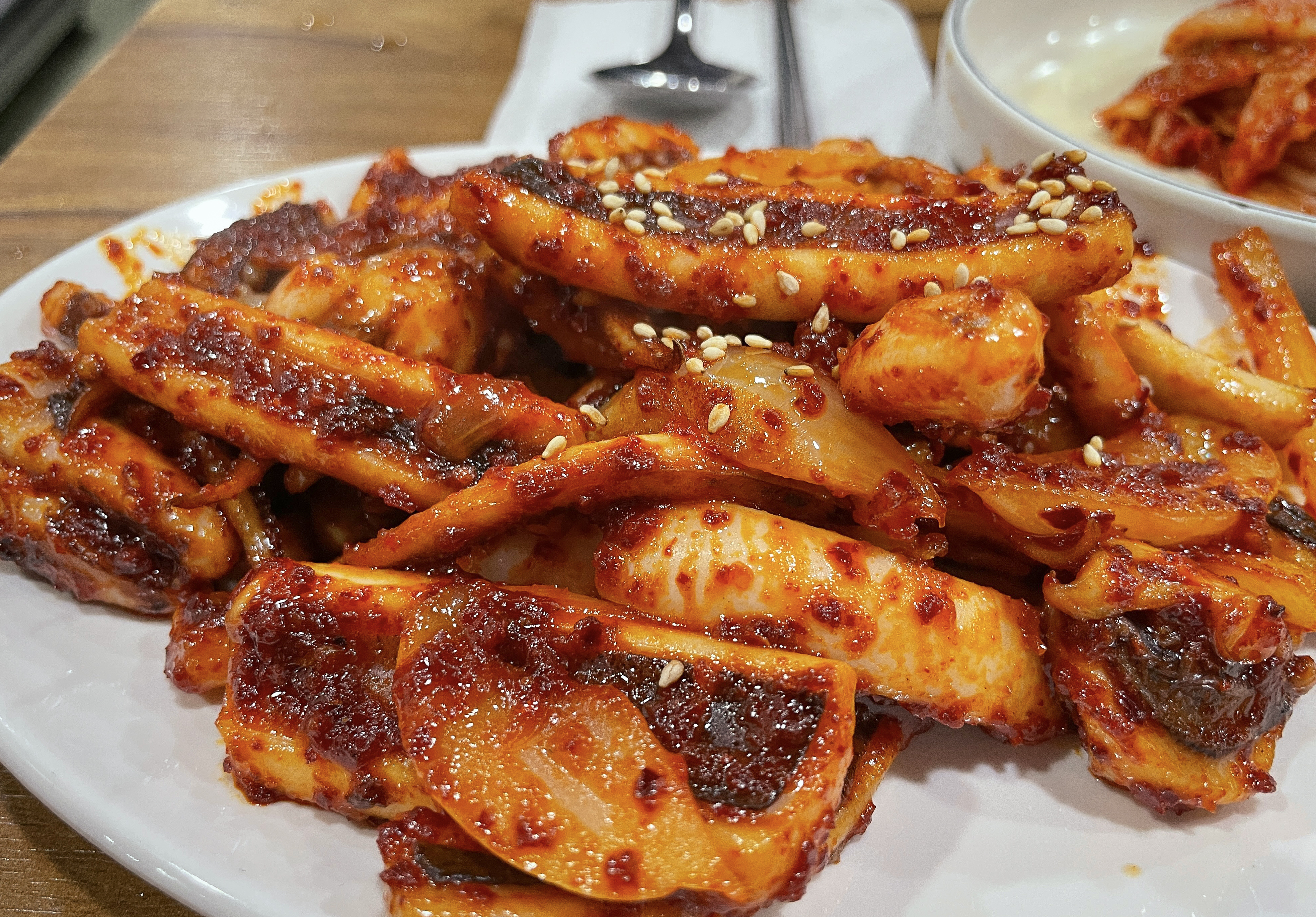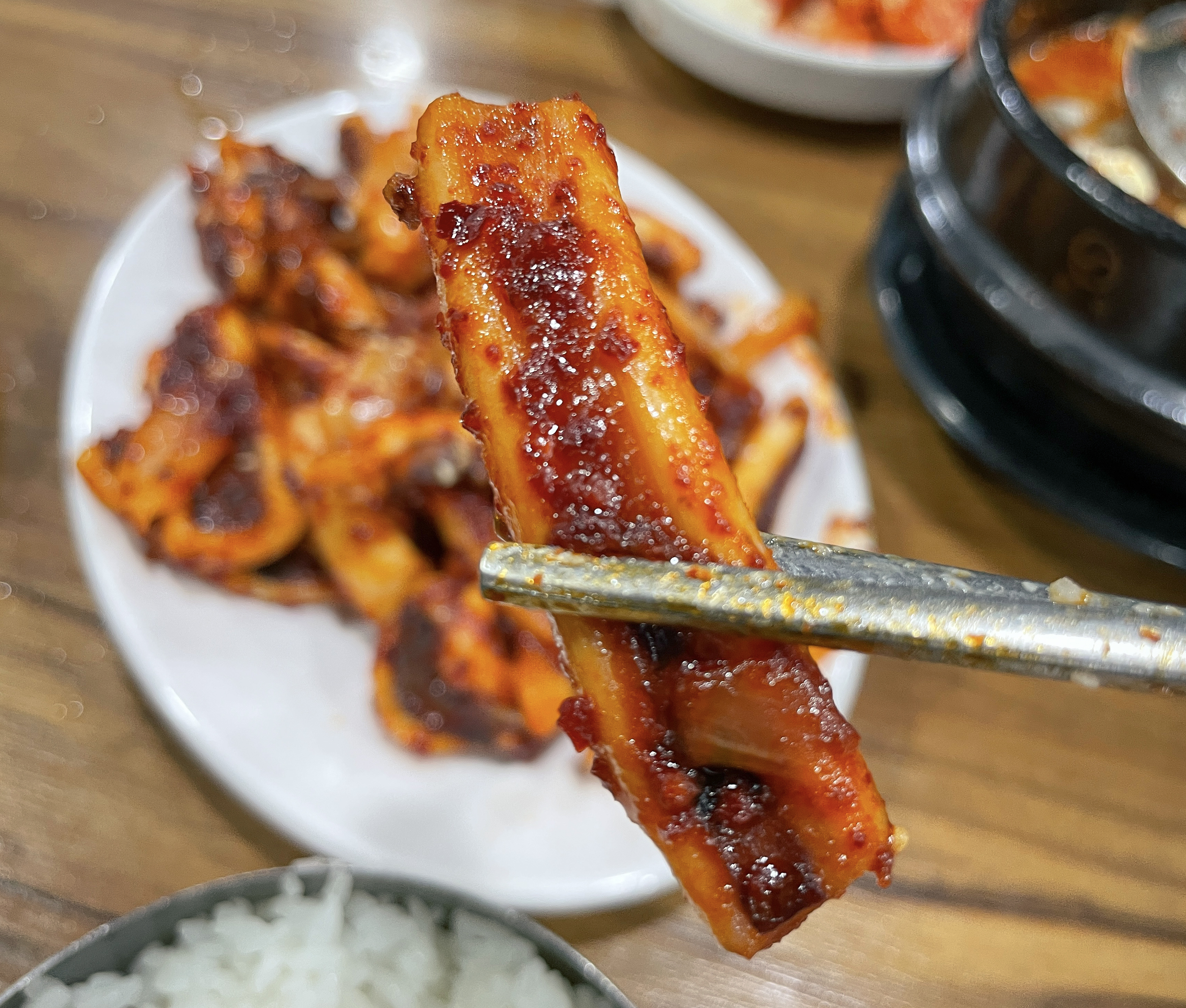 덕수정의 오징어볶음은 원래는 불판 위에 각종 채소와 함께 볶아먹는 형태였지만, 현재는 미리 볶아내 오는 형태로 바뀐 거라고 하시더라고요. 불판에 볶아먹는 것도 좋겠지만, 미리 볶아져 나오는 오징어볶음은 먹기에 편해서 좋더라고요.