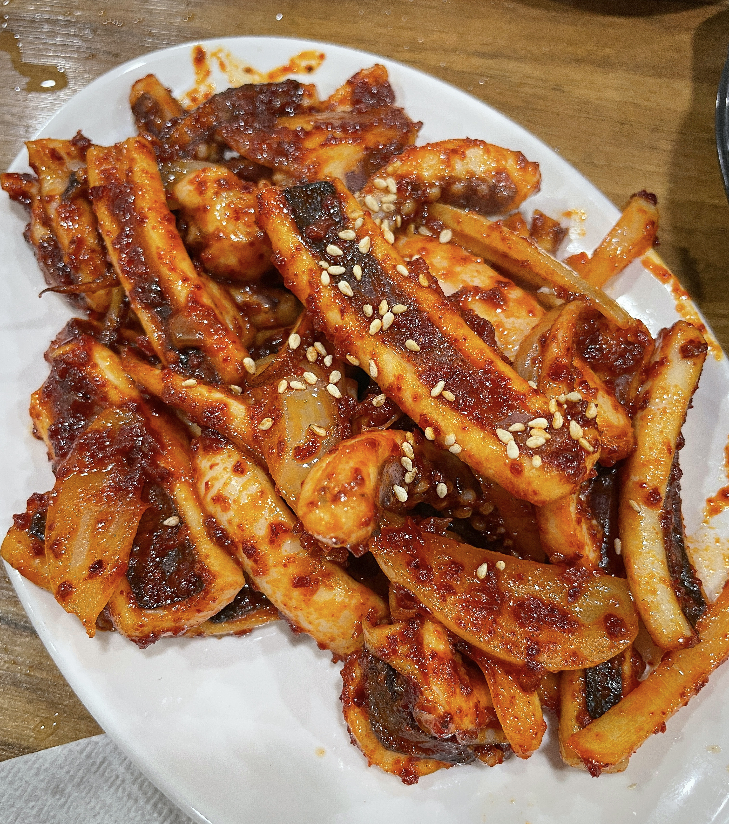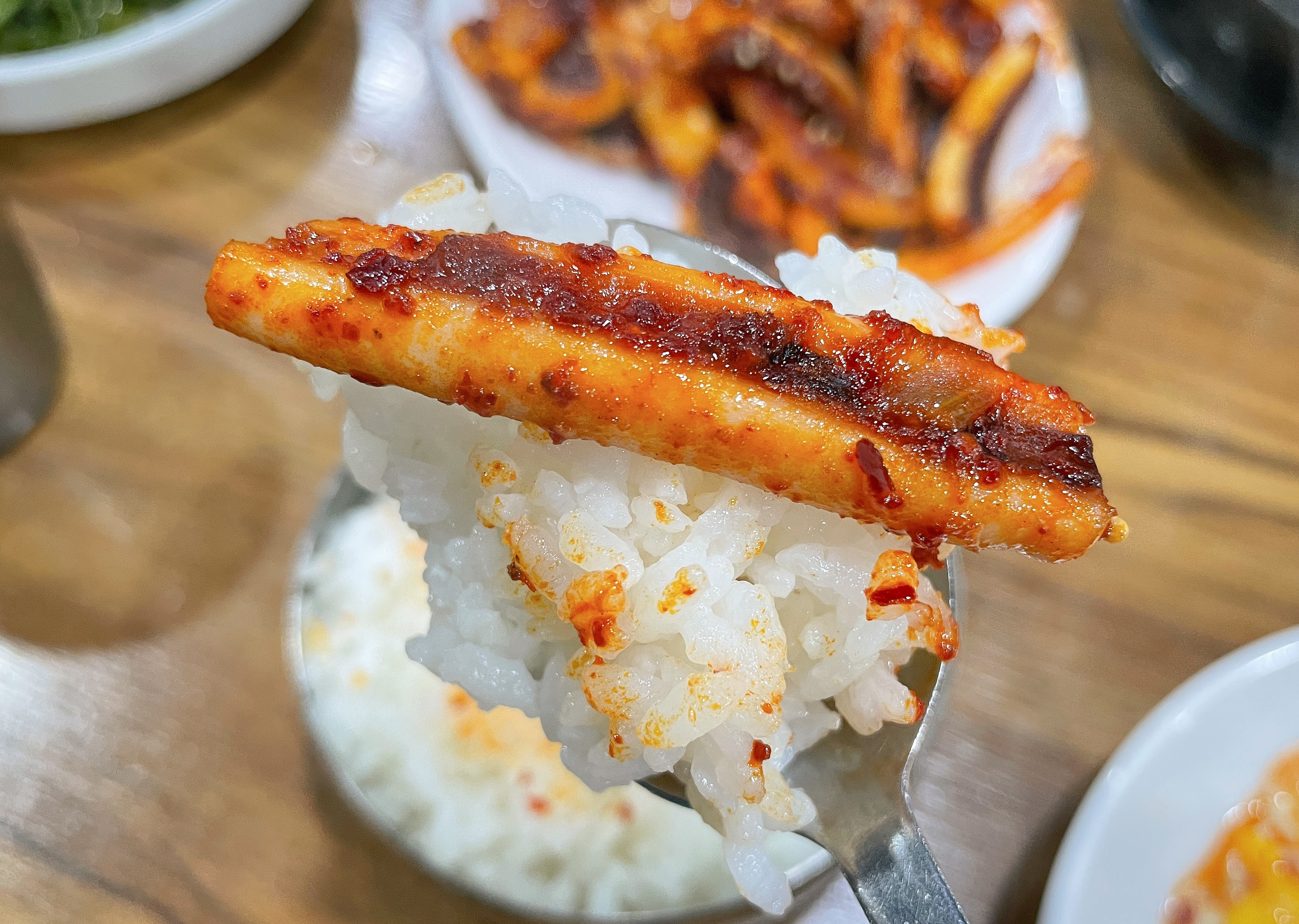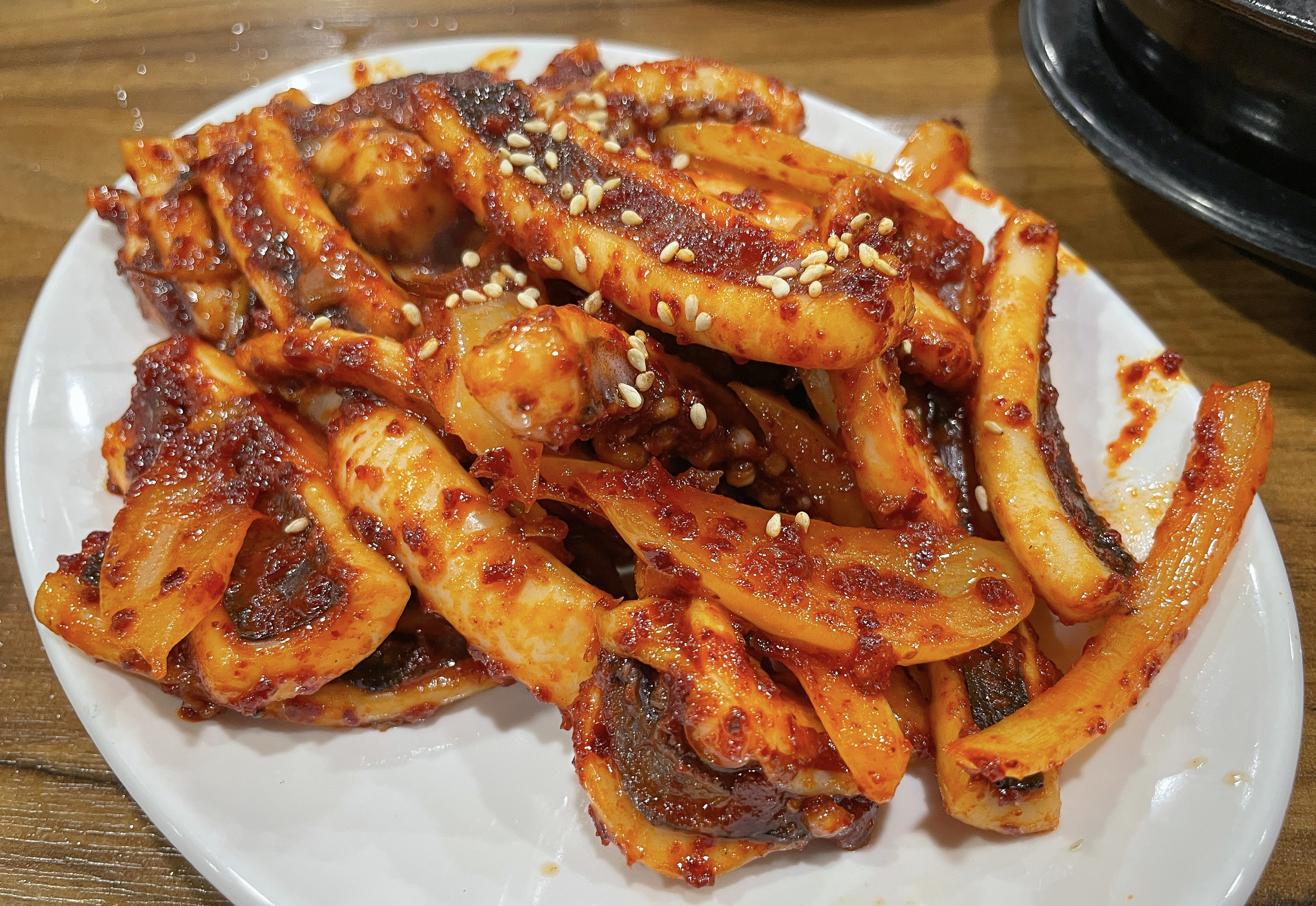 덕수정의 오징어볶음은 원래는 불판 위에 각종 채소와 함께 볶아먹는 형태였지만, 현재는 미리 볶아내 오는 형태로 바뀐 거라고 하시더라고요. 불판에 볶아먹는 것도 좋겠지만, 미리 볶아져 나오는 오징어볶음은 먹기에 편해서 좋더라고요.