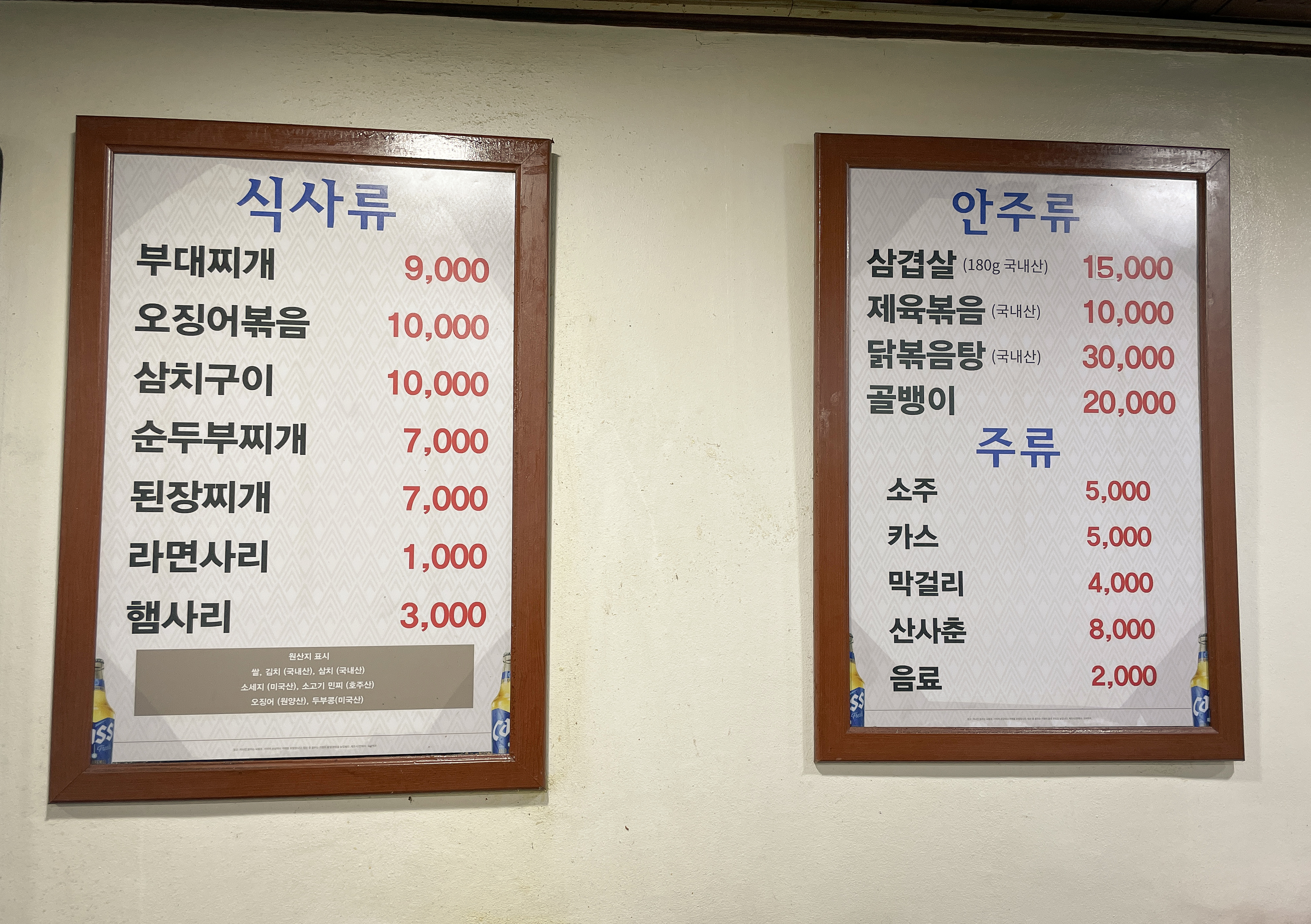 같이 덕수정의 메뉴를 살펴보시죠. 부대찌개, 오징어볶음, 삼치구이, 순두부찌개, 된장찌개, 삼겹살, 제육볶음, 닭볶음탕, 골뱅이 등이 있었고, 이 가게의 메인 메뉴인 부대찌개와 오징어볶음은 거의 한 테이블당 하나씩 주문하는 것 같았습니다. 저는 점심에 먹은 메뉴가 소화가 덜 된 상태라 오징어볶음과 순두부찌개로 주문했습니다.