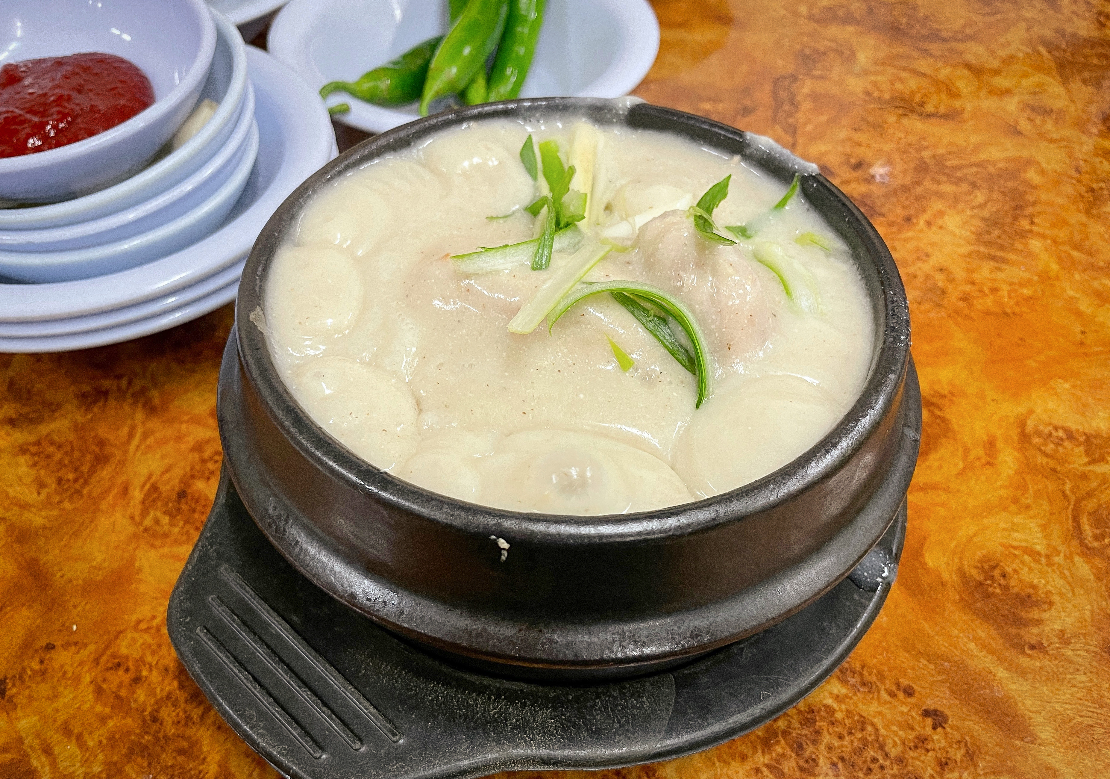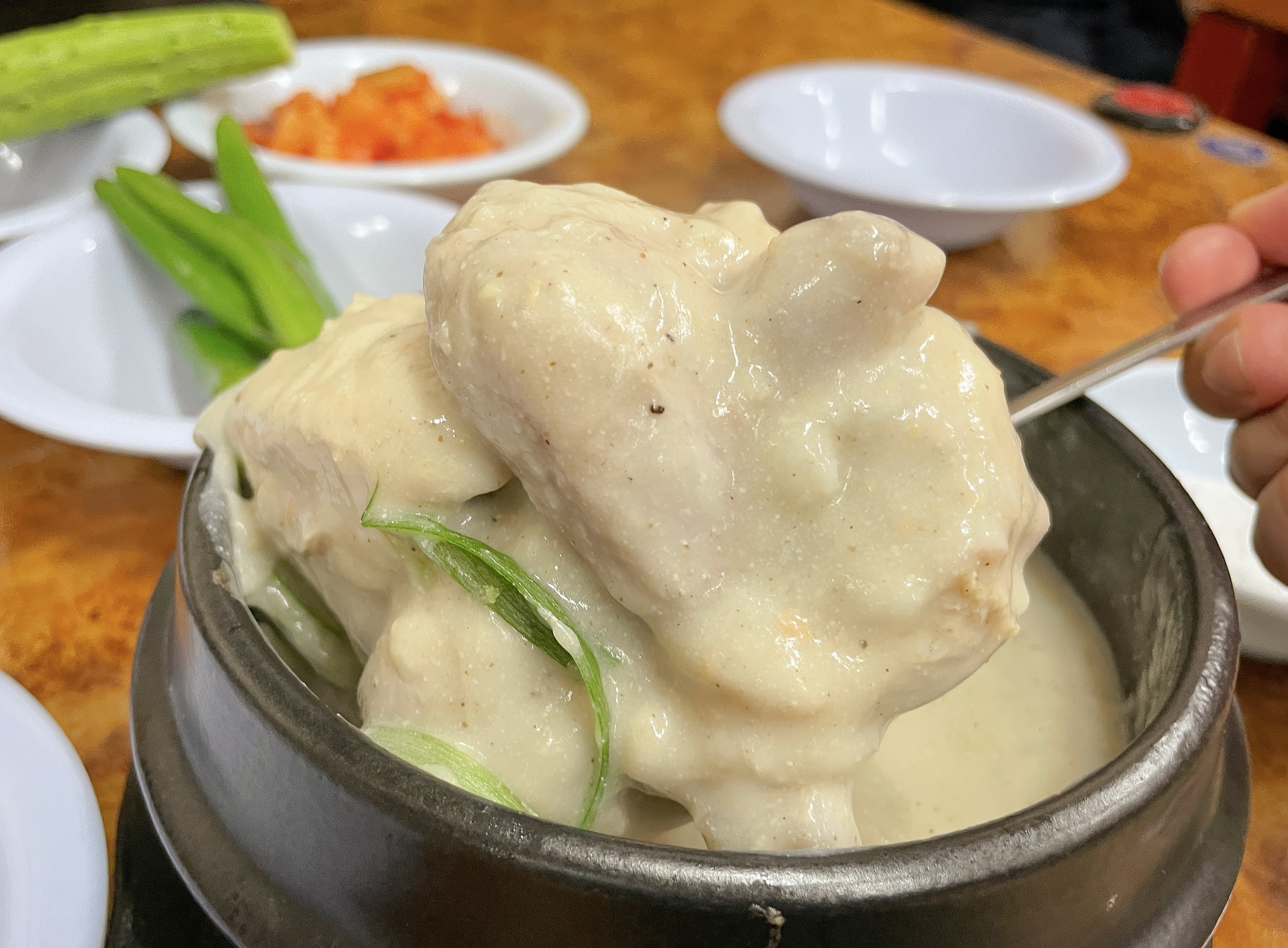 곧이어 주문한 원조호수삼계탕의 삼계탕이 나왔습니다. 삼계탕은 마치 용암이 끓듯이 끓고 있었고, 겉으로 보기에도 국물이 일반 삼계탕과는 차원이 다른 걸쭉함을 느낄 수 있었습니다. 반찬으로는 고추와 깍두기, 오이, 마늘이 나왔고, 오이와 찍어먹는 고추장도 달짝지근한 것이 맛있더라고요.