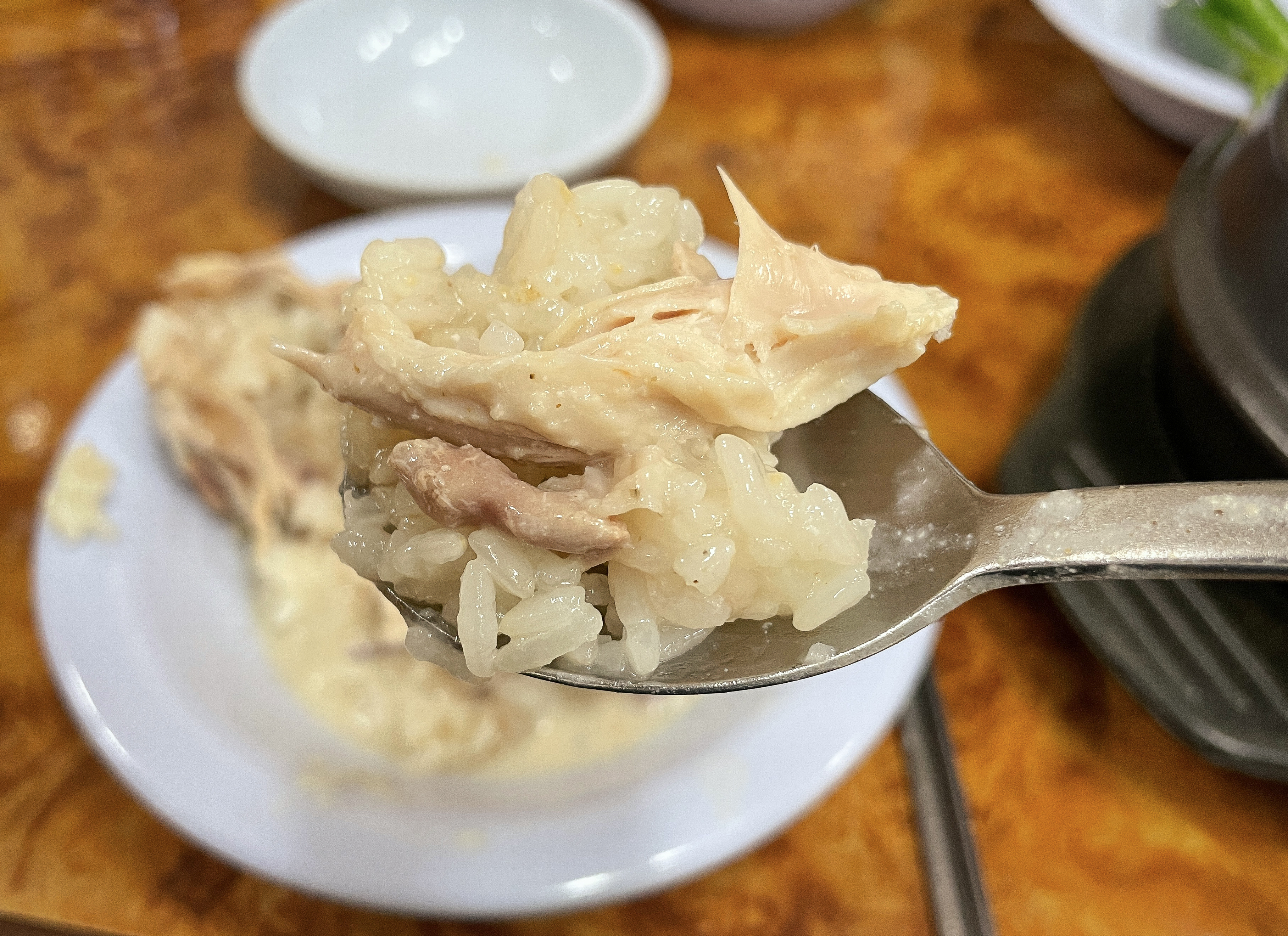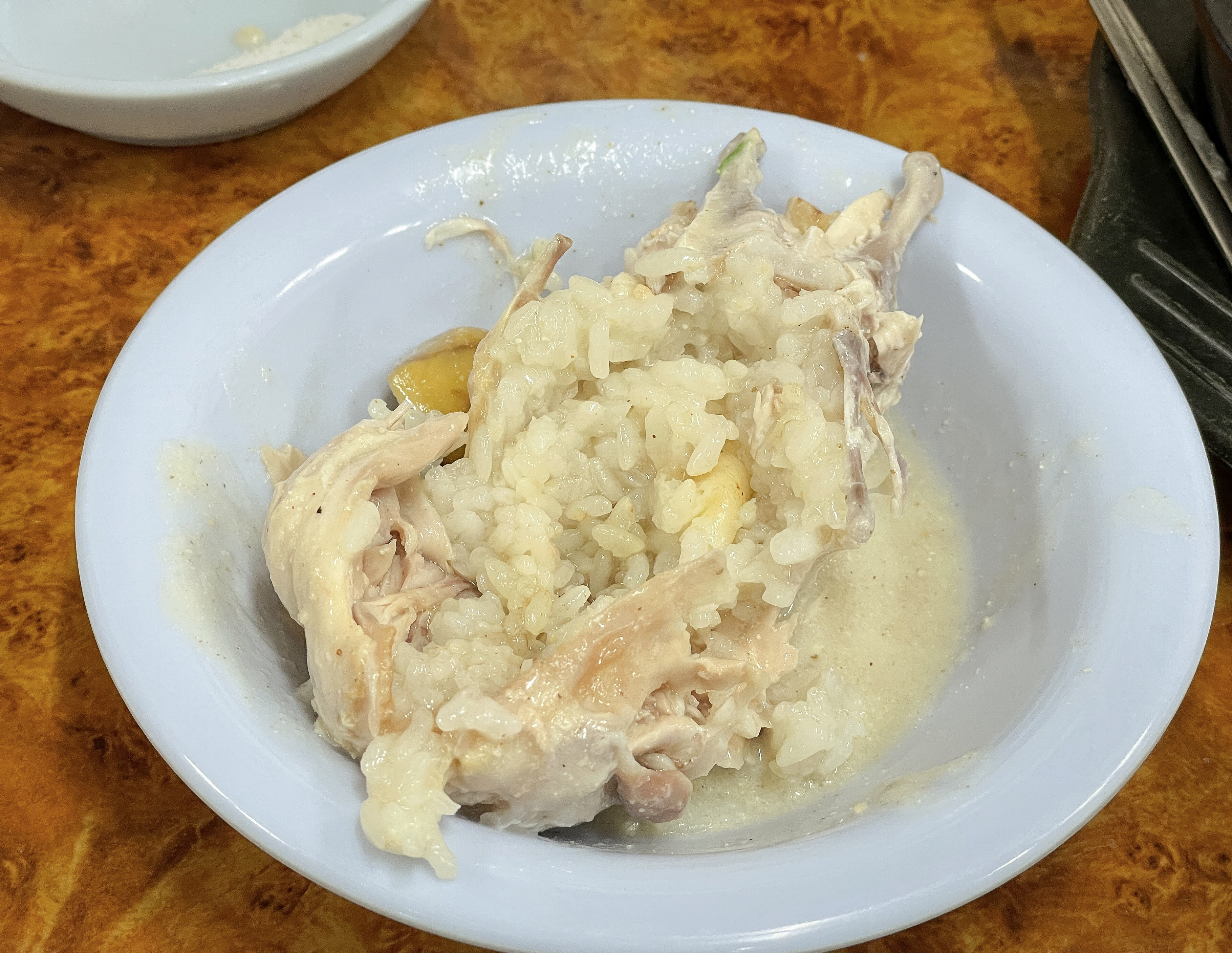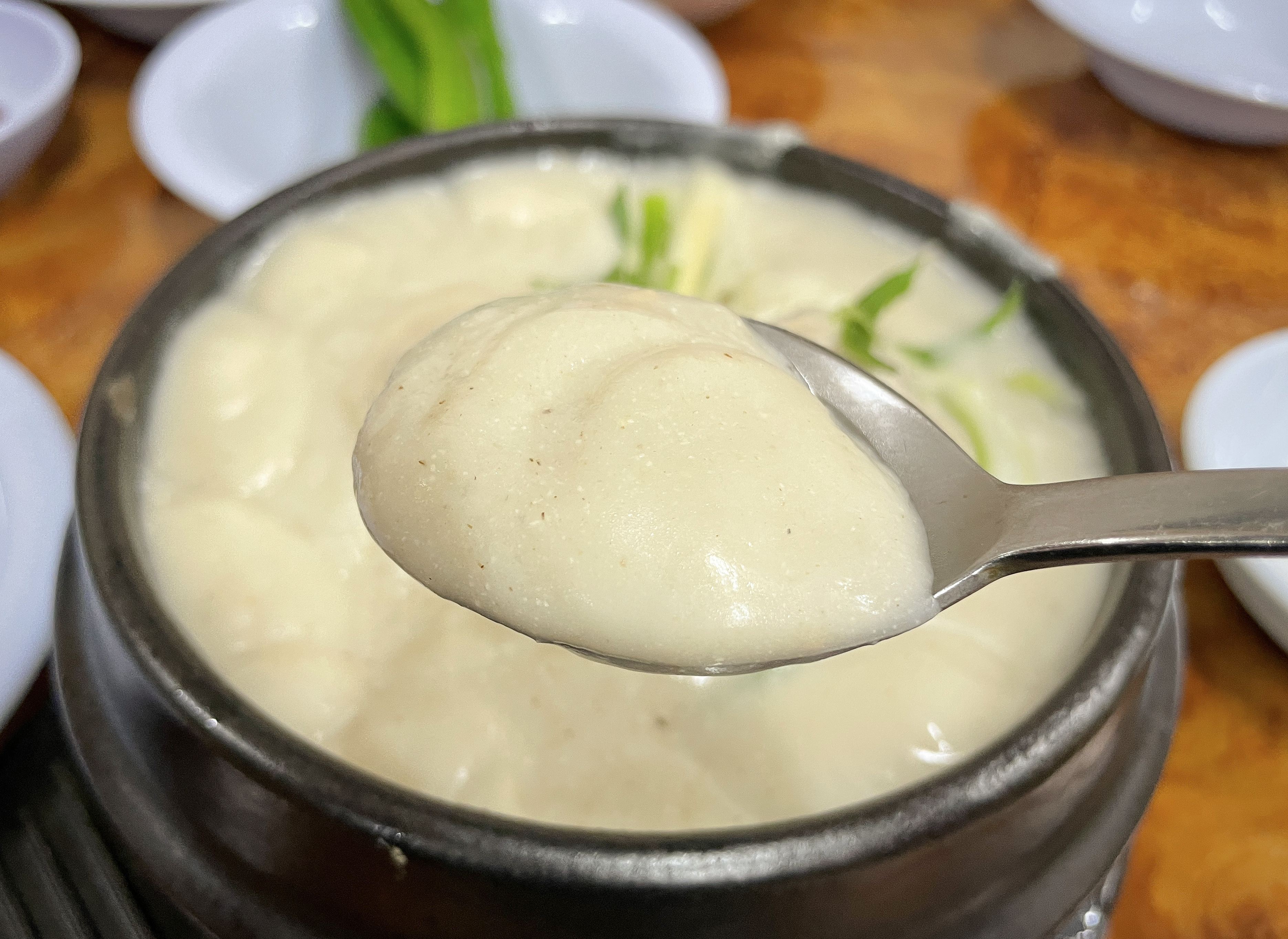 닭고기에는 밥과 인삼, 대추 등이 들어있었고, 닭고기는 잘 삶아져서 그런지 부드럽게 살코기가 발라졌습니다. 국물은 앞서 말한 것과 같이 걸쭉했고 들깨가루가 들어간 스프를 먹는 느낌이었습니다. 저는 사실 닭곰탕처럼 닭으로만 걸쭉하게 우려낸 삼계탕을 기대했는데, 들깨 맛이 더 강한 국물이라 조금 아쉬웠습니다.