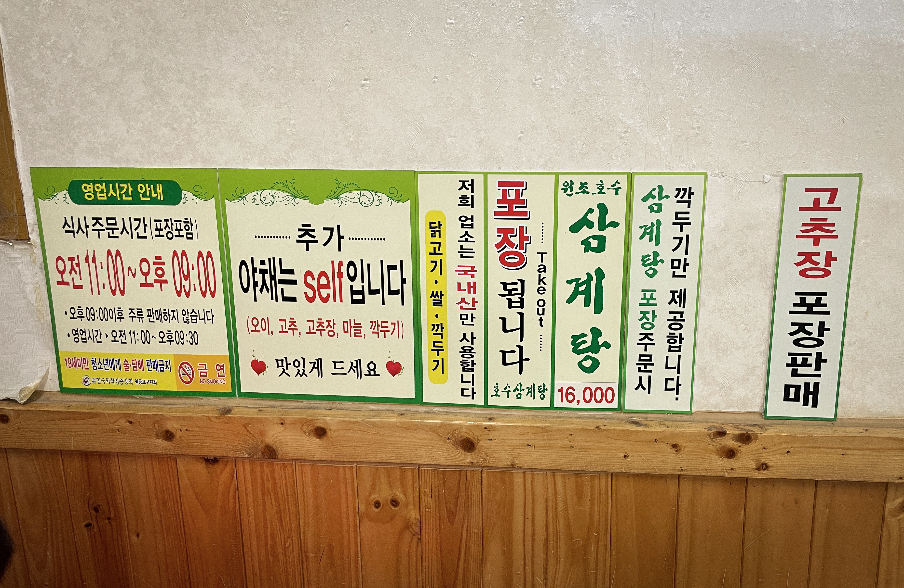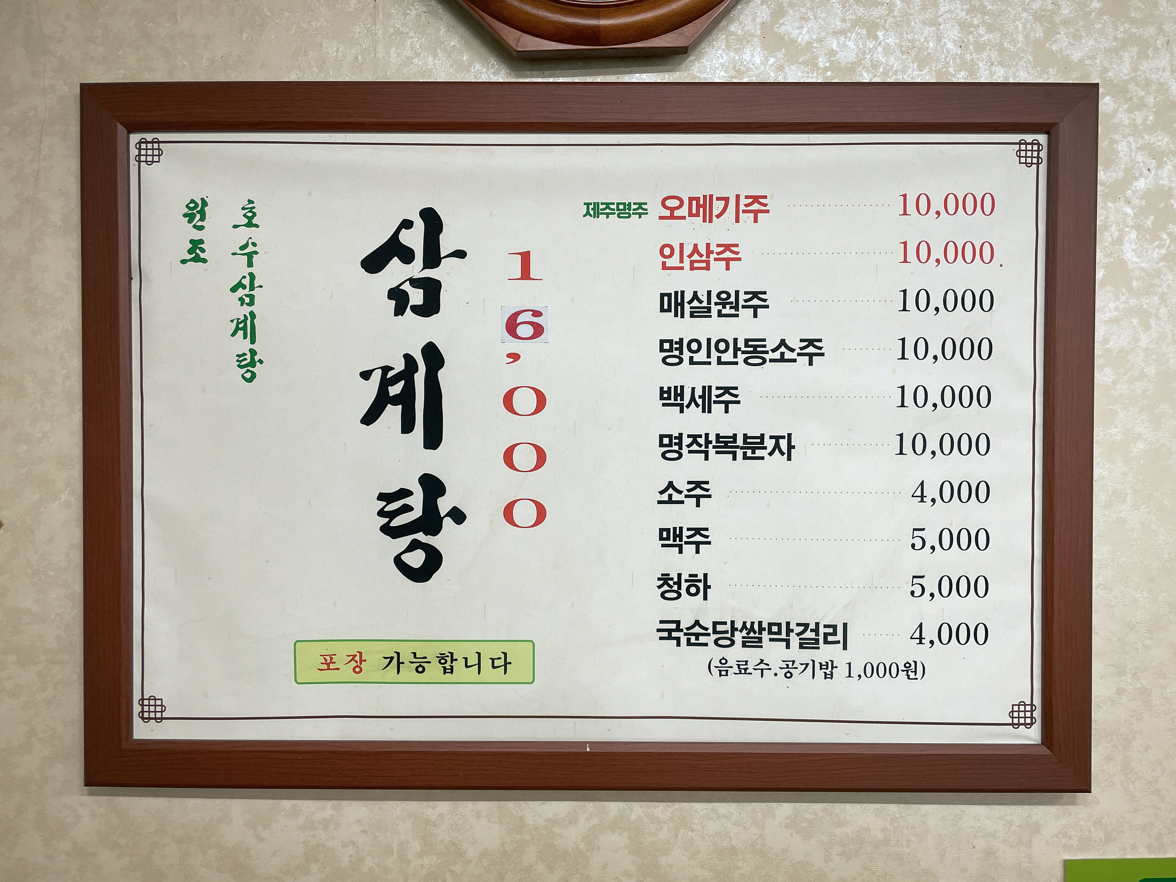 삼계탕의 가격은 1인 16,000원(2022.05. 기준)으로 꽤 있는 편입니다. 닭고기와 쌀, 깍두기까지 모두 국내산을 사용하고 있었고, 삼계탕 포장 손님도 있었습니다. 저희는 삼계탕 2인분을 주문했습니다.
