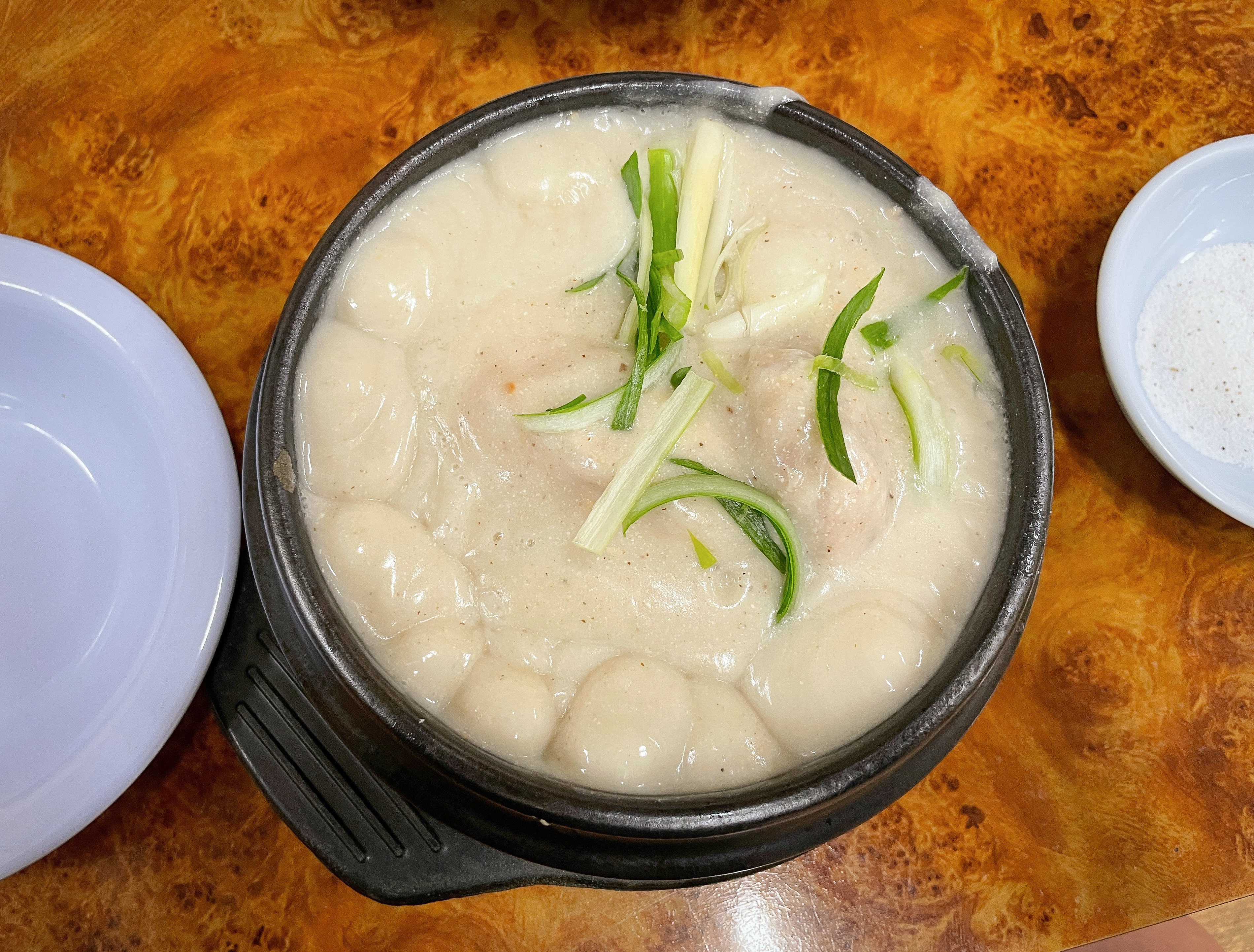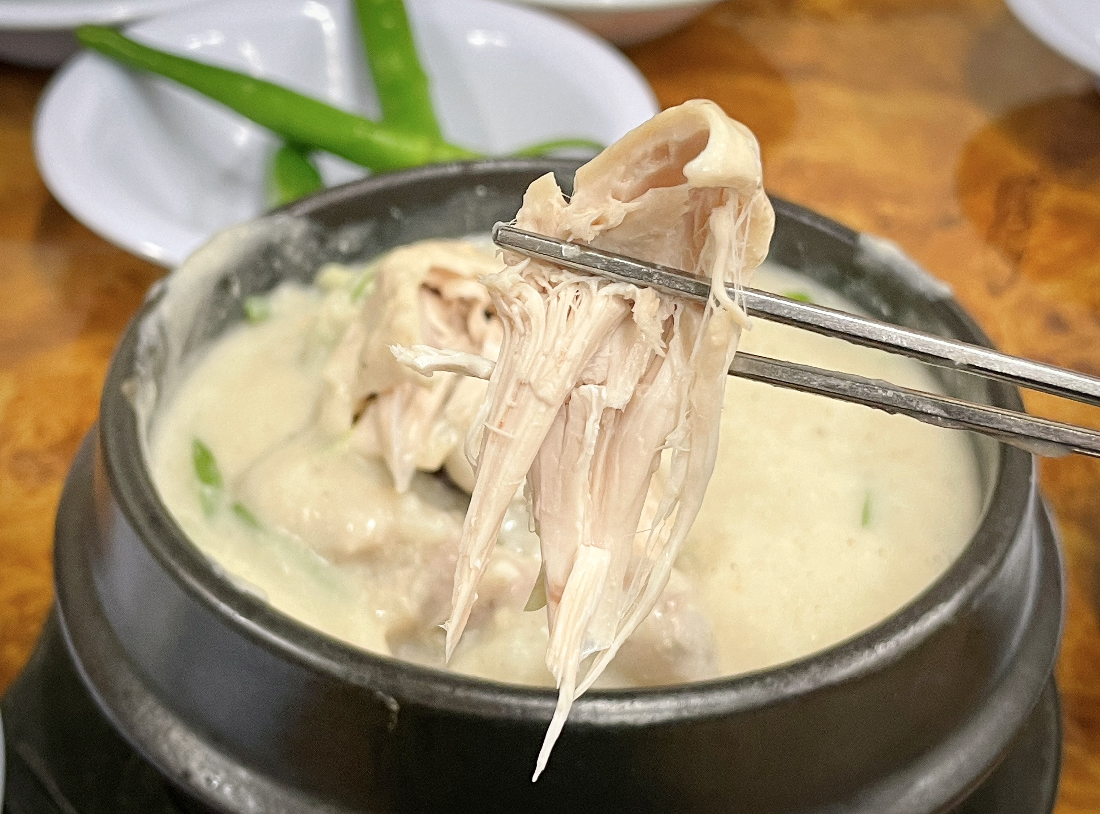 닭고기에는 밥과 인삼, 대추 등이 들어있었고, 닭고기는 잘 삶아져서 그런지 부드럽게 살코기가 발라졌습니다. 국물은 앞서 말한 것과 같이 걸쭉했고 들깨가루가 들어간 스프를 먹는 느낌이었습니다. 저는 사실 닭곰탕처럼 닭으로만 걸쭉하게 우려낸 삼계탕을 기대했는데, 들깨 맛이 더 강한 국물이라 조금 아쉬웠습니다.