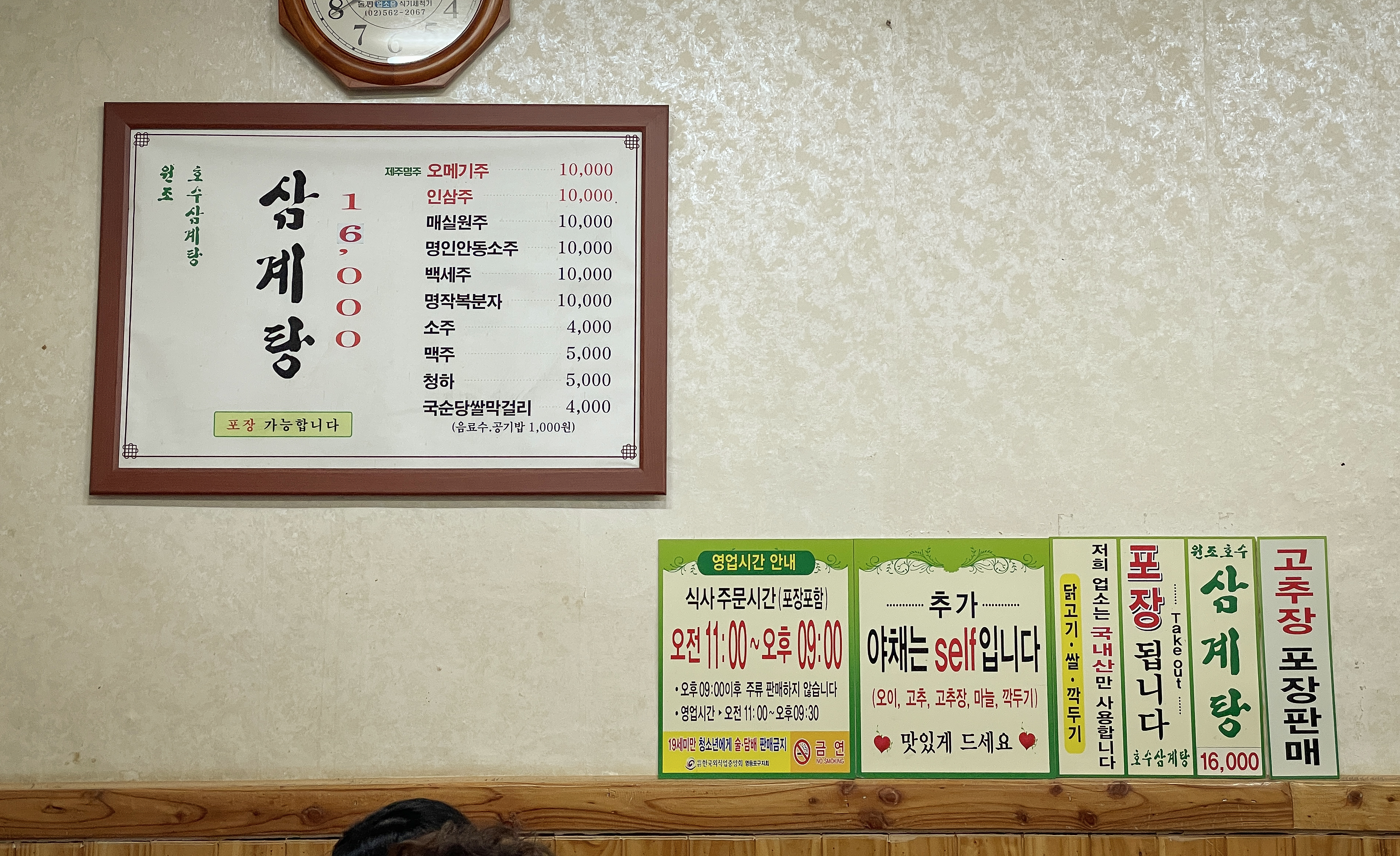 삼계탕의 가격은 1인 16,000원(2022.05. 기준)으로 꽤 있는 편입니다. 닭고기와 쌀, 깍두기까지 모두 국내산을 사용하고 있었고, 삼계탕 포장 손님도 있었습니다. 저희는 삼계탕 2인분을 주문했습니다.