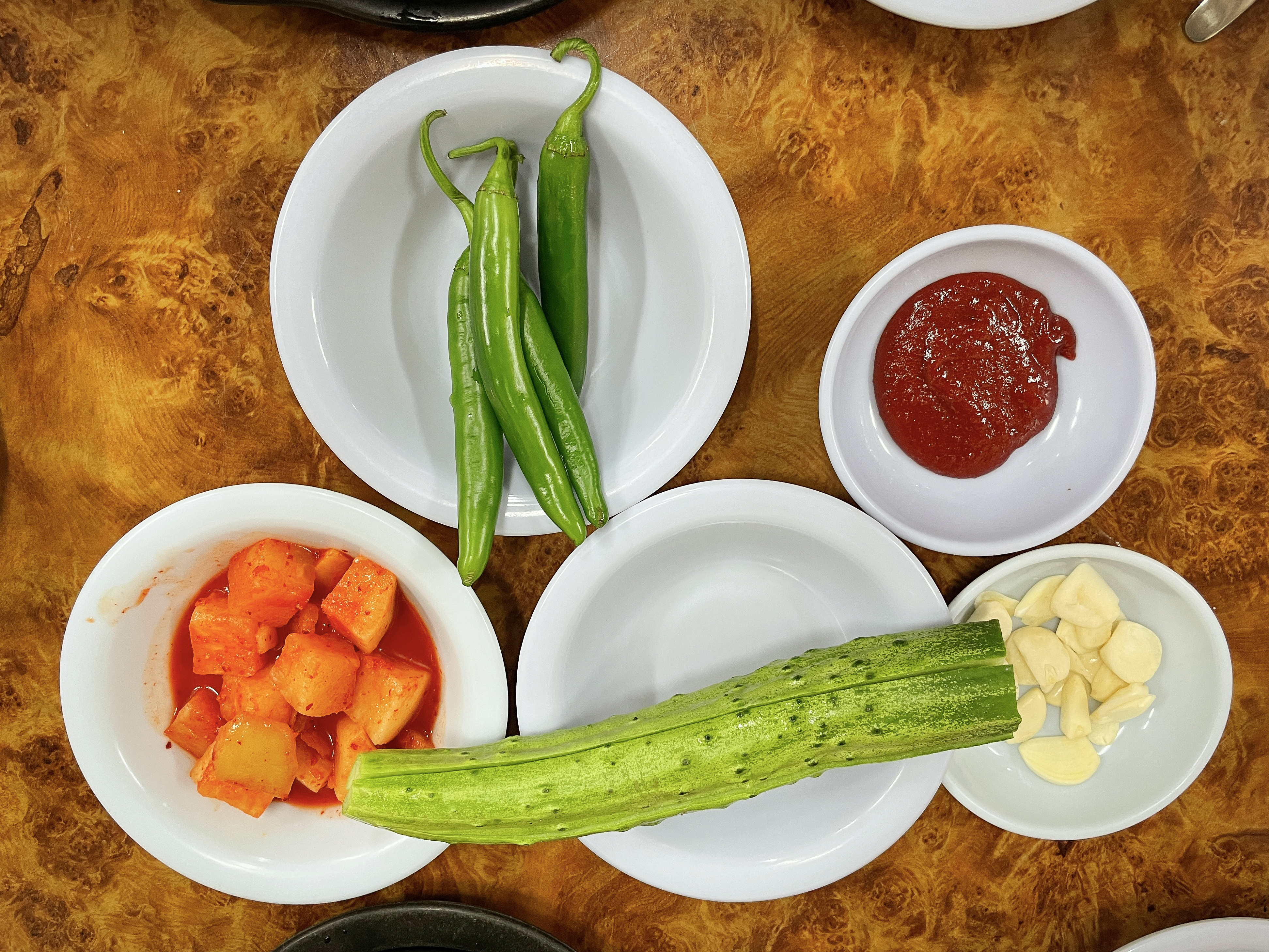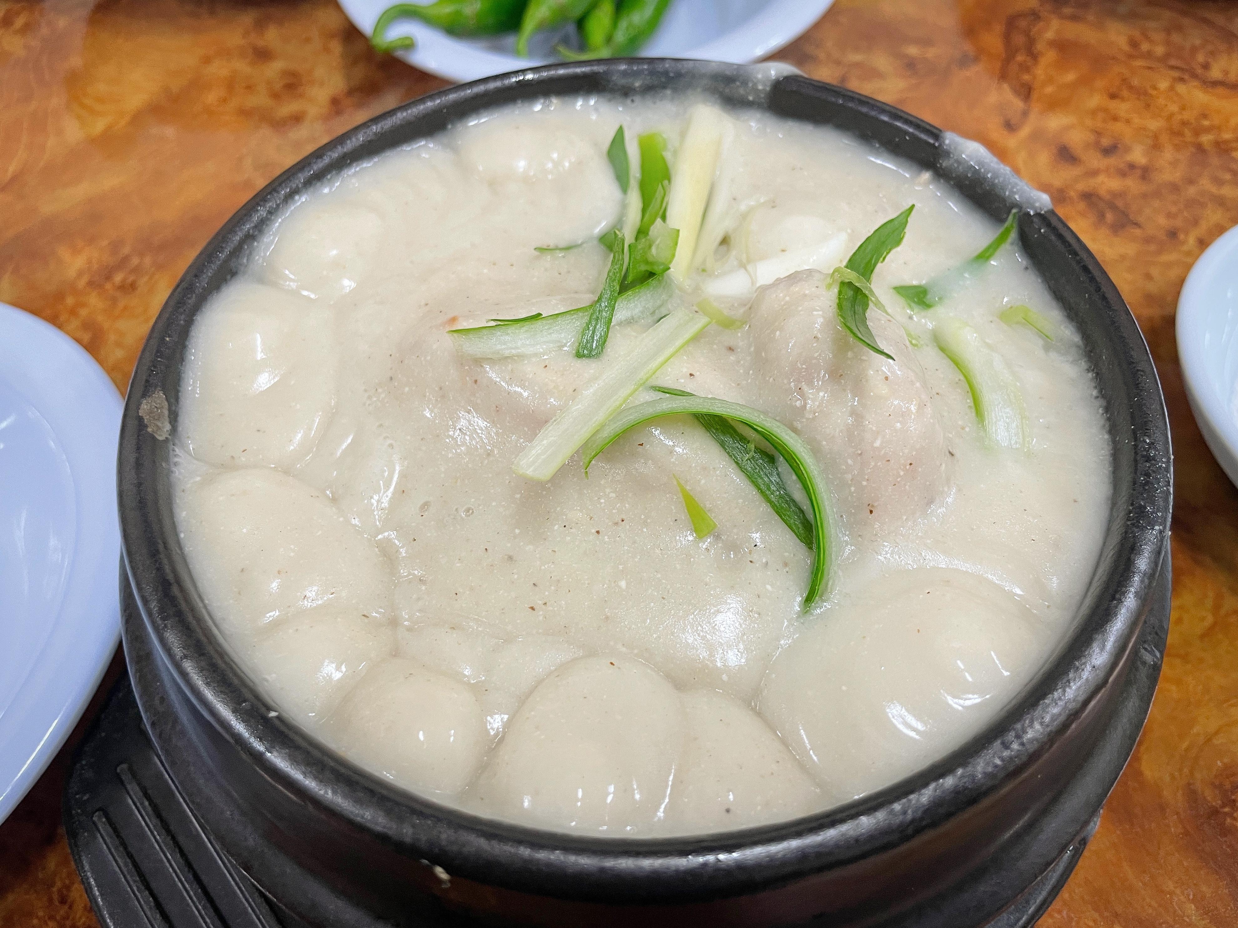 곧이어 주문한 원조호수삼계탕의 삼계탕이 나왔습니다. 삼계탕은 마치 용암이 끓듯이 끓고 있었고, 겉으로 보기에도 국물이 일반 삼계탕과는 차원이 다른 걸쭉함을 느낄 수 있었습니다. 반찬으로는 고추와 깍두기, 오이, 마늘이 나왔고, 오이와 찍어먹는 고추장도 달짝지근한 것이 맛있더라고요.
