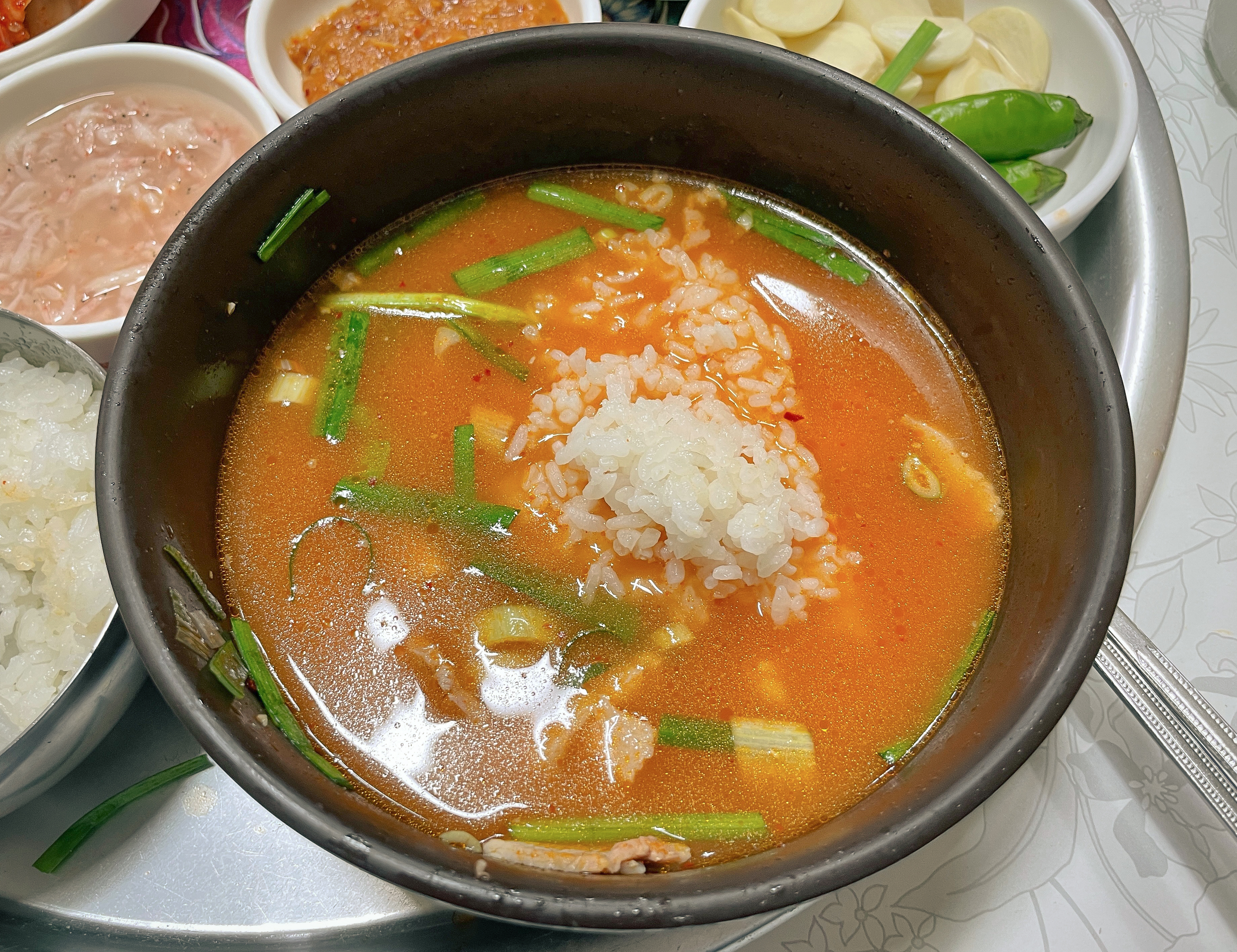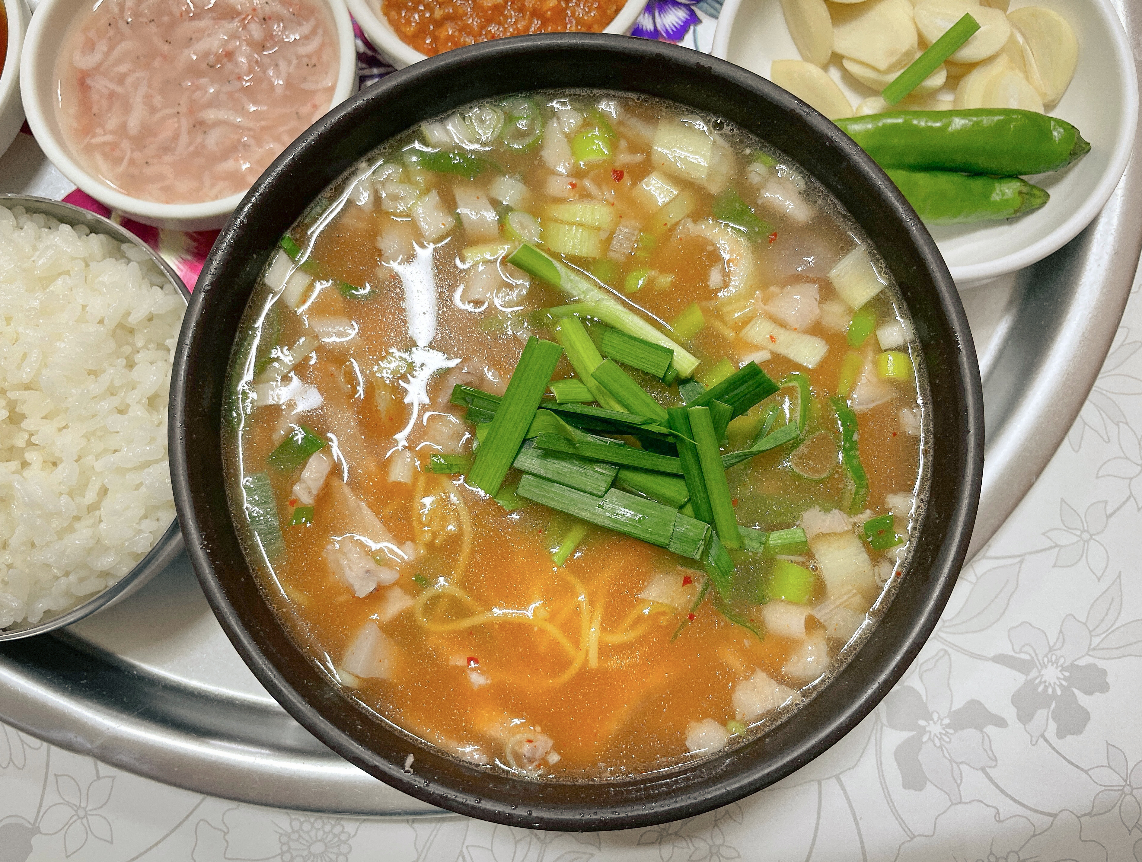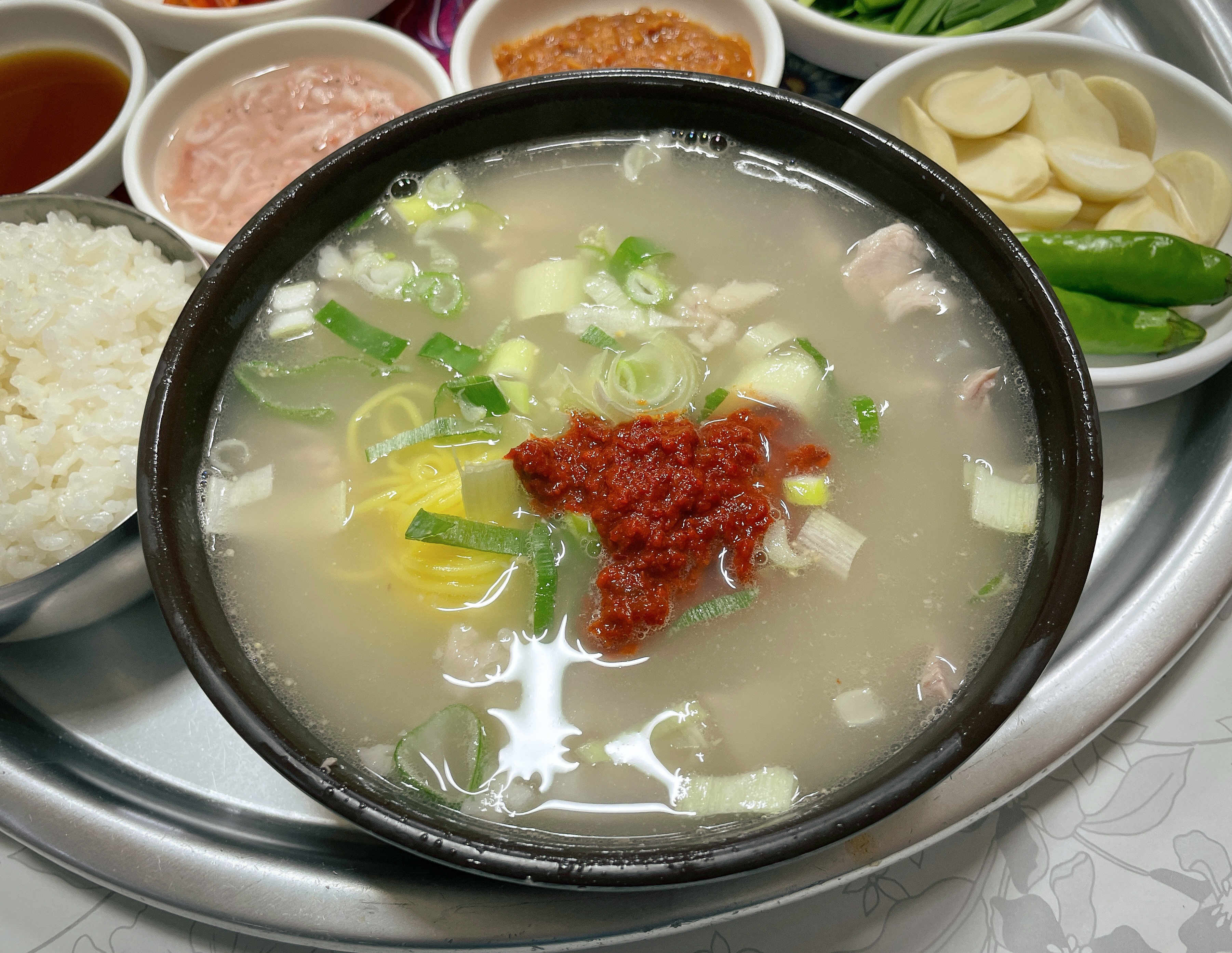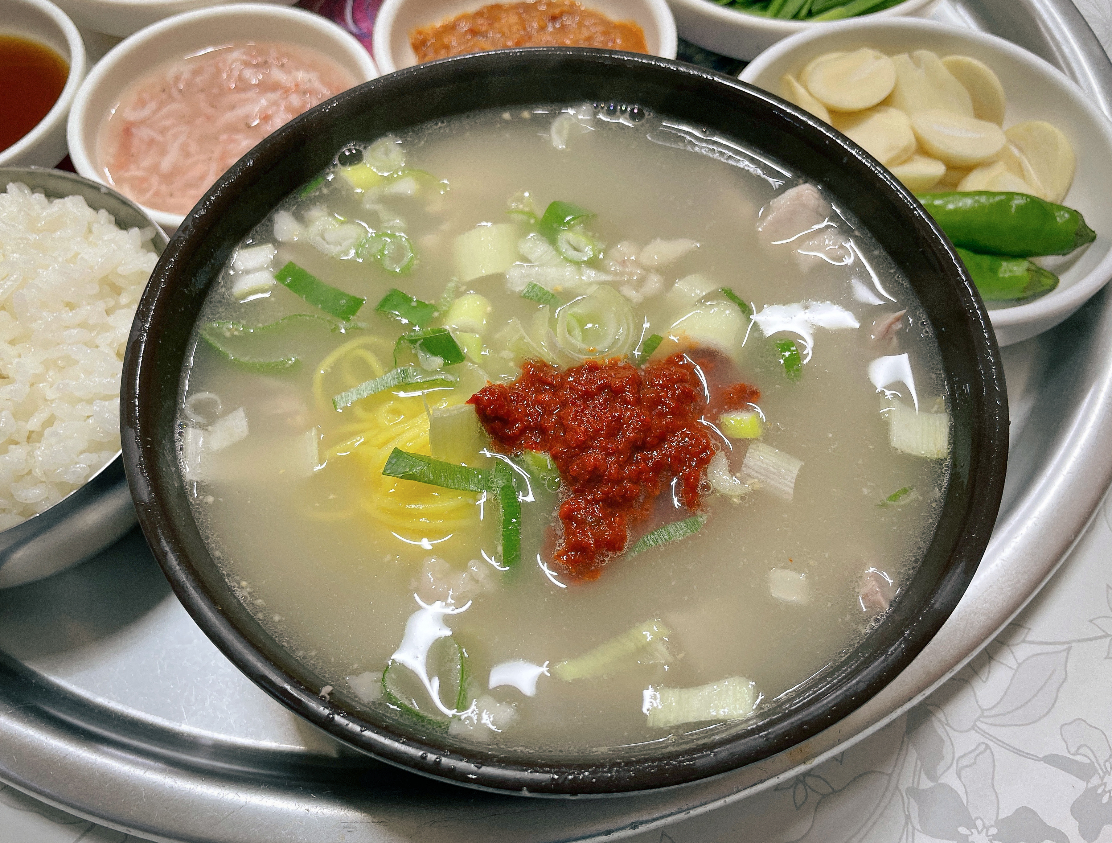 먼저 국물 위의 양념장을 풀어준 다음 소면을 건져먹었습니다. 그다음에 부추를 얹은 다음 국밥을 먹었는데, 돼지고기도 부드러운 편이었고, 군위식당의 국물은 고기 국밥인데 무겁지 않은 깔끔한 느낌이었습니다.