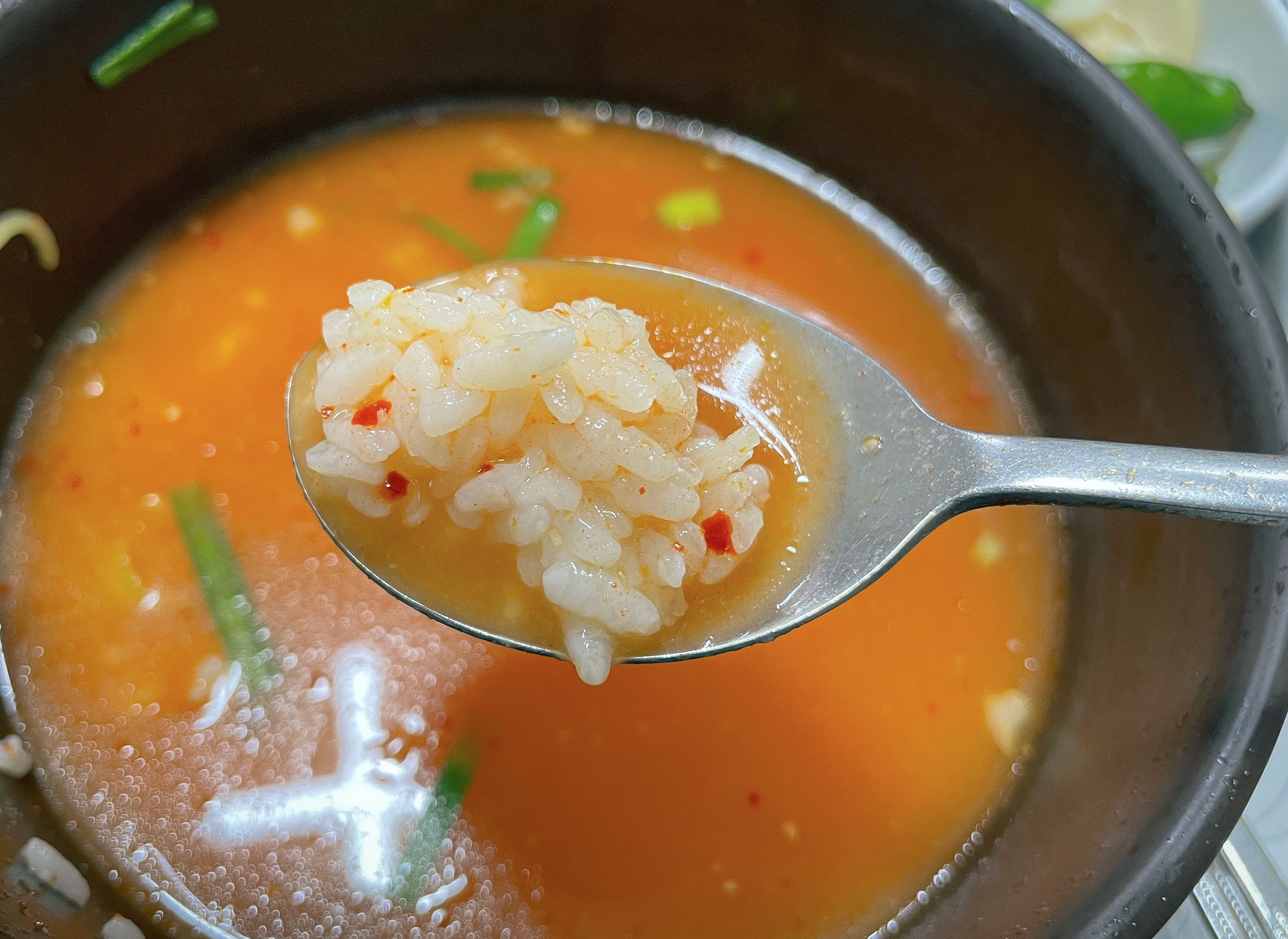 돼지국밥의 돼지고기를 어느 정도 건져먹은 다음, 밥을 국물에 말아서 먹었습니다. 앞서 먹은 소면도 있고 돼지고기도 국밥 안에 많이 들어있어서 속이 꽤 든든하더라고요. 배가 많이 고픈 상태였다면 고기밥을 주문해도 괜찮을 것 같다는 생각이 들었습니다.