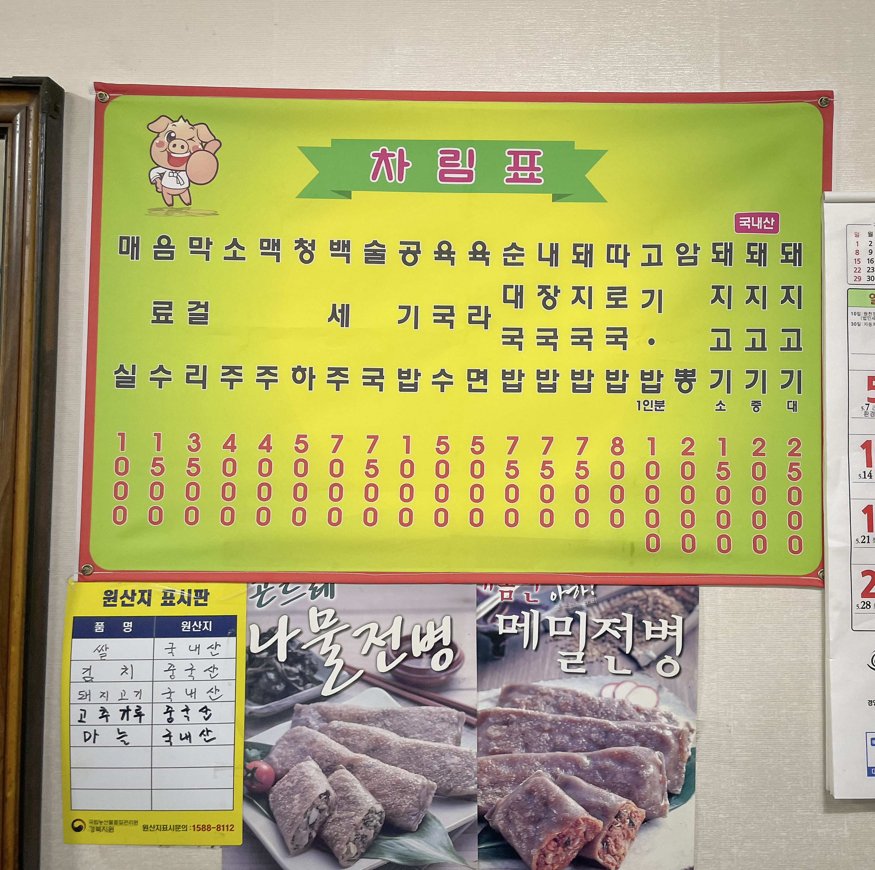 군위식당 가게의 간판을 보니 돼지국밥 50년 전통이라는 문구가 눈에 들어왔고, 메뉴는 술국, 육국수, 육라면, 순대국밥, 내장국밥, 돼지국밥, 따로국밥, 고기밥, 암뽕, 돼지고기가 있었습니다. 원산지 표시를 보니 고춧가루를 제외한 대부분의 재료를 국내산을 사용하는 것을 확인할 수 있었습니다.